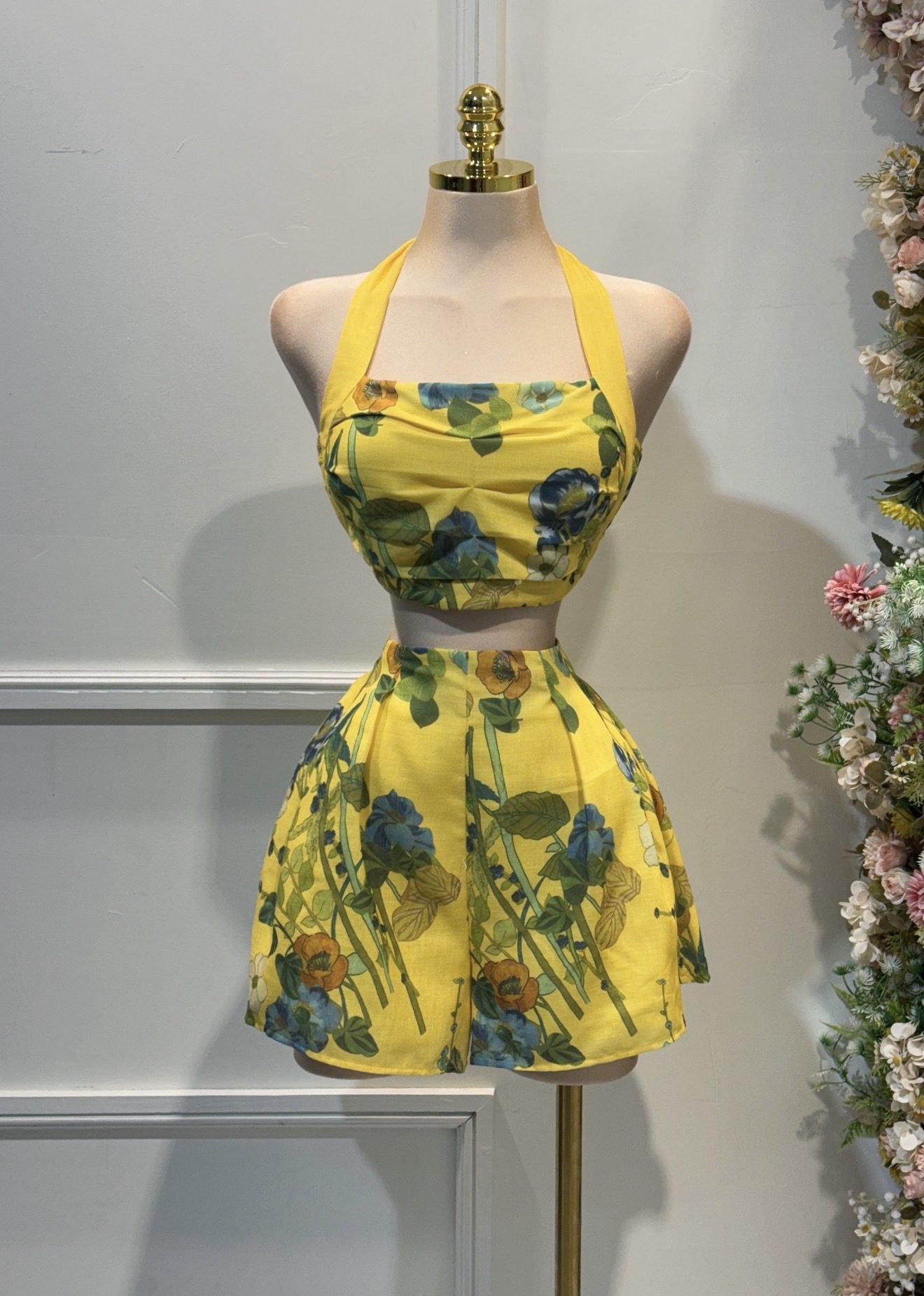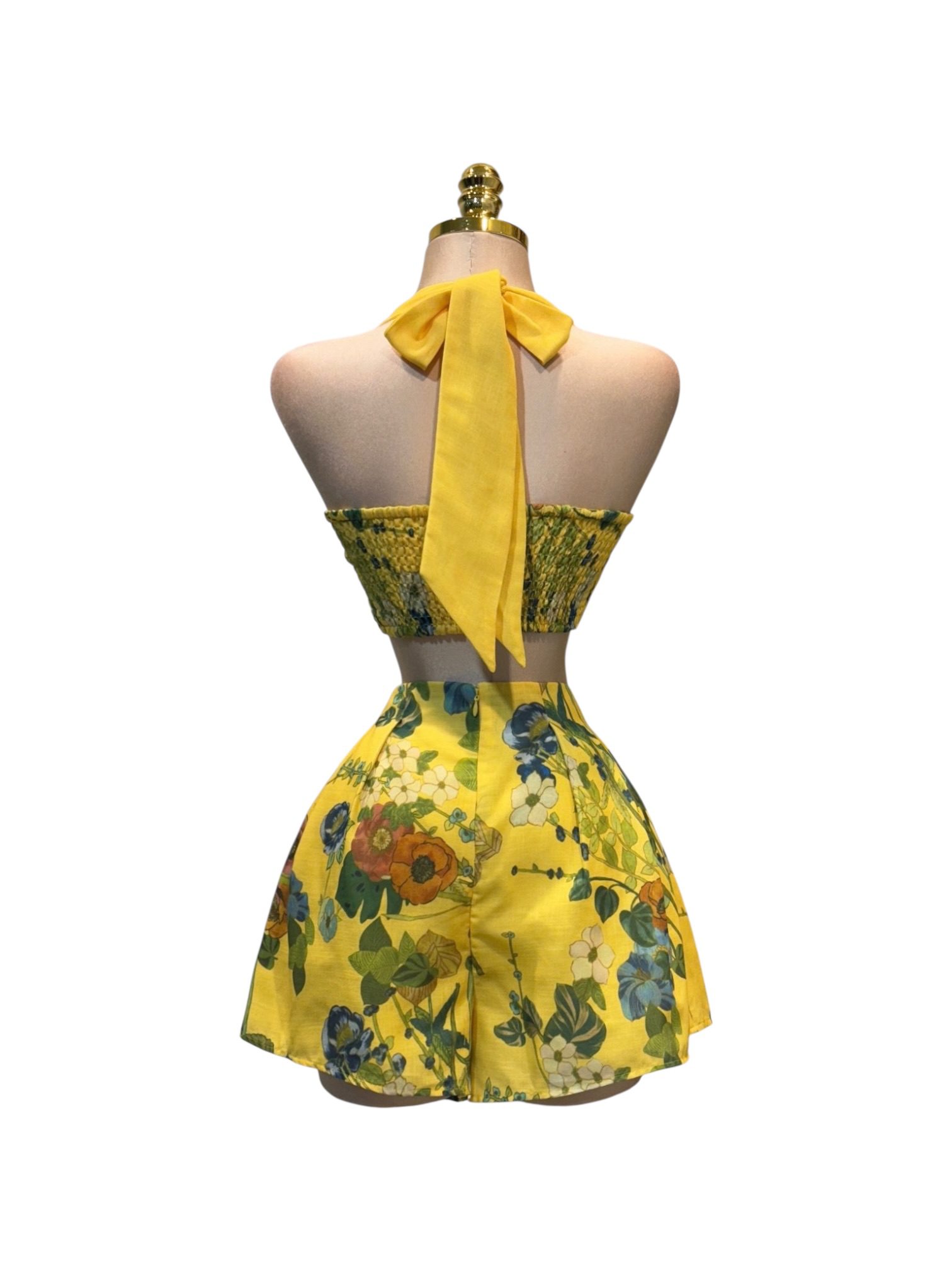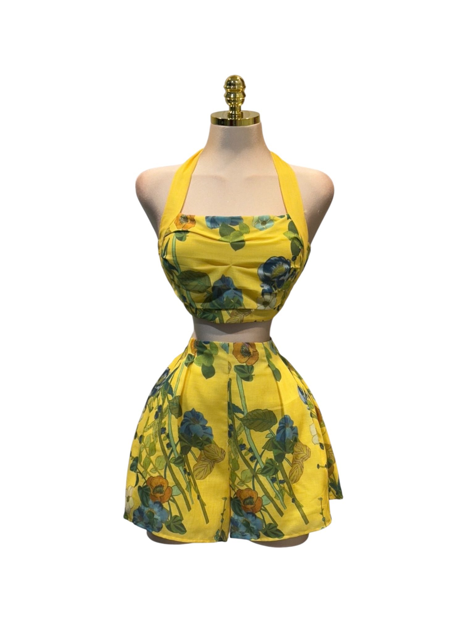 Set de dos piezas con top halter y falda corta de vuelo. Diseño fresco en tono amarillo con estampado floral en contraste. Ideal para eventos de día y looks de verano.