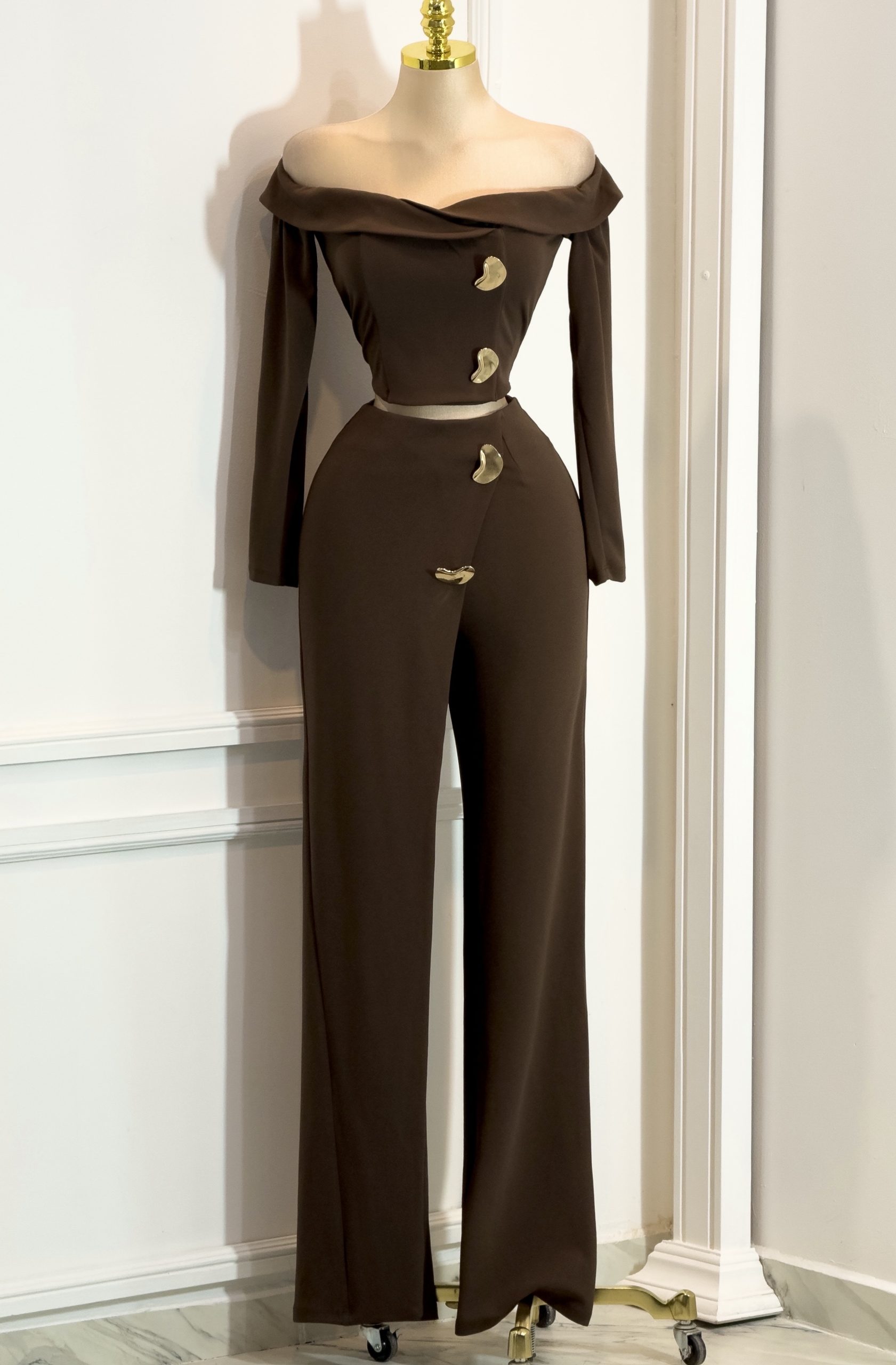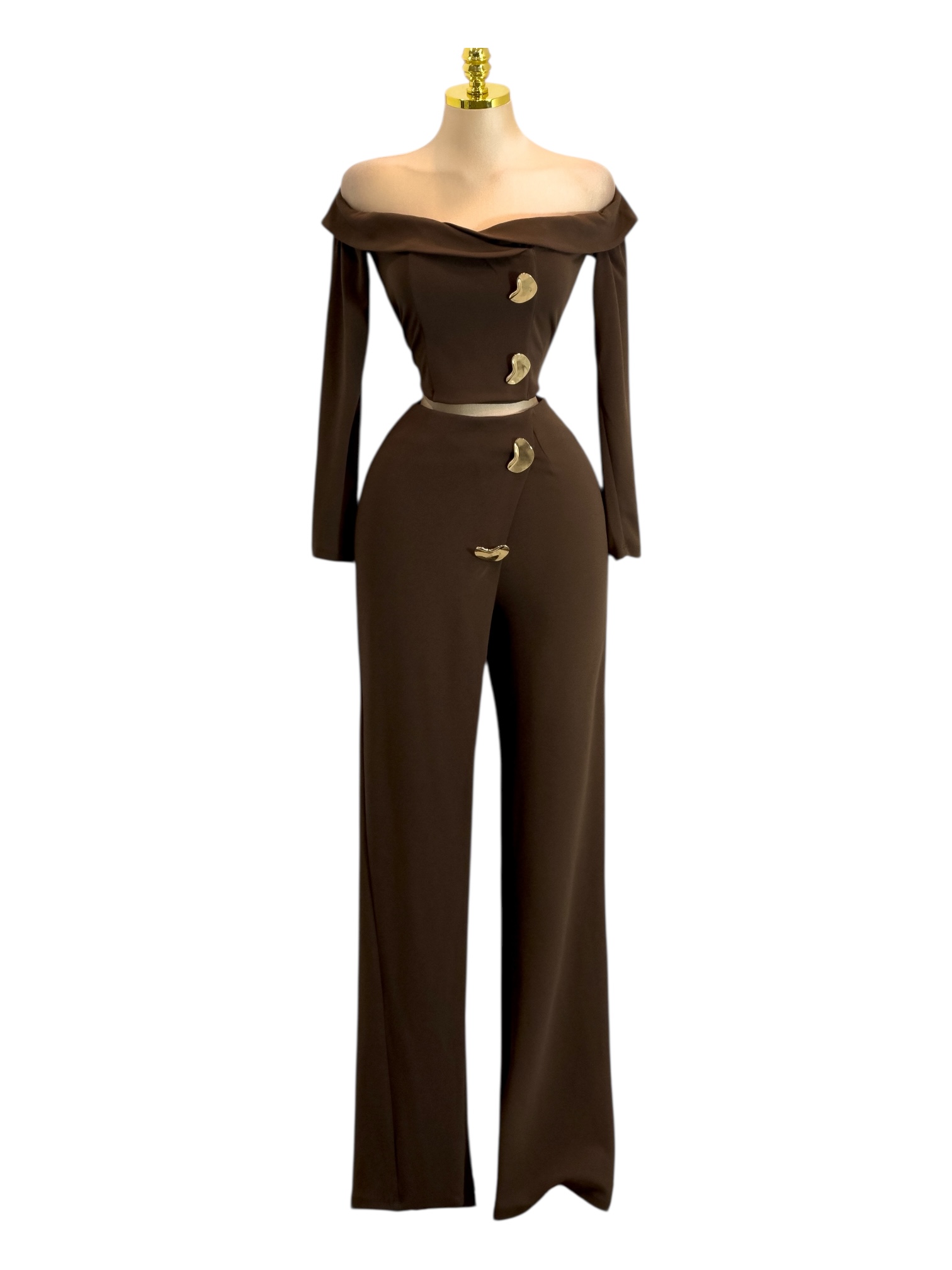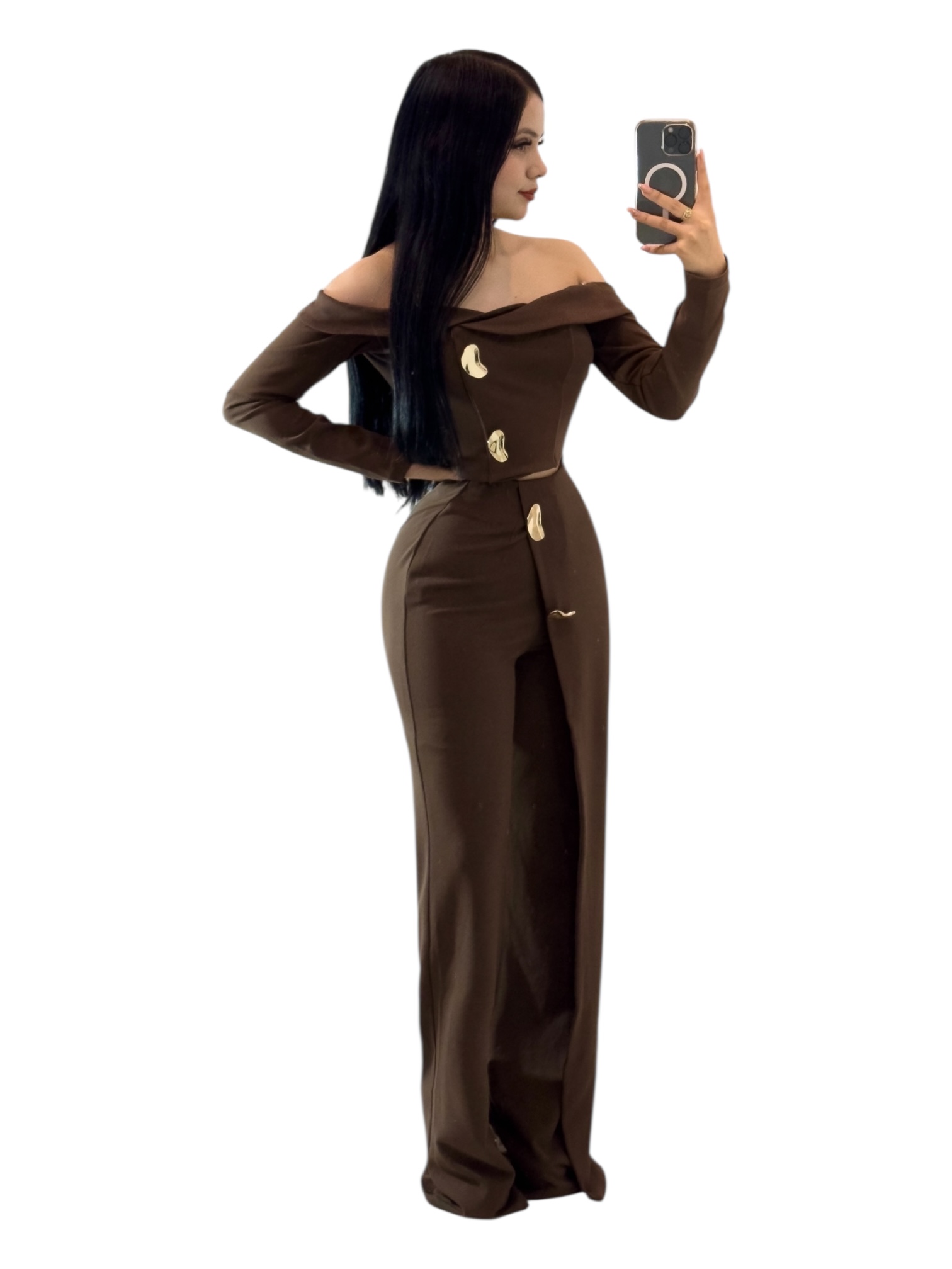 conjunto en tono café con un diseño moderno, elegante y de silueta completamente estilizada. Presenta un escote caído tipo “off shoulder” que realza la parte superior con un acabado sensual y sofisticado. El cuerpo incorpora una hilera de botones metálicos decorativos colocados de manera asimétrica, aportando un toque distintivo y lujoso. La cintura entallada define la figura, mientras que el pantalón de pierna recta y caída fluida alarga visualmente la silueta y ofrece un porte refinado. Ideal para eventos especiales, cenas elegantes o noches donde busques lucir un look distinguido, femenino y de alto impacto visual.