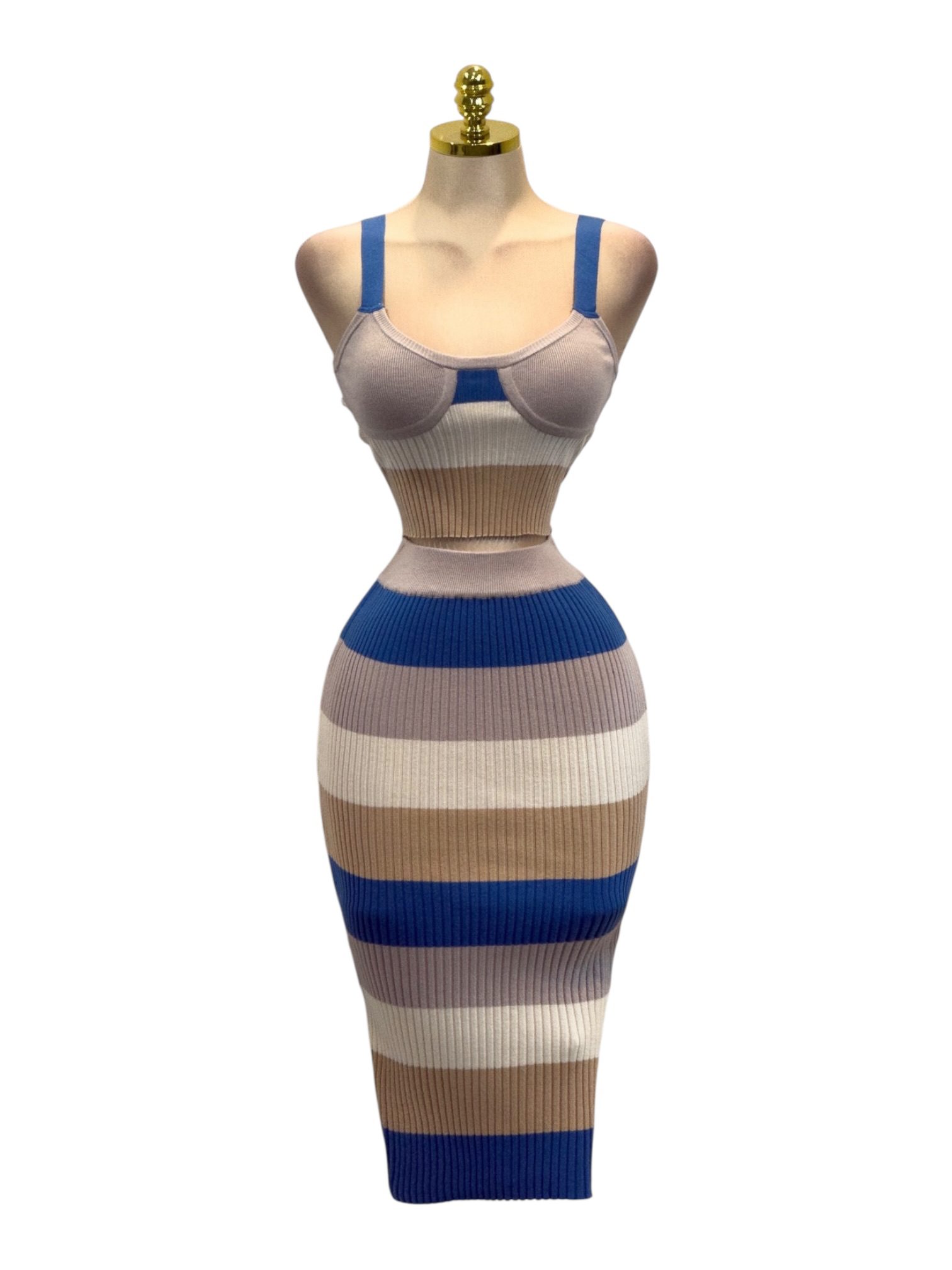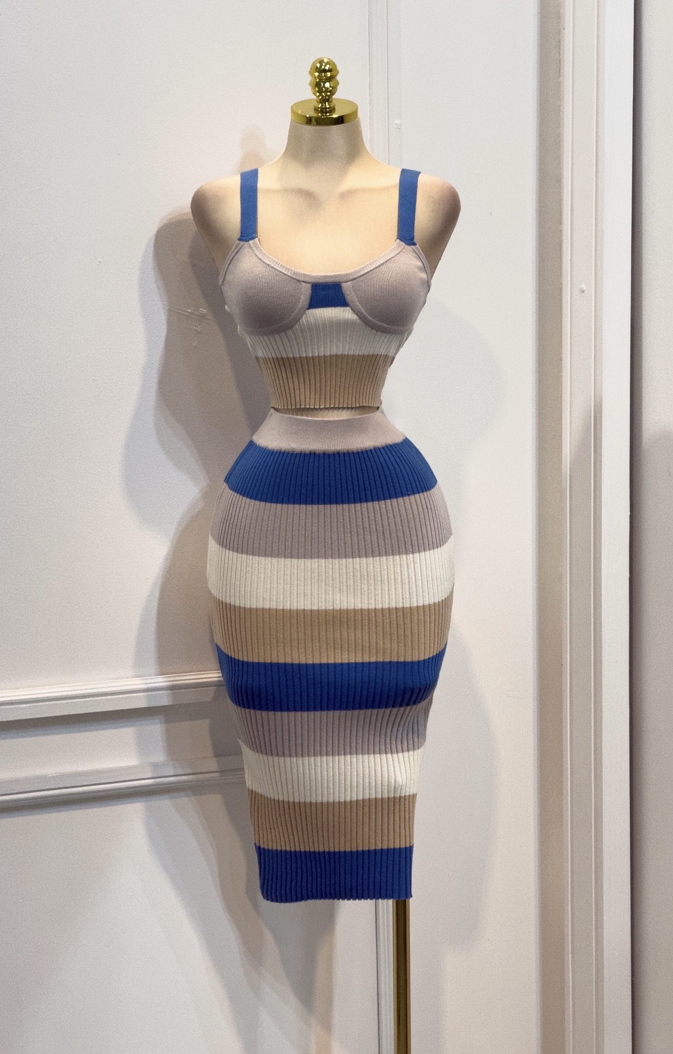 conjunto tejido de dos piezas con diseño moderno y femenino. El conjunto incluye un top corto con tirantes y detalle estructurado en el busto, combinado con una falda ajustada de largo midi. Su patrón de rayas en tonos neutros y azul aporta un estilo elegante y contemporáneo, ideal para looks casuales o salidas especiales.