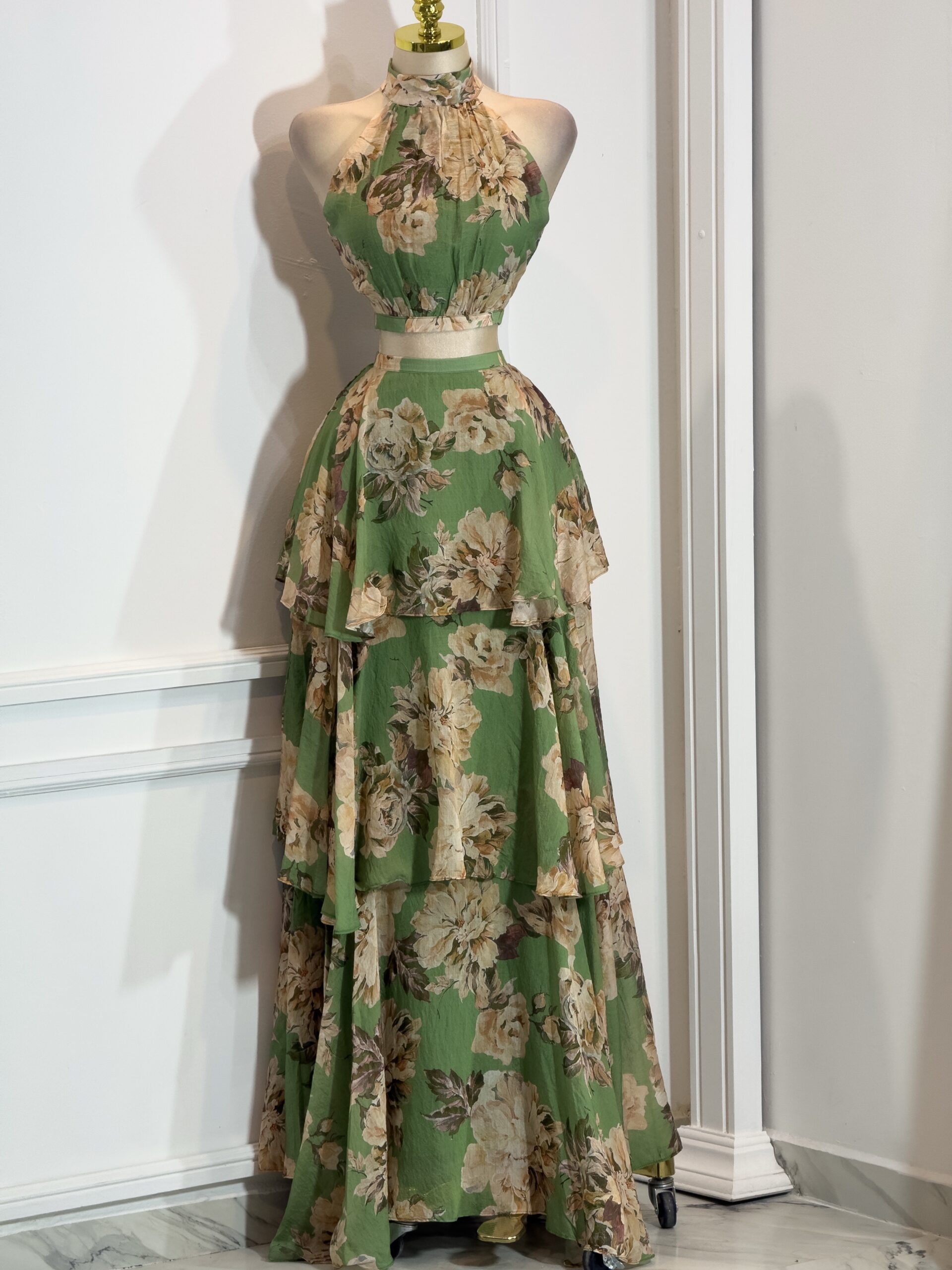 conjunto largo en tono verde con estampado floral. Diseño halter con cuello alto y cut out en cintura, falda en capas con caída fluida. Femenino y elegante, ideal para eventos de día o celebraciones especiales.