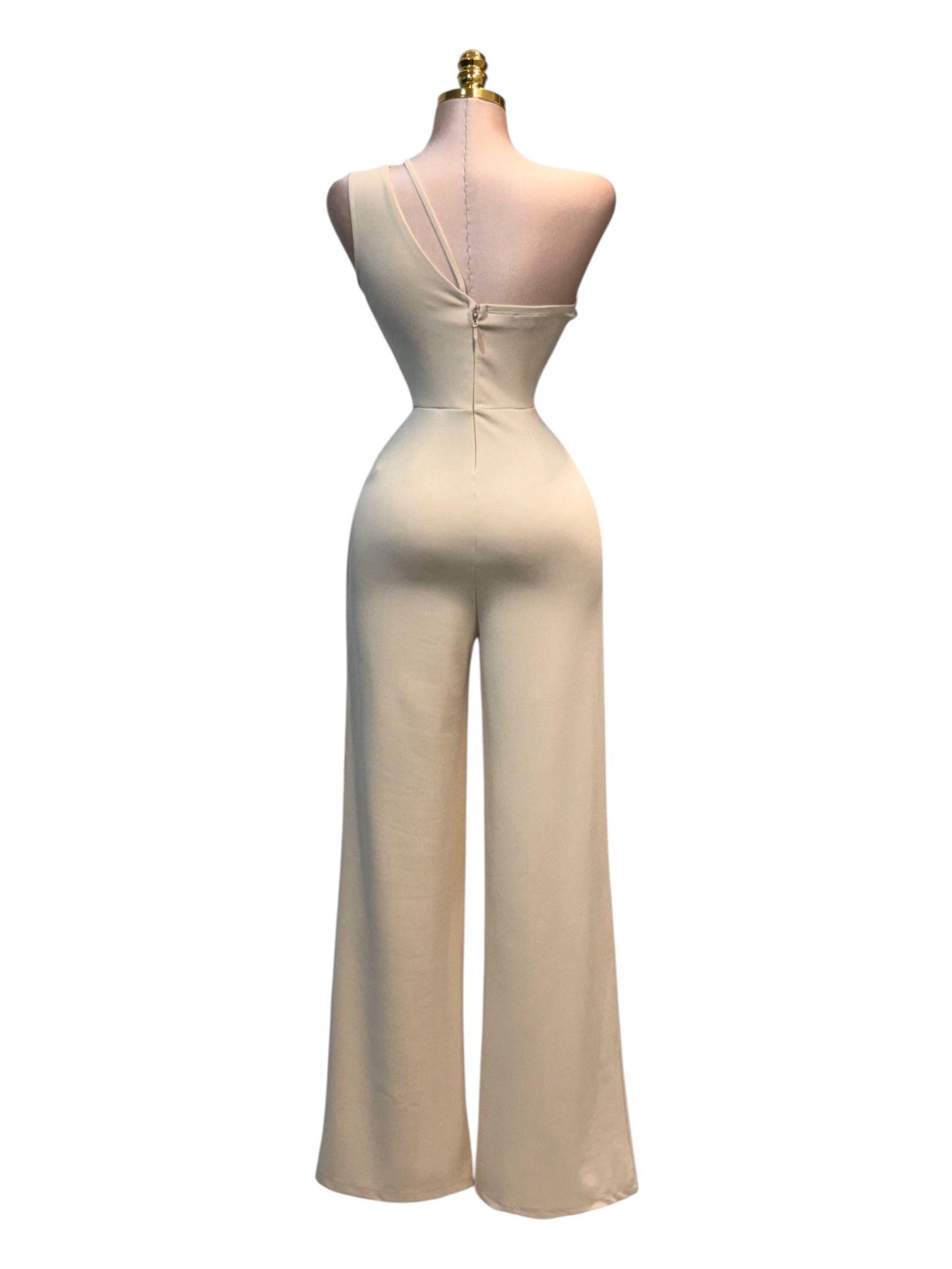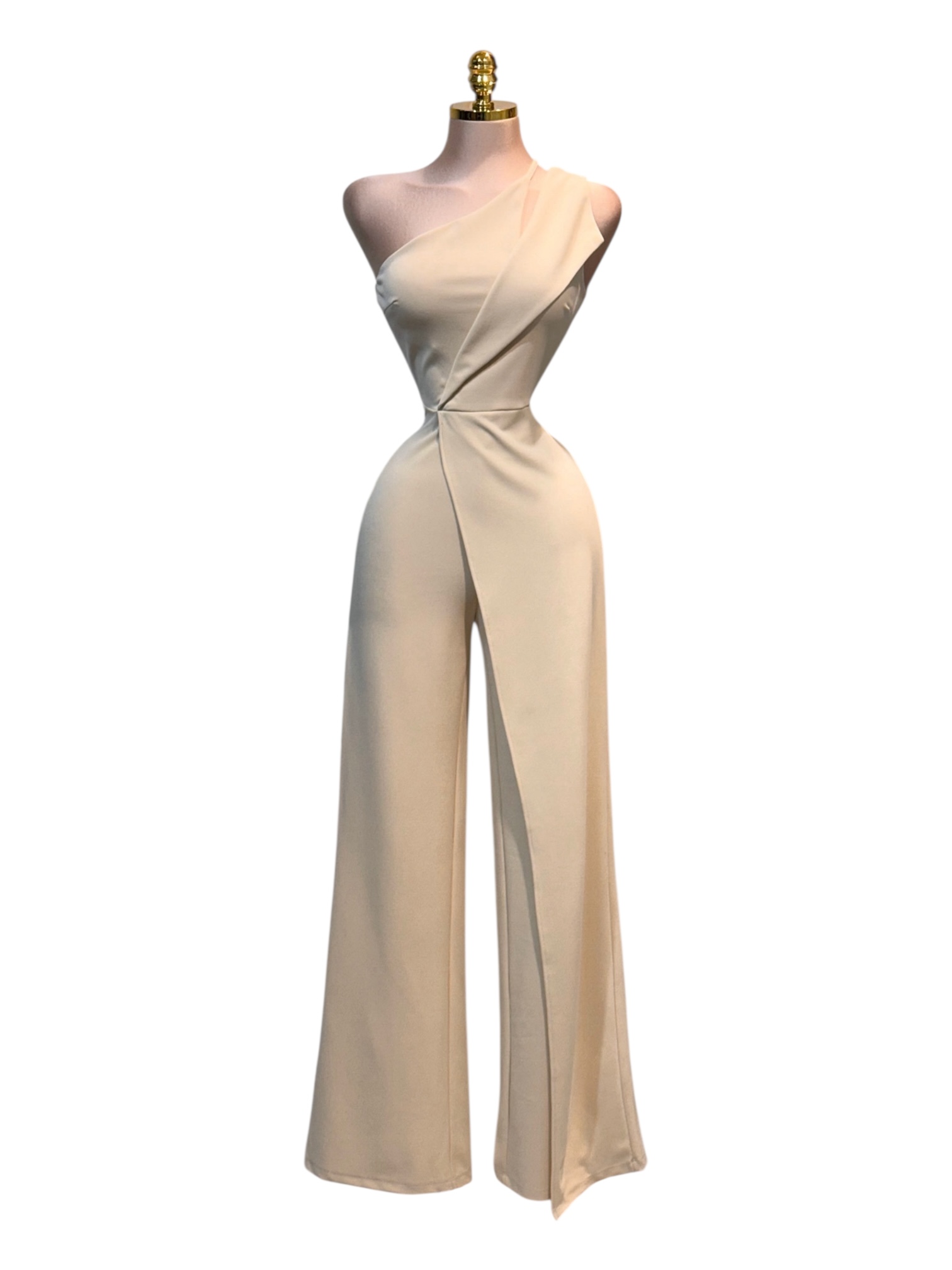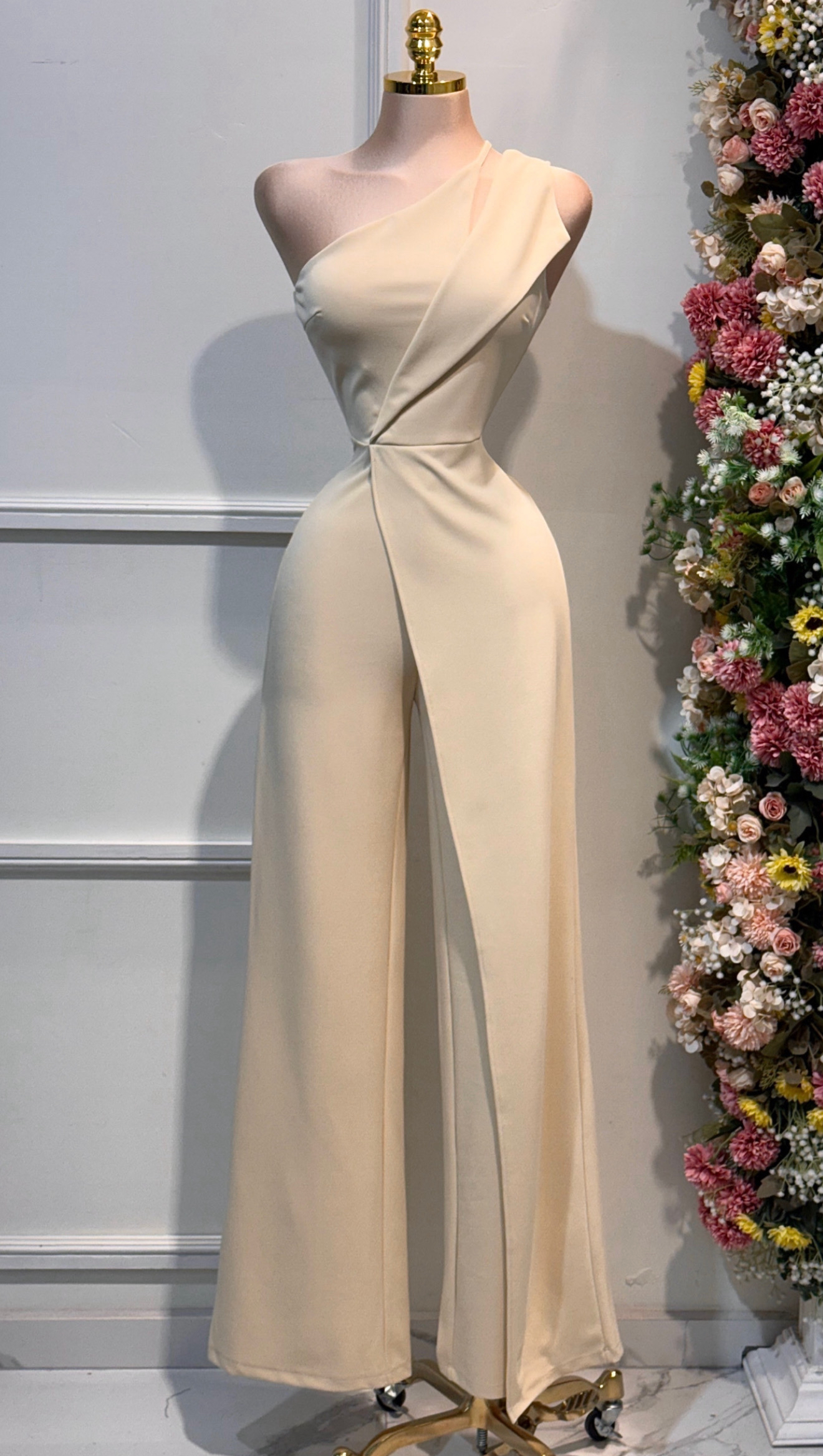 palazzo en tono beige confeccionado en tejido elástico de acabado liso y elegante. Presenta diseño asimétrico de un solo hombro con un drapeado cruzado en el torso que estiliza la parte superior y aporta un toque moderno y sofisticado. La cintura definida realza la figura, mientras que el pantalón de pierna ancha ofrece una caída fluida y un movimiento refinado. El panel frontal superpuesto añade un detalle arquitectónico que eleva el diseño. Ideal para eventos formales, cenas especiales o celebraciones donde busques un look distinguido, contemporáneo y lleno de estilo.