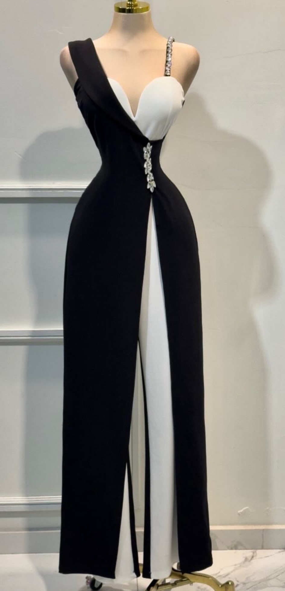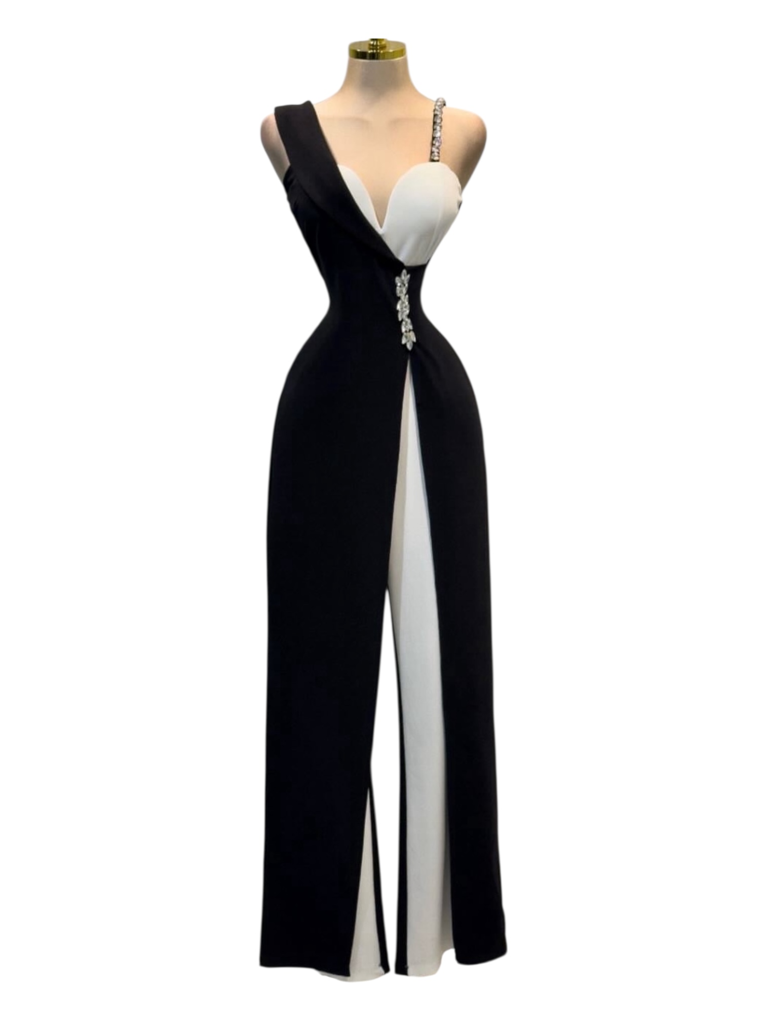 palazzo elegante en combinación blanco y negro con diseño asimétrico que aporta un acabado moderno y sofisticado. Presenta un escote profundo tipo corazón con un tirante delgado decorado en aplicaciones brillantes, mientras que el otro lado incorpora un panel estructurado que envuelve el torso con un efecto escultórico. La cintura se realza con un aplique adornado que estiliza la silueta, dando paso a un pantalón de pierna recta con abertura frontal que añade movimiento y un toque distintivo. Ideal para eventos especiales, galas o noches donde busques lucir un look impactante, refinado y de alto nivel visual.