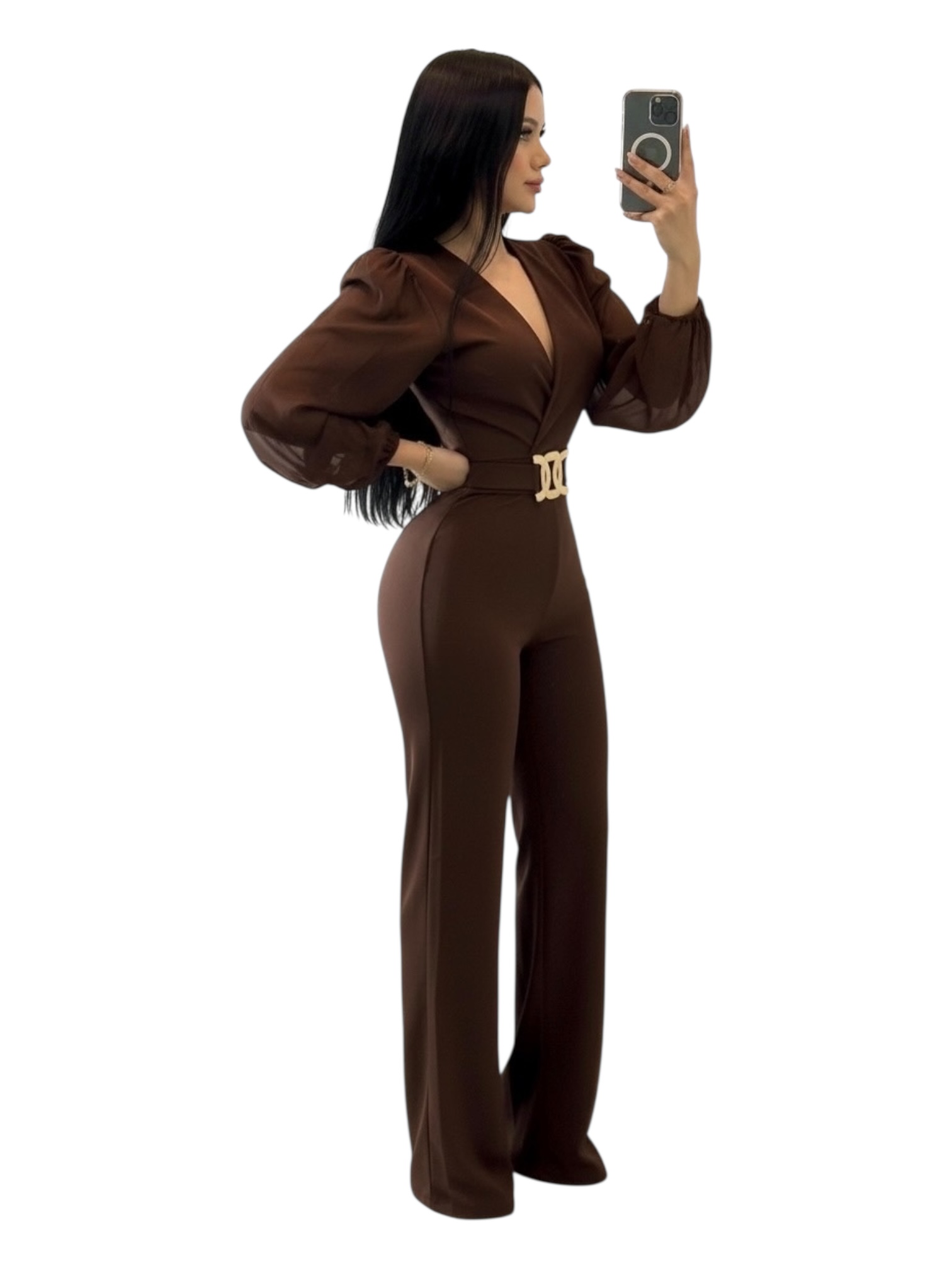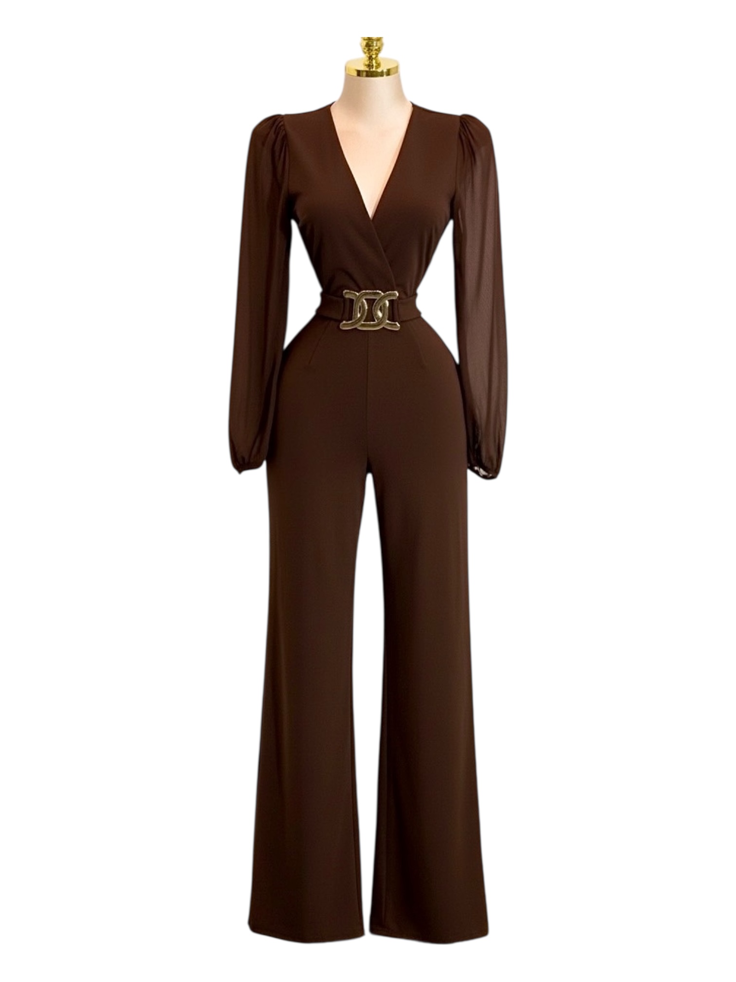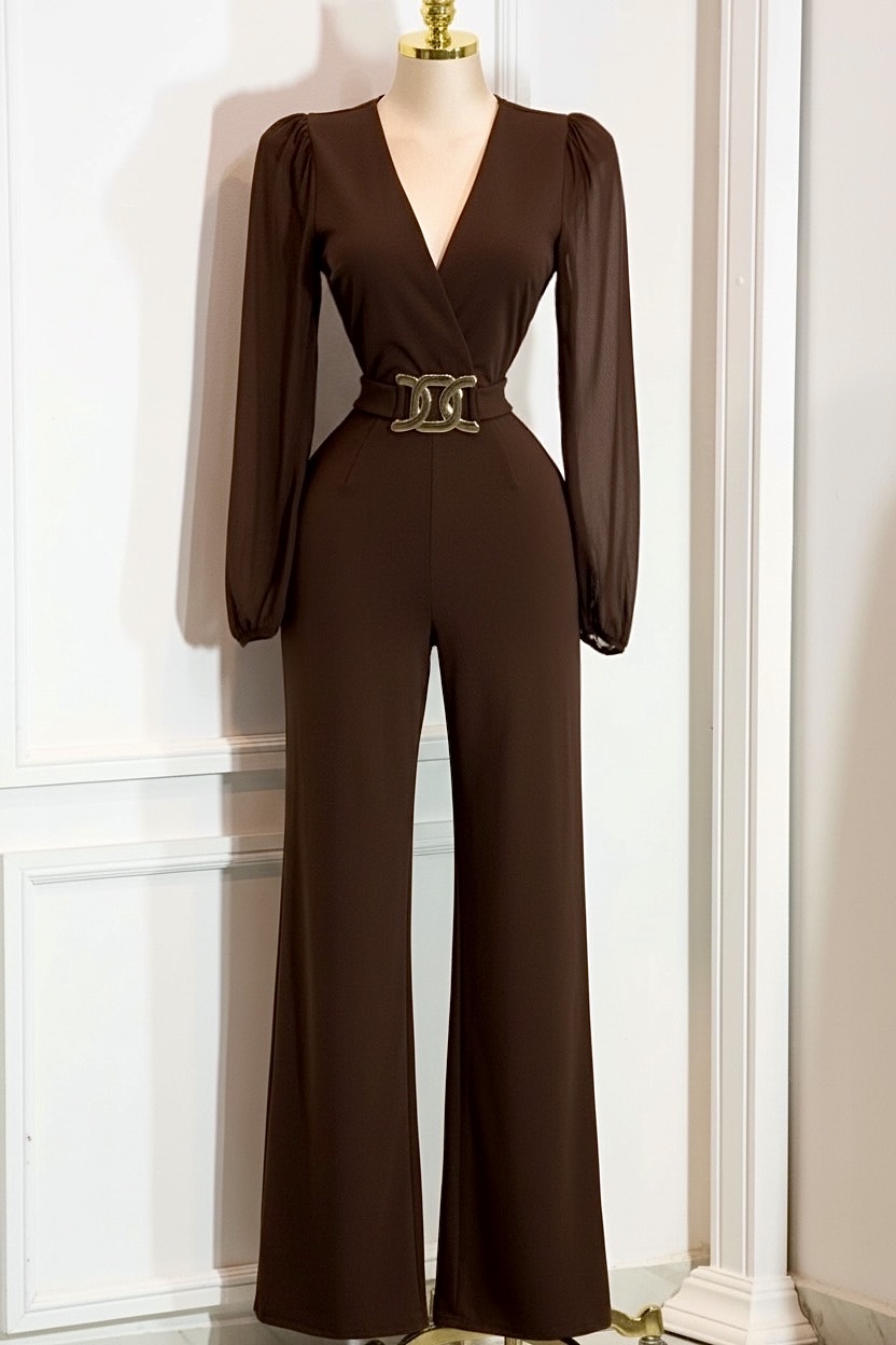 palazzo en tono café con un diseño elegante y sofisticado que estiliza la silueta. Presenta un escote profundo en “V” con efecto cruzado que realza la parte superior de manera femenina. Las mangas largas aportan equilibrio y un toque refinado, mientras que la cintura se acentúa con un cinturón decorativo metálico que define la figura con un acabado lujoso. El pantalón de pierna recta alarga visualmente el cuerpo y ofrece una caída impecable. Ideal para eventos formales, cenas especiales o noches donde busques lucir un look distinguido, moderno y de alto impacto visual.