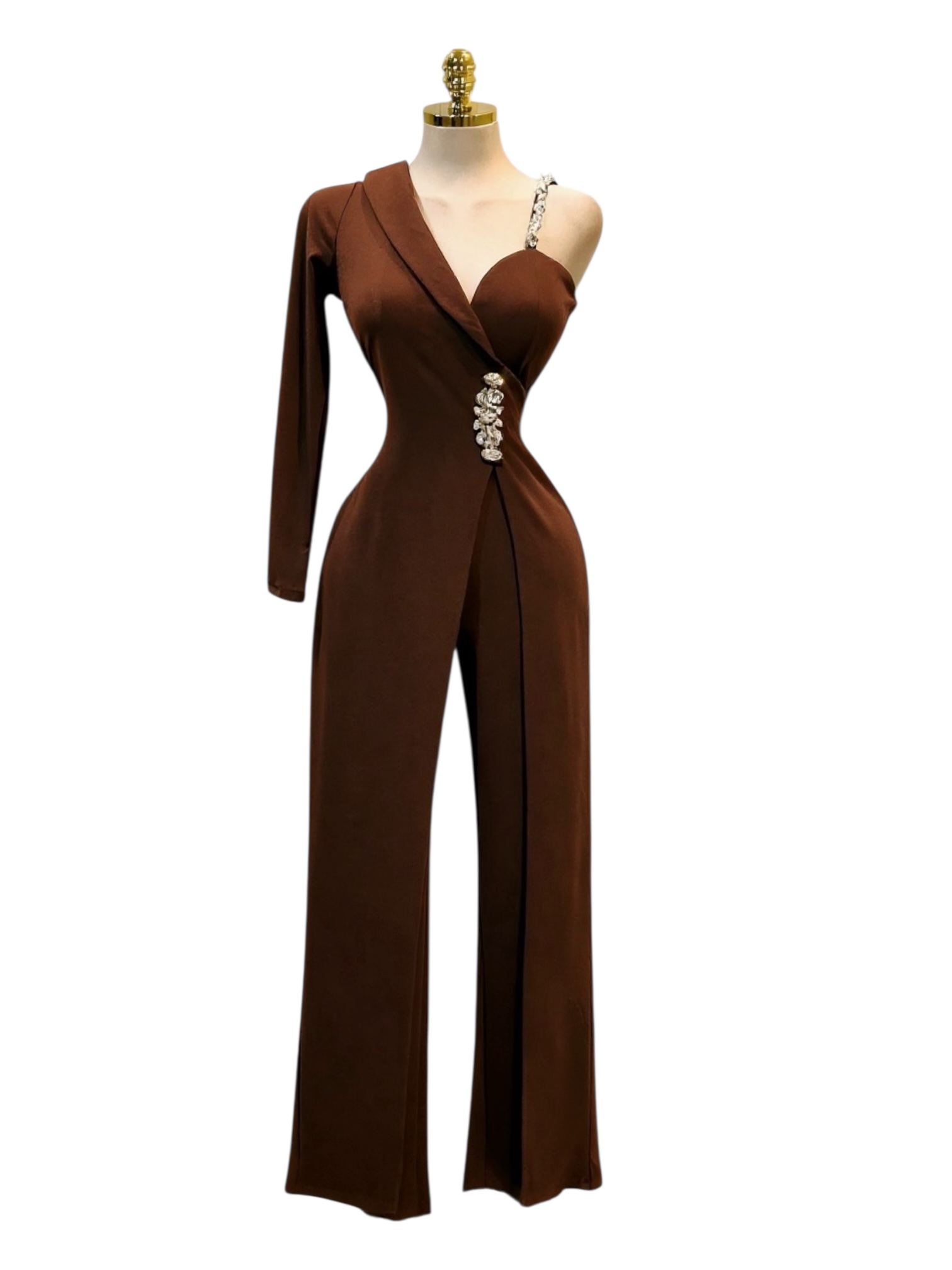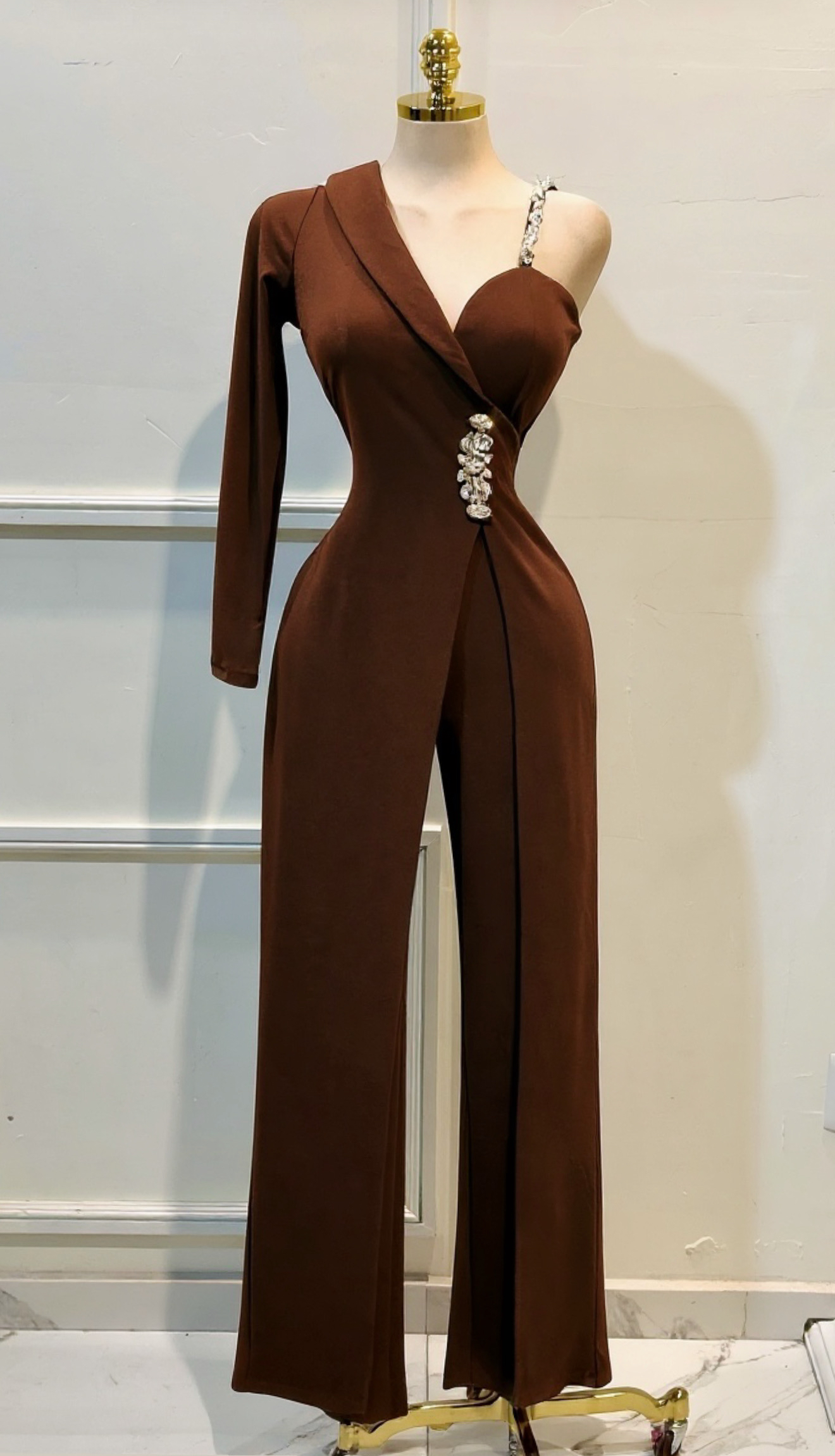 palazzo en tono cafe confeccionado de acabado liso y elegante. Presenta un diseño asimétrico con un tirante decorado con pedrería que aporta un toque glamuroso y distintivo, equilibrado por una manga larga en el lado opuesto. El escote cruzado realza el busto con sofisticación, mientras que la aplicación de pedrería en la cintura define la silueta y añade un acento lujoso. El pantalón de pierna ancha ofrece una caída fluida que estiliza la figura y brinda un movimiento refinado. Ideal para eventos formales, cenas especiales o celebraciones donde busques un look moderno, elegante y lleno de presencia.
