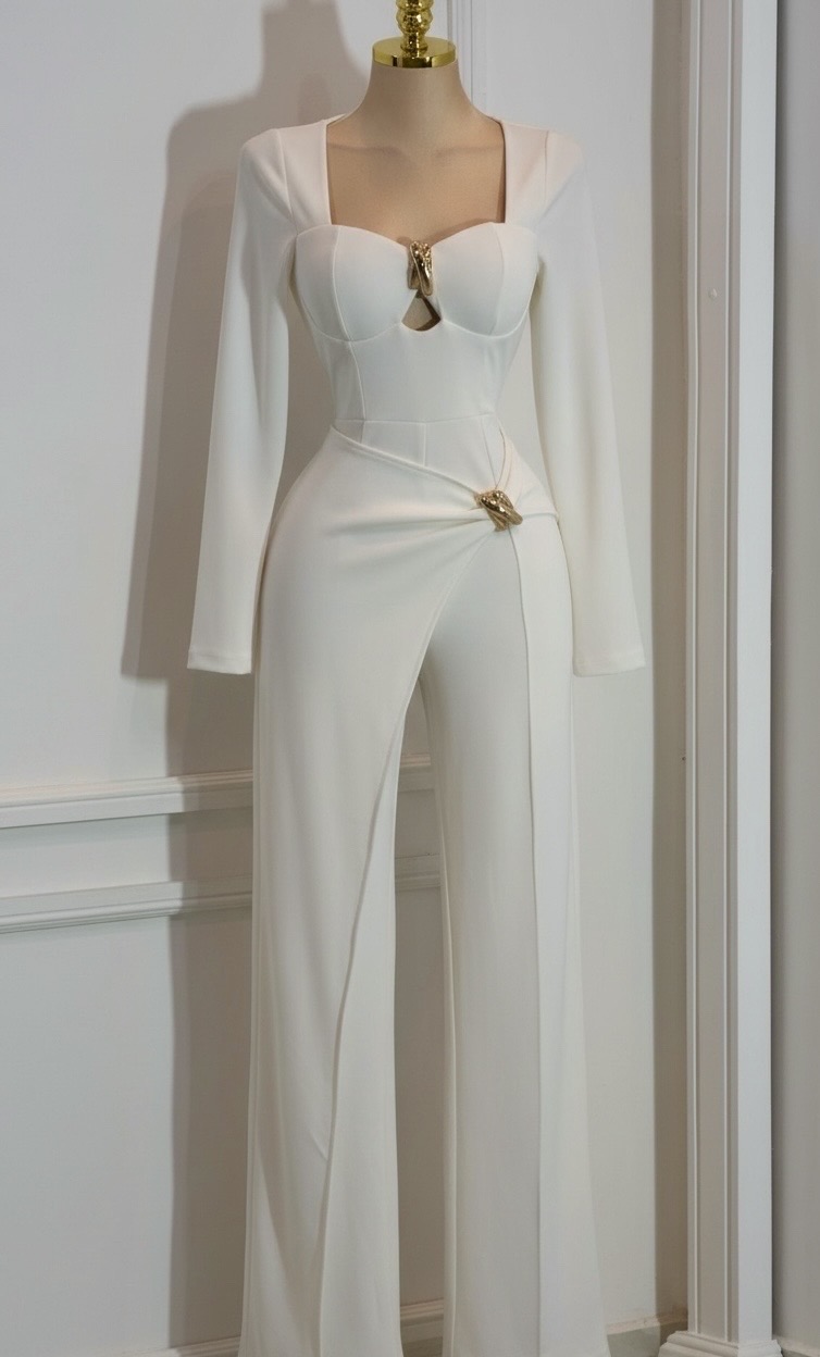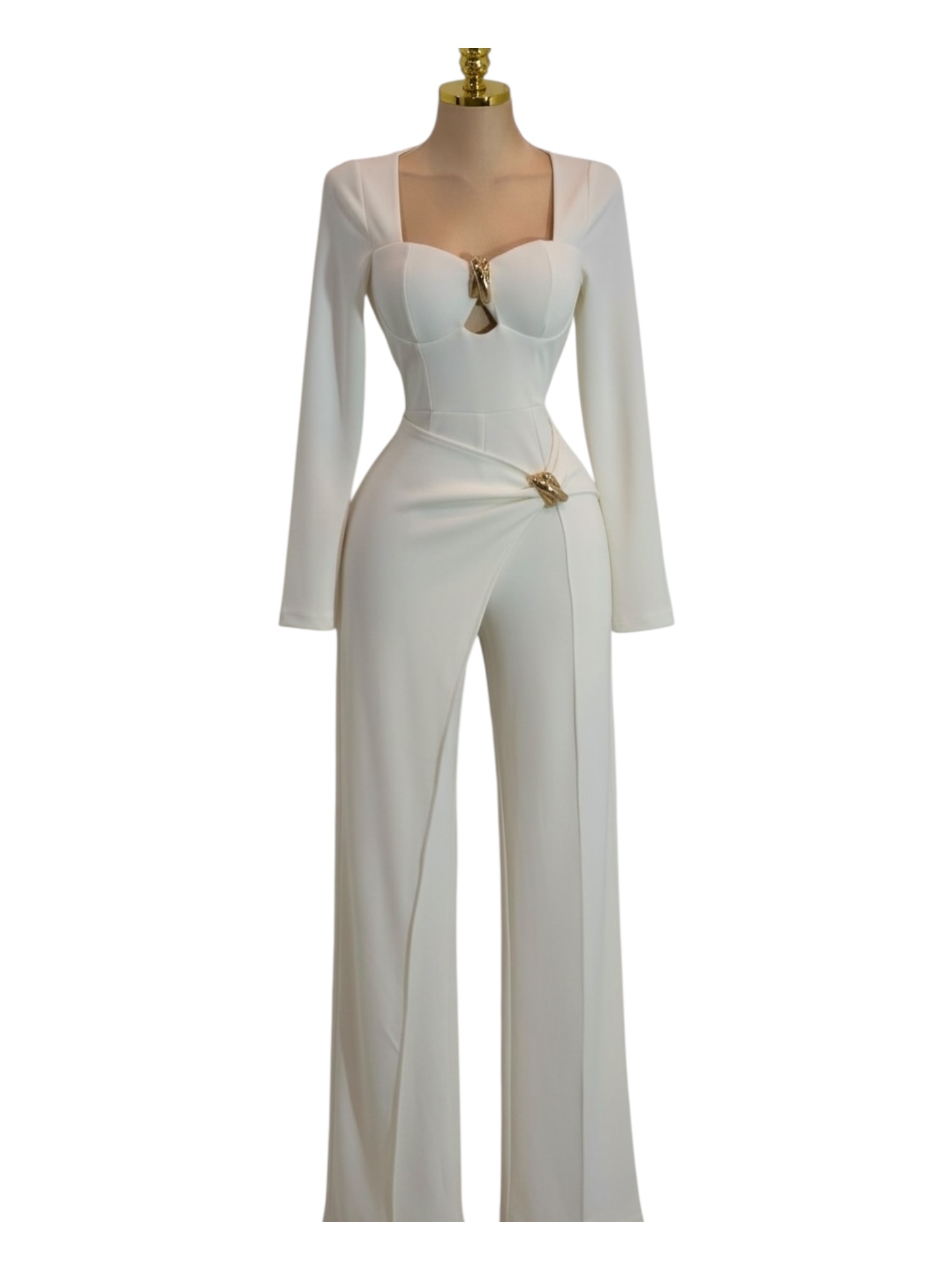 palazzo en tono blanco con un diseño elegante, sofisticado y de acabado estructurado. Presenta un escote corazón con copas definidas que realzan el busto de manera femenina, acompañado de una abertura central sutil decorada con aplicación metálica dorada que aporta un toque lujoso. El diseño incorpora mangas largas y un cuerpo tipo corset que moldea la silueta y estiliza la cintura con gran precisión.