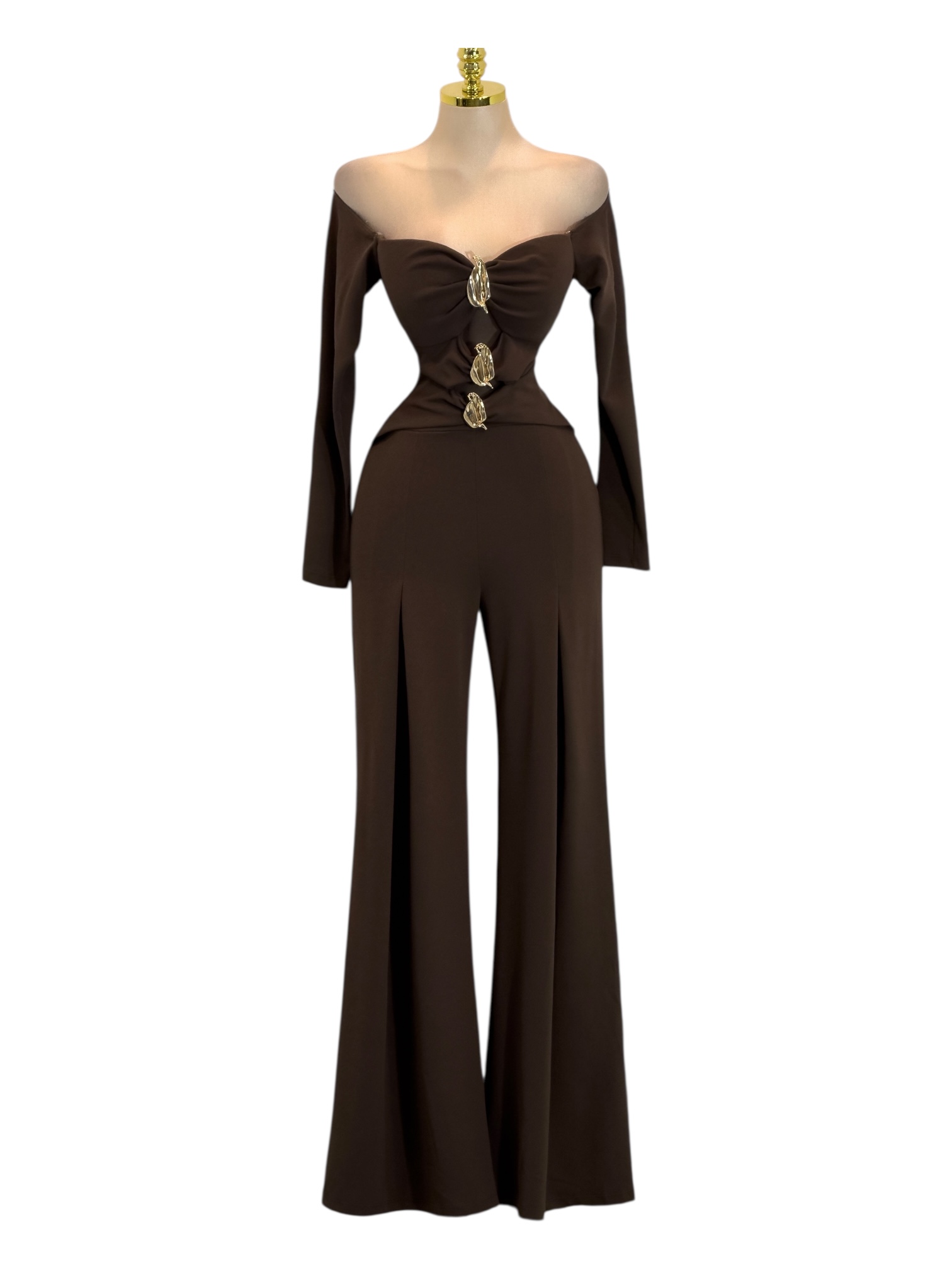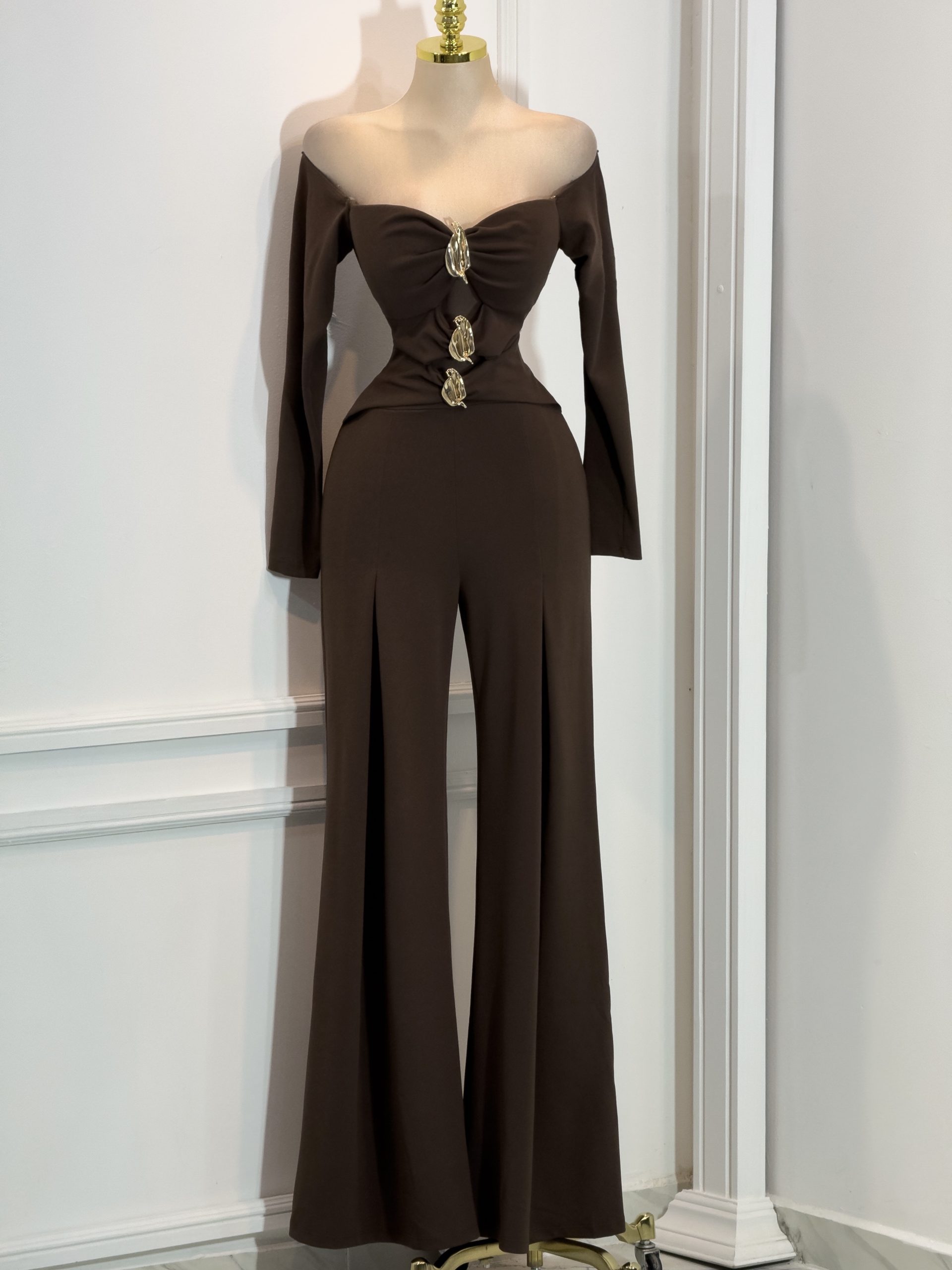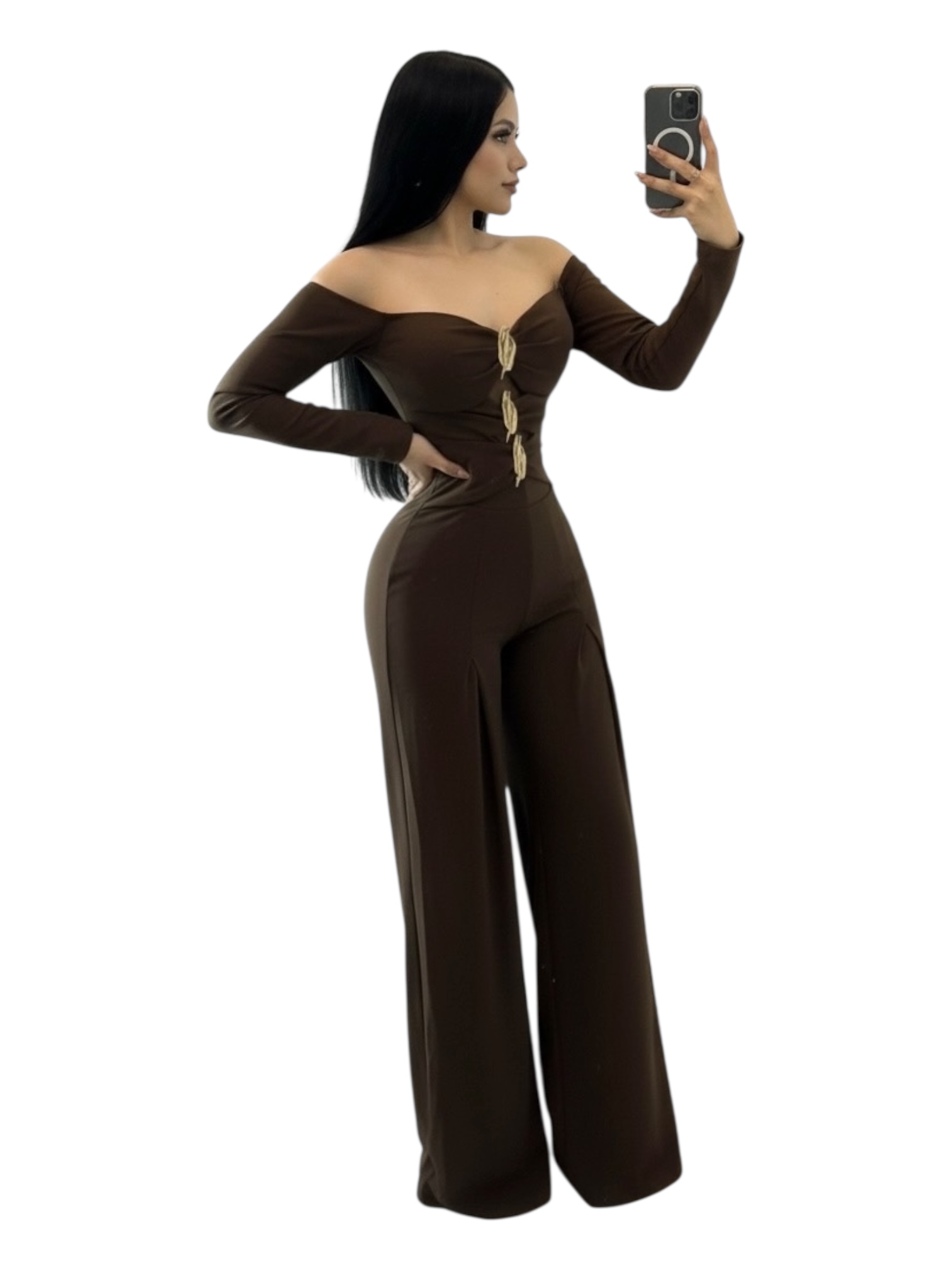 palazzo largo en tono café profundo con diseño sofisticado y sensual. Presenta un escote palabra de honor con hombros descubiertos y mangas largas ajustadas, que enmarcan la silueta de forma elegante. El cuerpo tipo corset incorpora delicados detalles metálicos centrales que aportan un acento moderno y refinado, estilizando el torso y definiendo la cintura. La parte inferior se compone de un pantalón largo de corte recto y caída fluida, creando una silueta alargada y poderosa. Ideal para eventos nocturnos, galas o celebraciones donde busques un look audaz, femenino y de alto impacto visual.