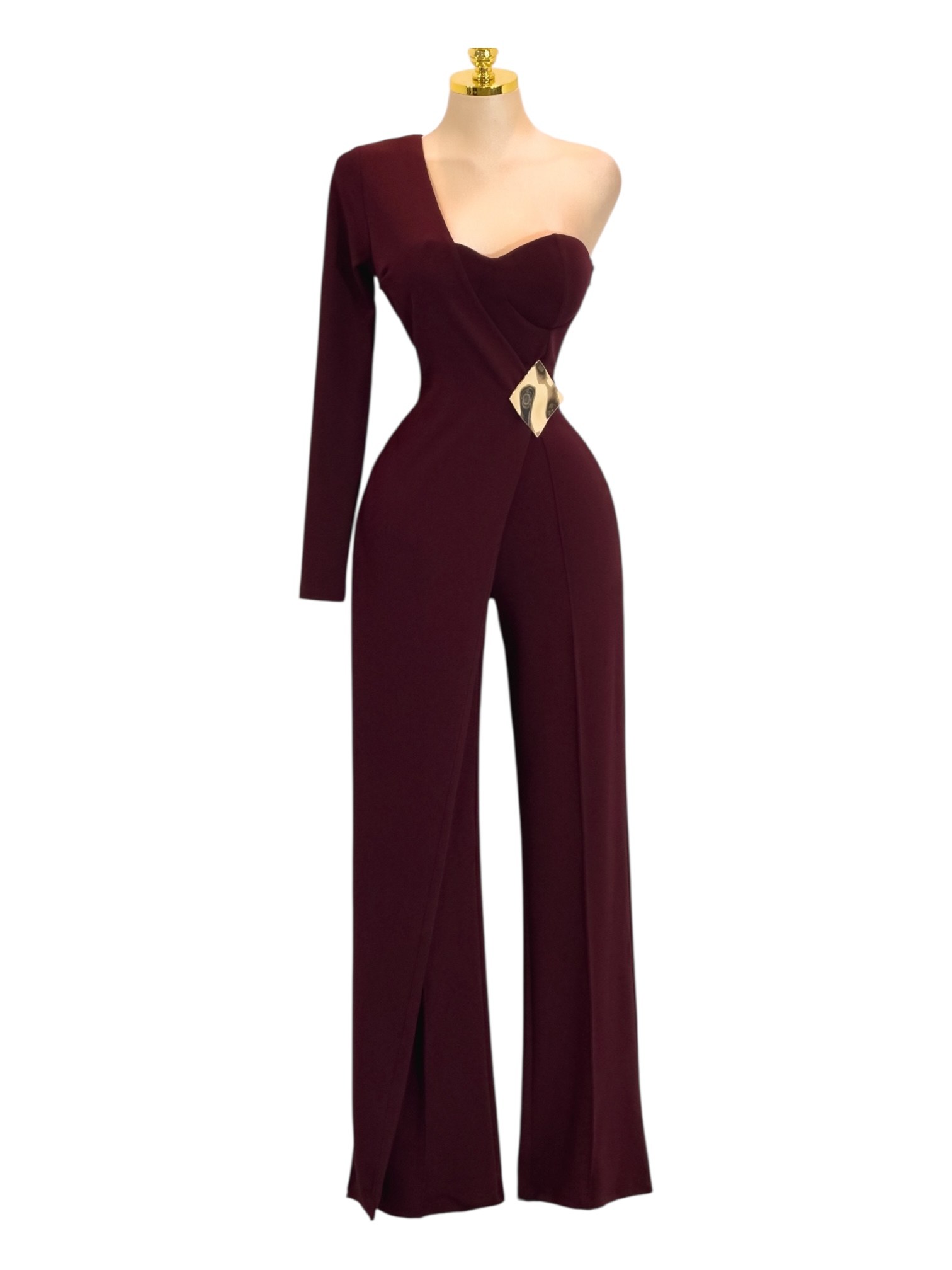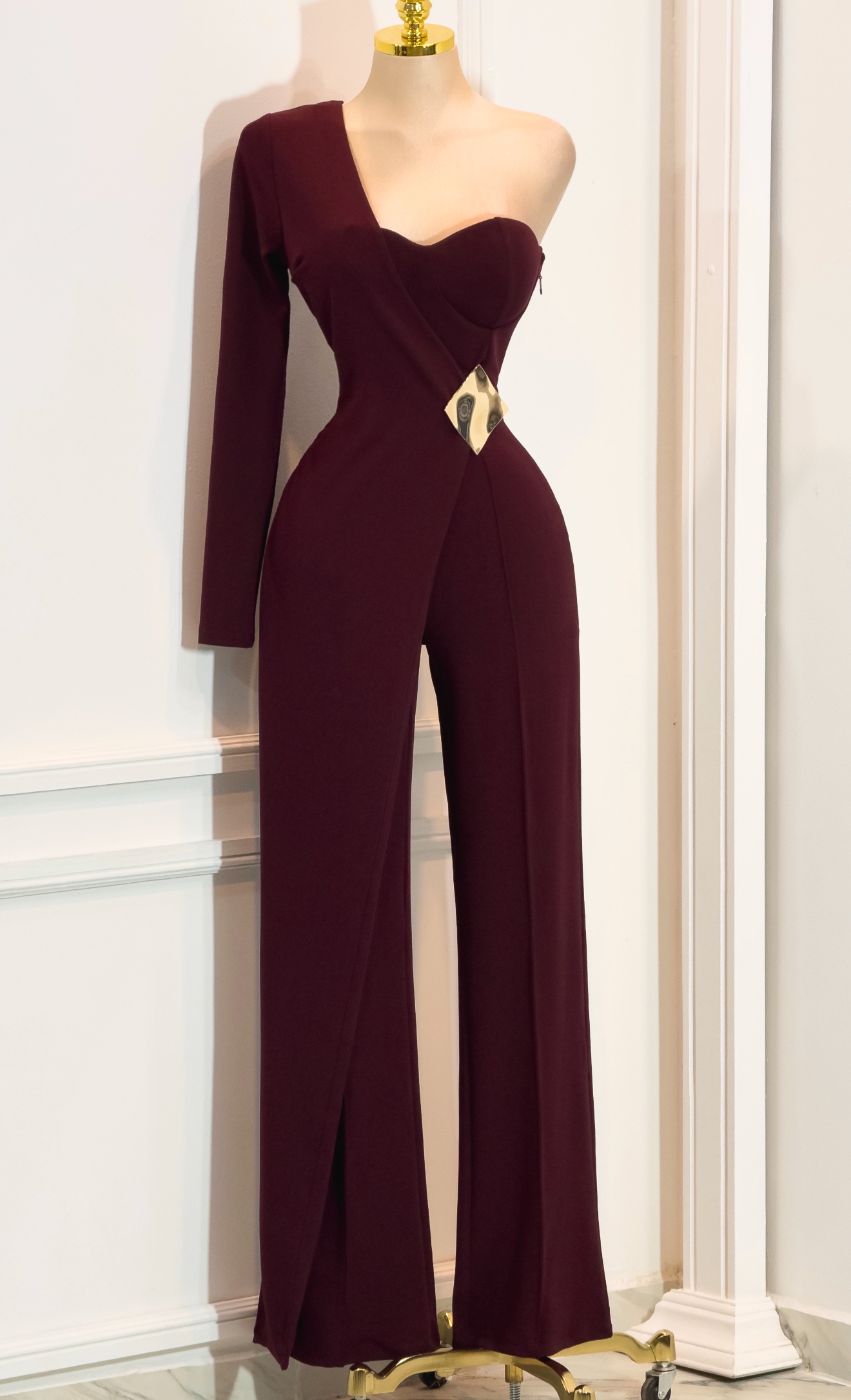 palazzo en tono vino tinto con un diseño elegante, moderno y de alto impacto visual. Presenta un escote tipo corazón con diseño asimétrico de un solo hombro y manga larga, que aporta un equilibrio sofisticado entre sensualidad y estructura. El cuerpo entallado estiliza la silueta y define la cintura con un drapeado cruzado que se acentúa con una aplicación metálica dorada, añadiendo un toque lujoso y distintivo.