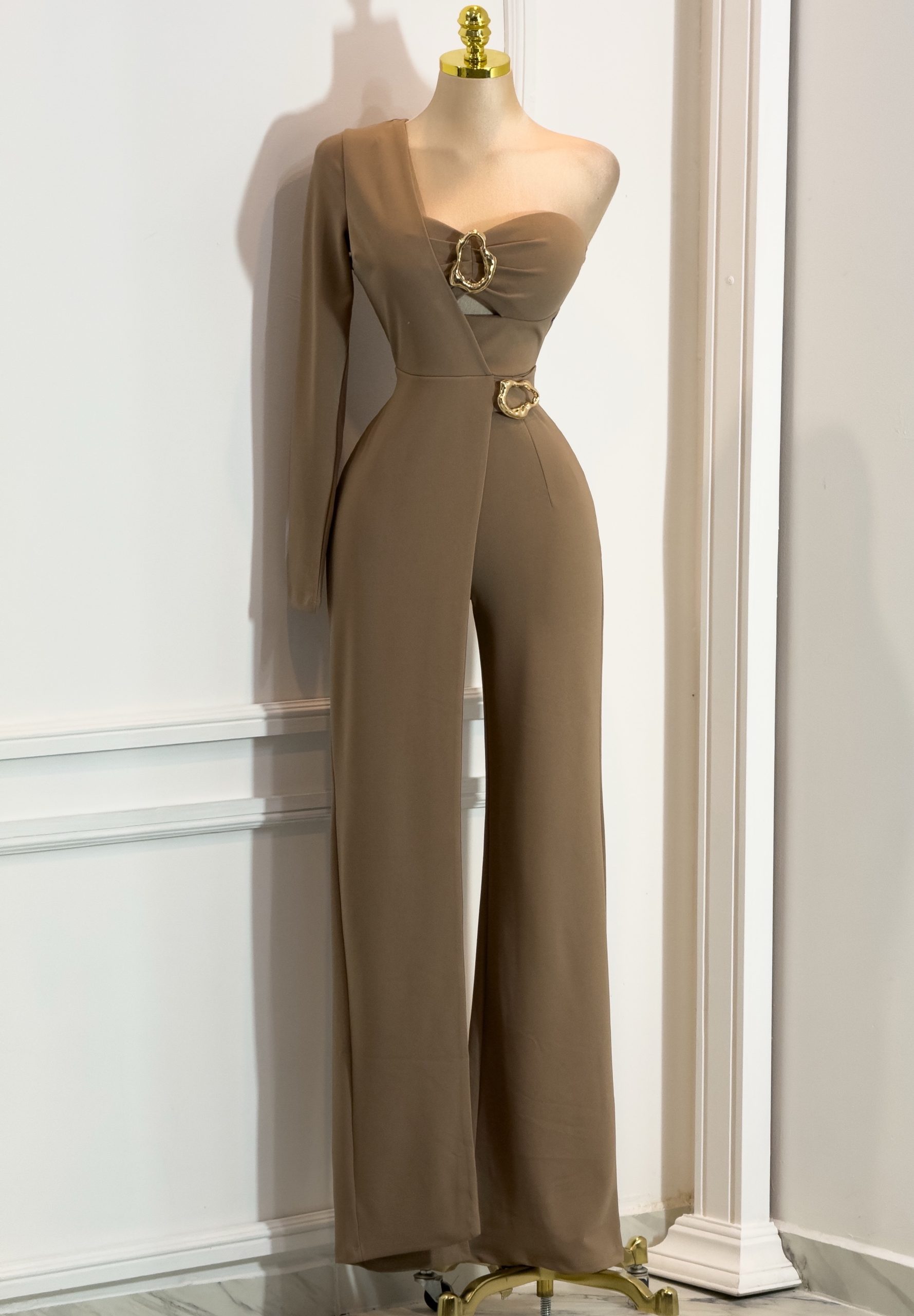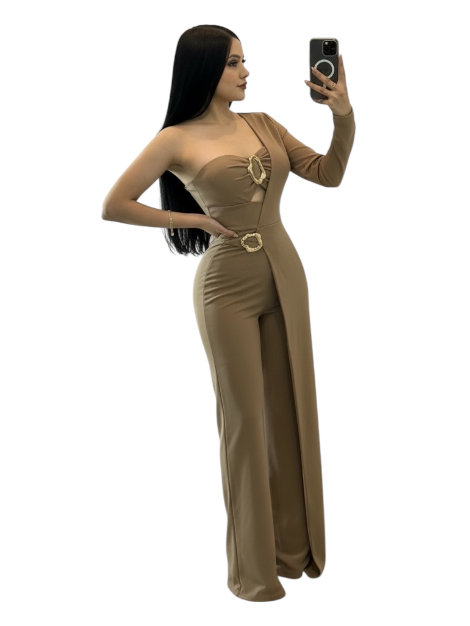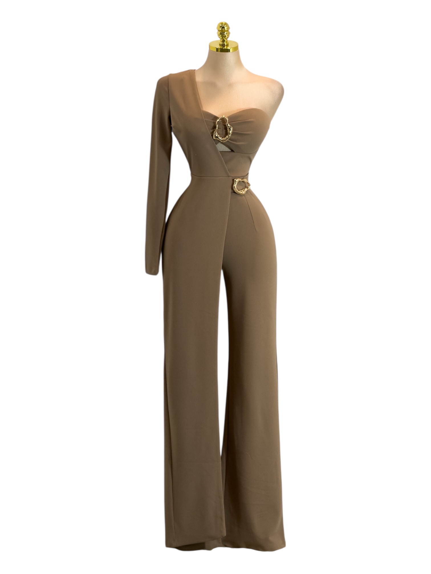palazzo en tono moka con un diseño moderno, sofisticado y de alto impacto visual. Presenta un escote asimétrico que combina un lado con manga larga y otro con hombro descubierto, creando un contraste elegante y estilizador. El busto incluye un detalle drapeado con un broche dorado central que aporta un acabado lujoso y distintivo, complementado por un segundo broche metálico en la cintura que acentúa la silueta y define la figura.