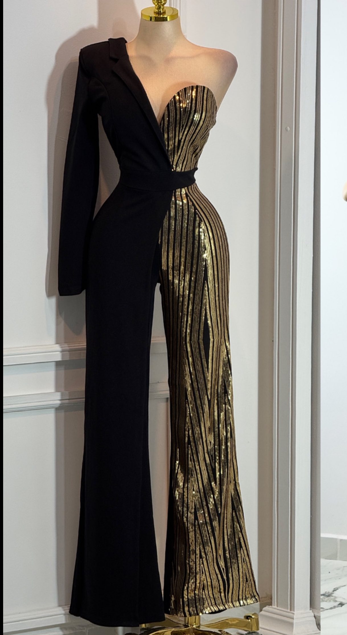 palazzo largo en tono negro con diseño asimétrico de un solo hombro y manga larga. Presenta busto strapless con panel de lentejuelas en contraste dorado que aporta brillo y un efecto visual sofisticado. La cintura definida estiliza la silueta y el pantalón largo de corte recto completa el diseño con una caída elegante. Ideal para galas, eventos formales y celebraciones nocturnas de alto impacto.