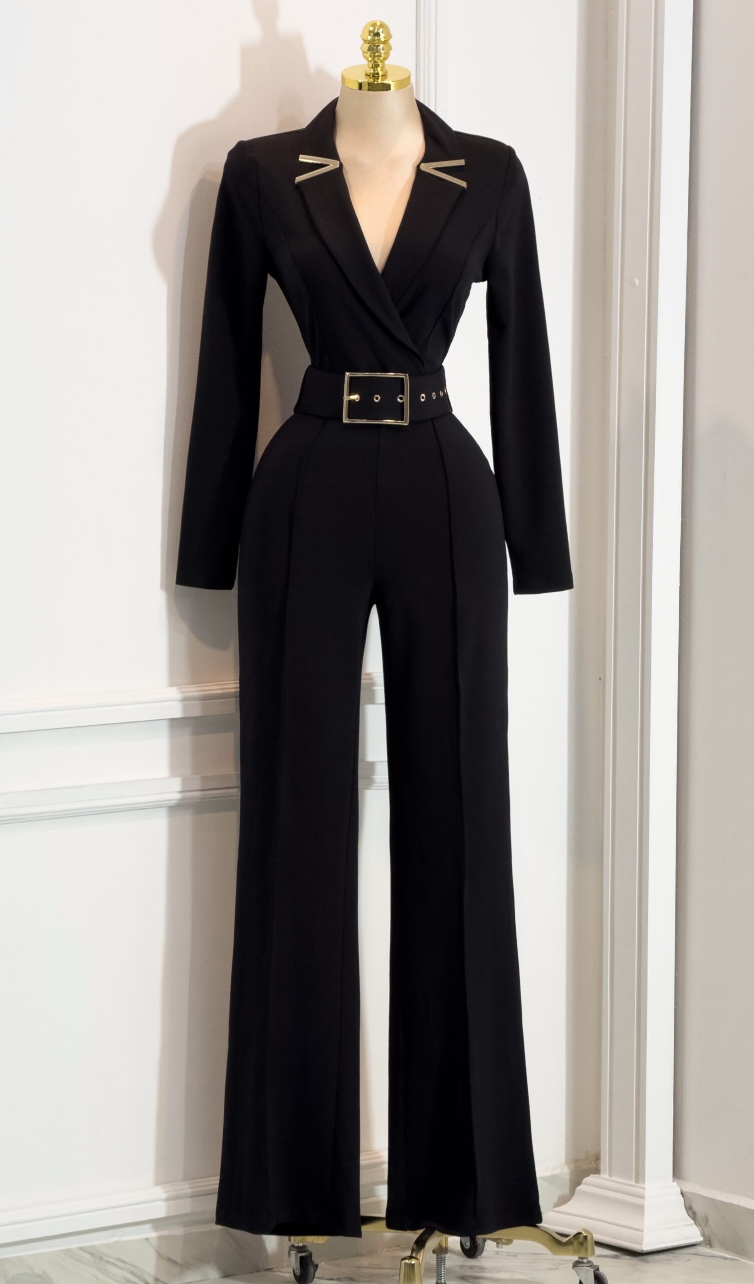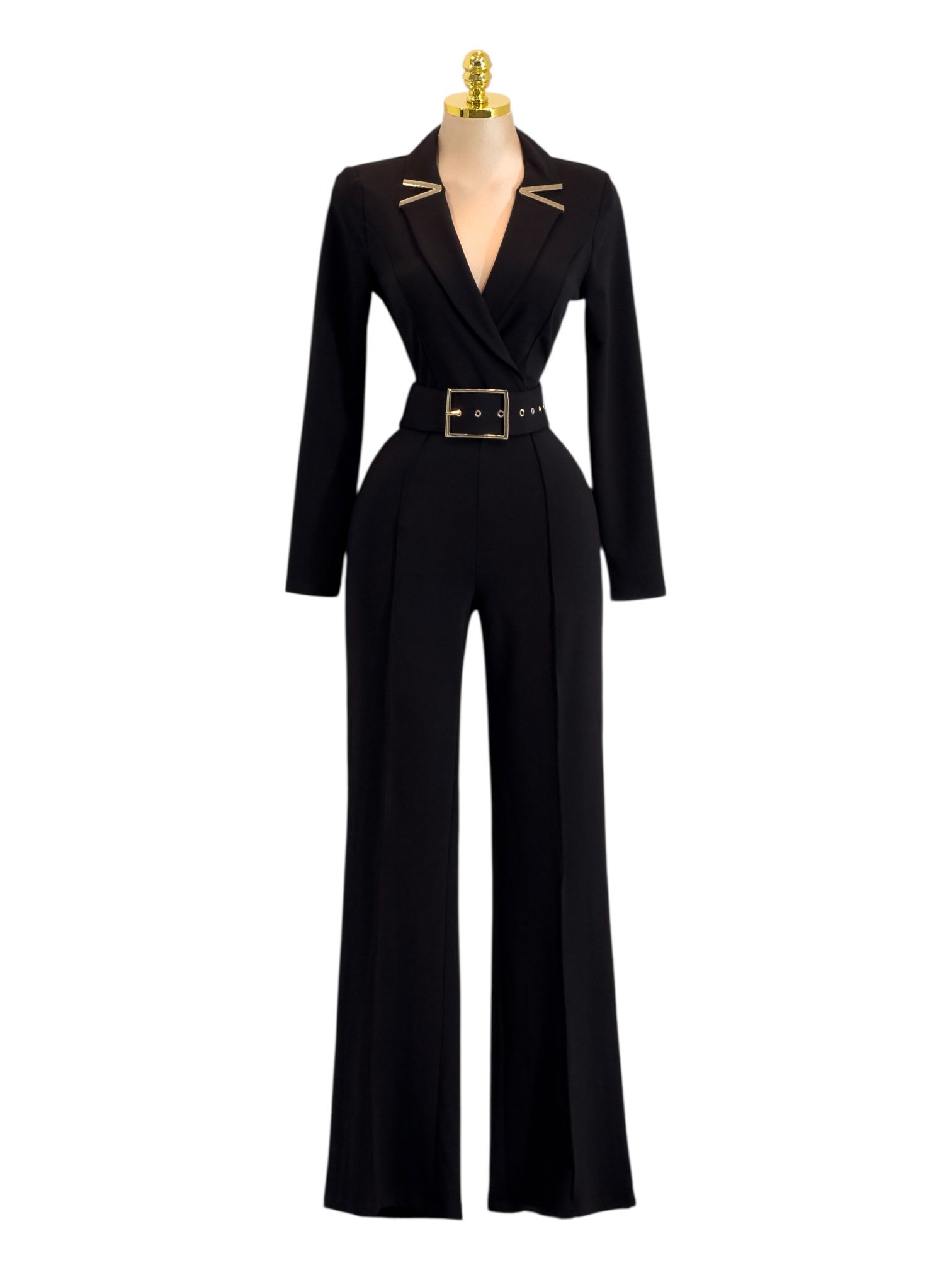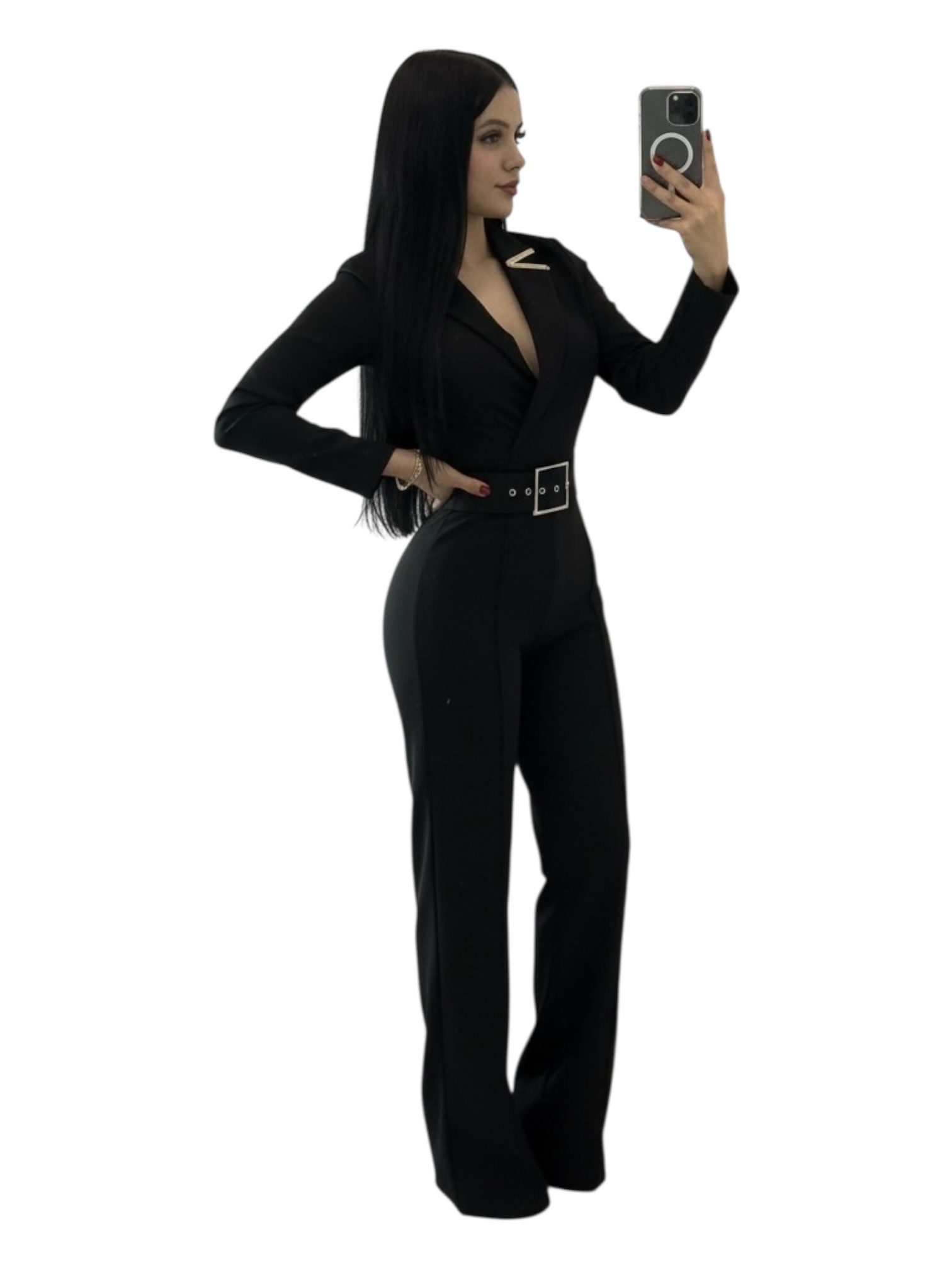 palazzo largo en tono negro con escote en V cruzado tipo blazer y solapas con detalle metálico decorativo. Presenta mangas largas estructuradas y cinturón integrado con hebilla metálica que define la cintura. El pantalón largo de corte recto estiliza la silueta y aporta un acabado elegante y sofisticado, ideal para eventos formales o celebraciones nocturnas.