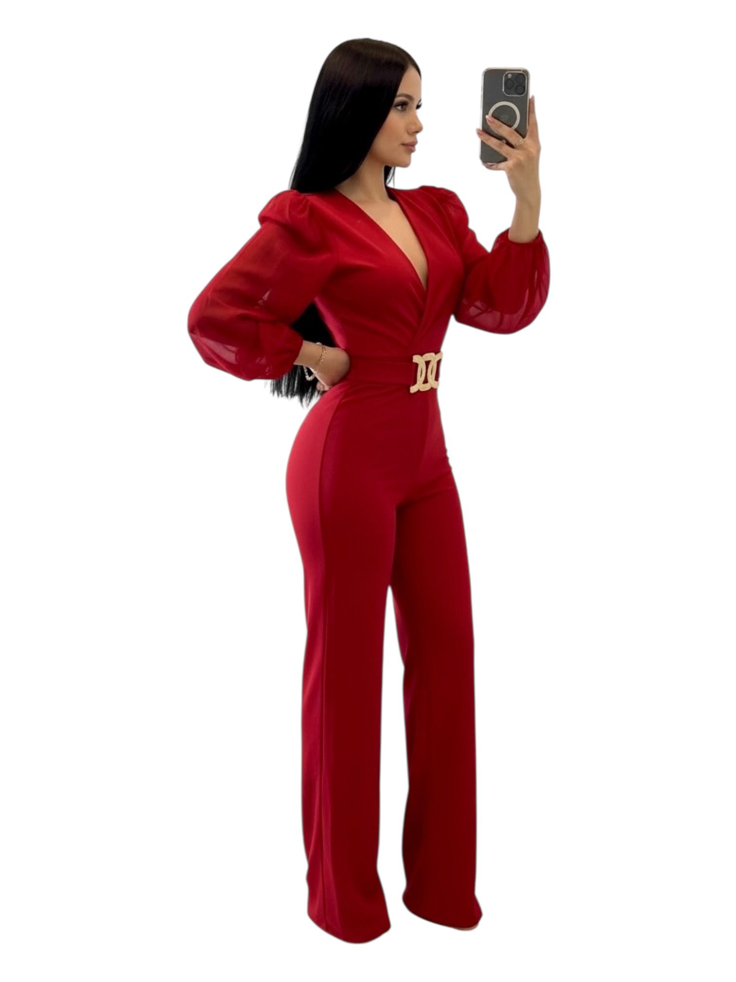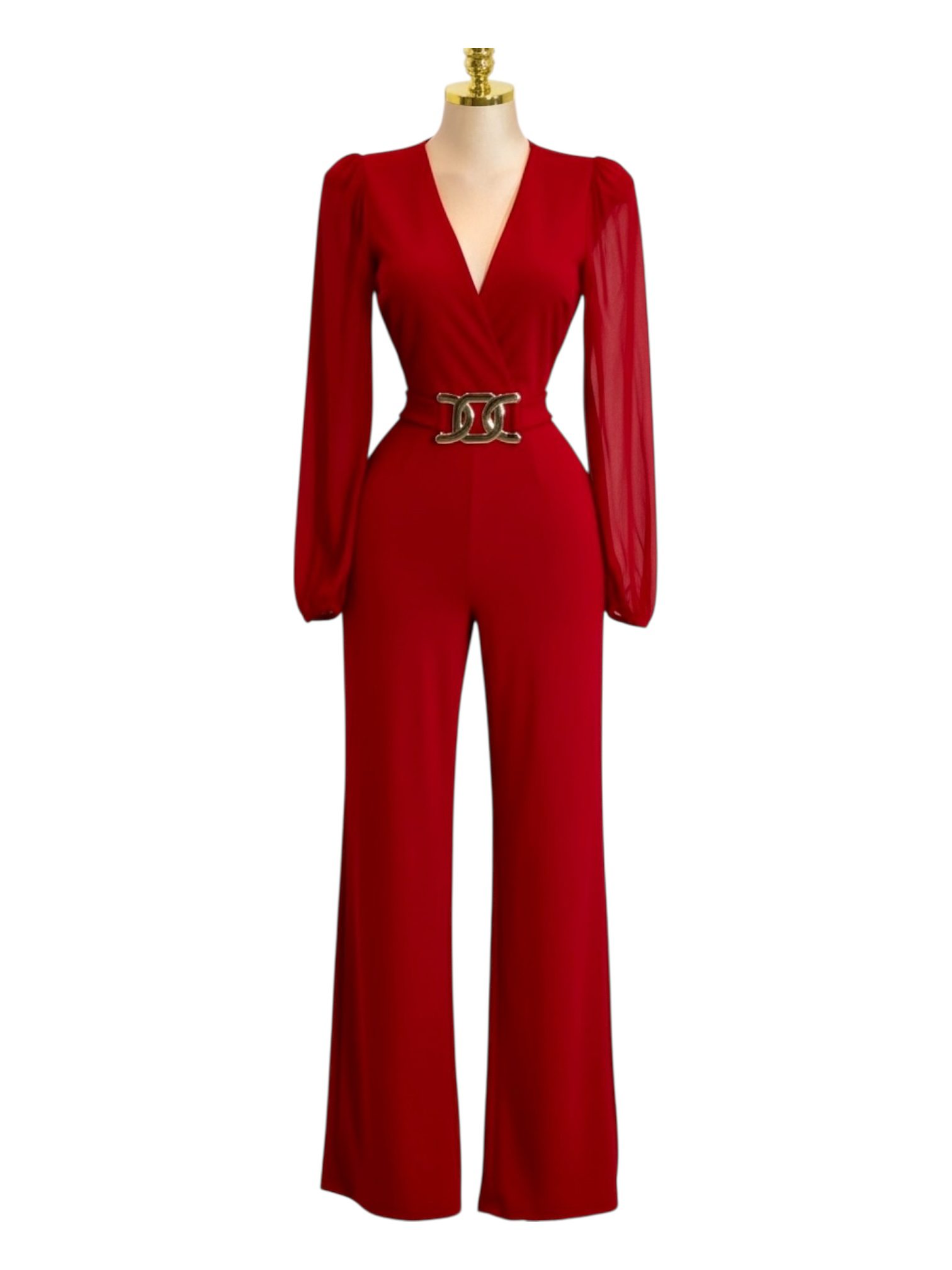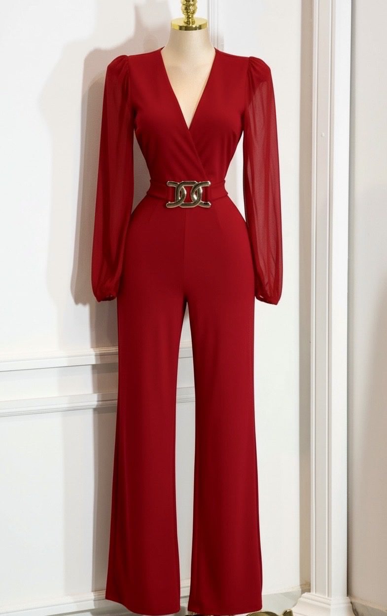 palazzo en tono rojo vibrante con un diseño elegante y moderno que estiliza la silueta. Presenta un escote profundo en “V” con efecto cruzado que realza la parte superior de manera sofisticada. Las mangas largas translúcidas tipo globo aportan volumen y un toque femenino, mientras que la cintura se define con un cinturón metálico decorativo que acentúa la figura. El pantalón de pierna recta alarga visualmente el cuerpo y ofrece un acabado pulido y refinado. Ideal para eventos especiales, cenas elegantes o noches donde busques un look poderoso, distinguido y de alto impacto visual.