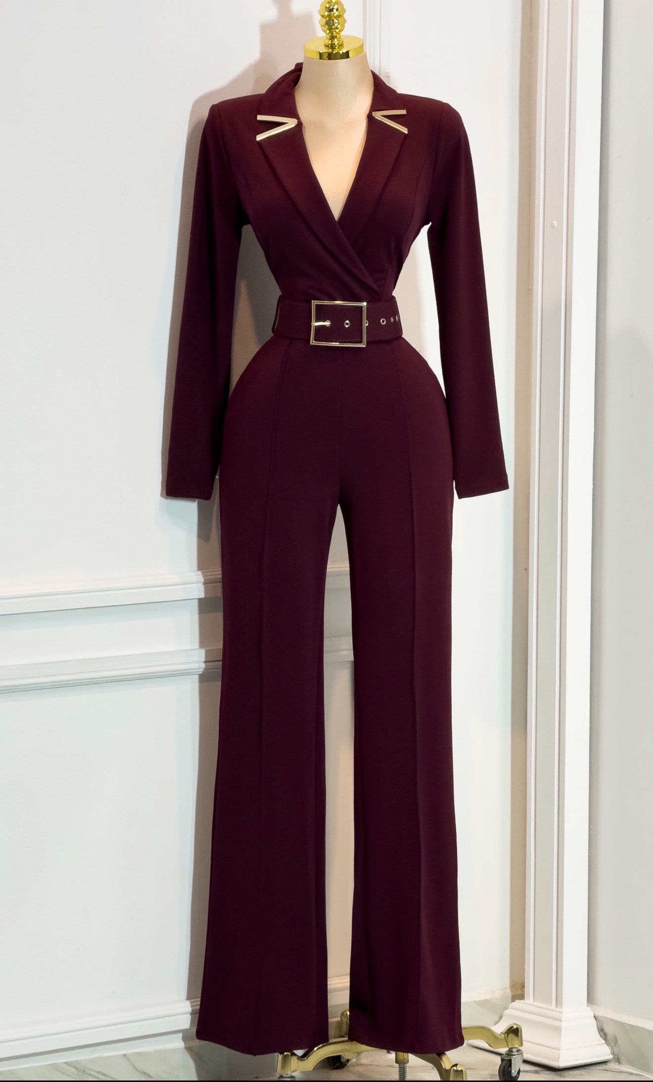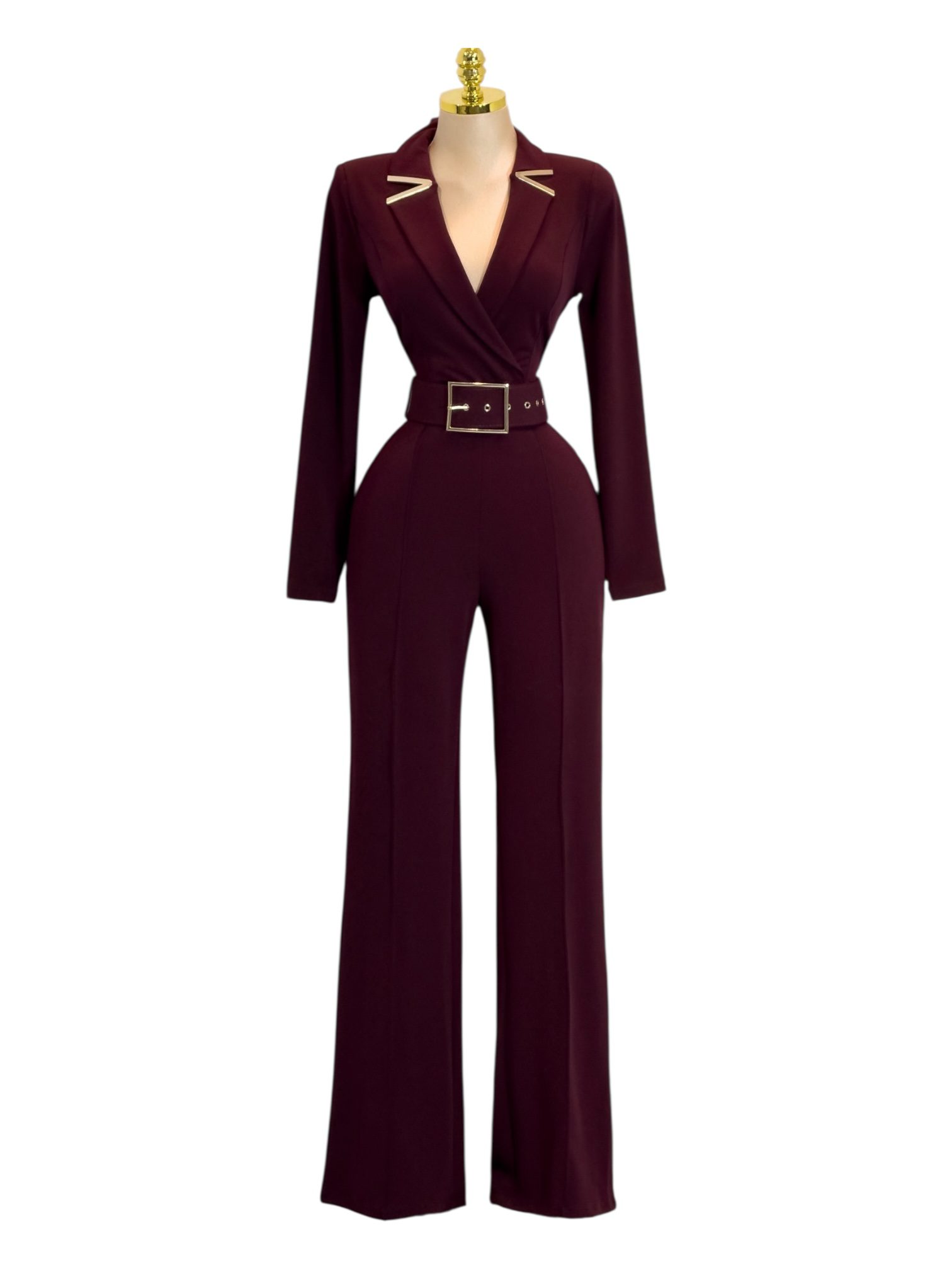 palazzo largo en tono vino profundo con diseño elegante y sofisticado de inspiración sastre. Presenta un escote en V cruzado tipo blazer con solapas definidas y detalles metálicos decorativos en el cuello, que aportan un acento moderno y refinado. Las mangas largas estructuradas equilibran el diseño y estilizan la silueta superior. La cintura se define con un cinturón integrado con hebilla metálica rectangular, realzando la figura de manera favorecedora y elegante. El pantalón largo de corte recto y caída fluida alarga visualmente la silueta y completa el look con una línea pulida y poderosa. Ideal para eventos formales, cenas elegantes, galas o celebraciones nocturnas donde busques un look sofisticado, femenino y de alto impacto visual.