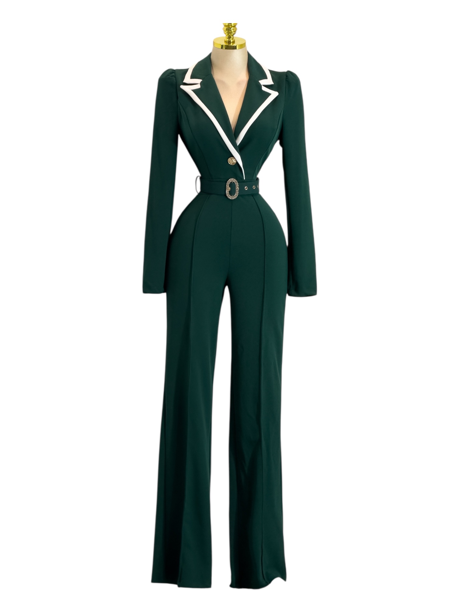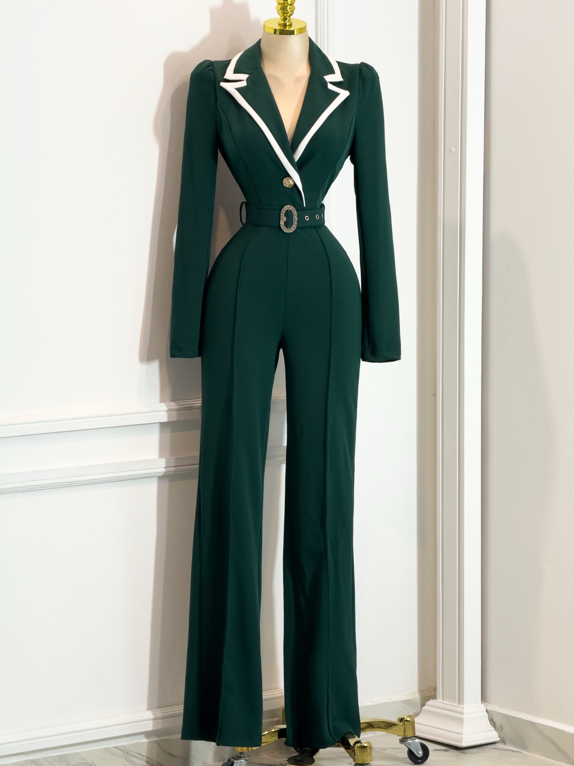 palazzo en tono verde con un diseño elegante, estructurado y de estilo sofisticado. Presenta un cuello solapa bicolor en blanco que aporta contraste y un acabado pulido tipo sastre. El cuerpo entallado incluye botones frontales decorativos y un cinturón a juego con hebilla brillante que define la cintura y estiliza la silueta.