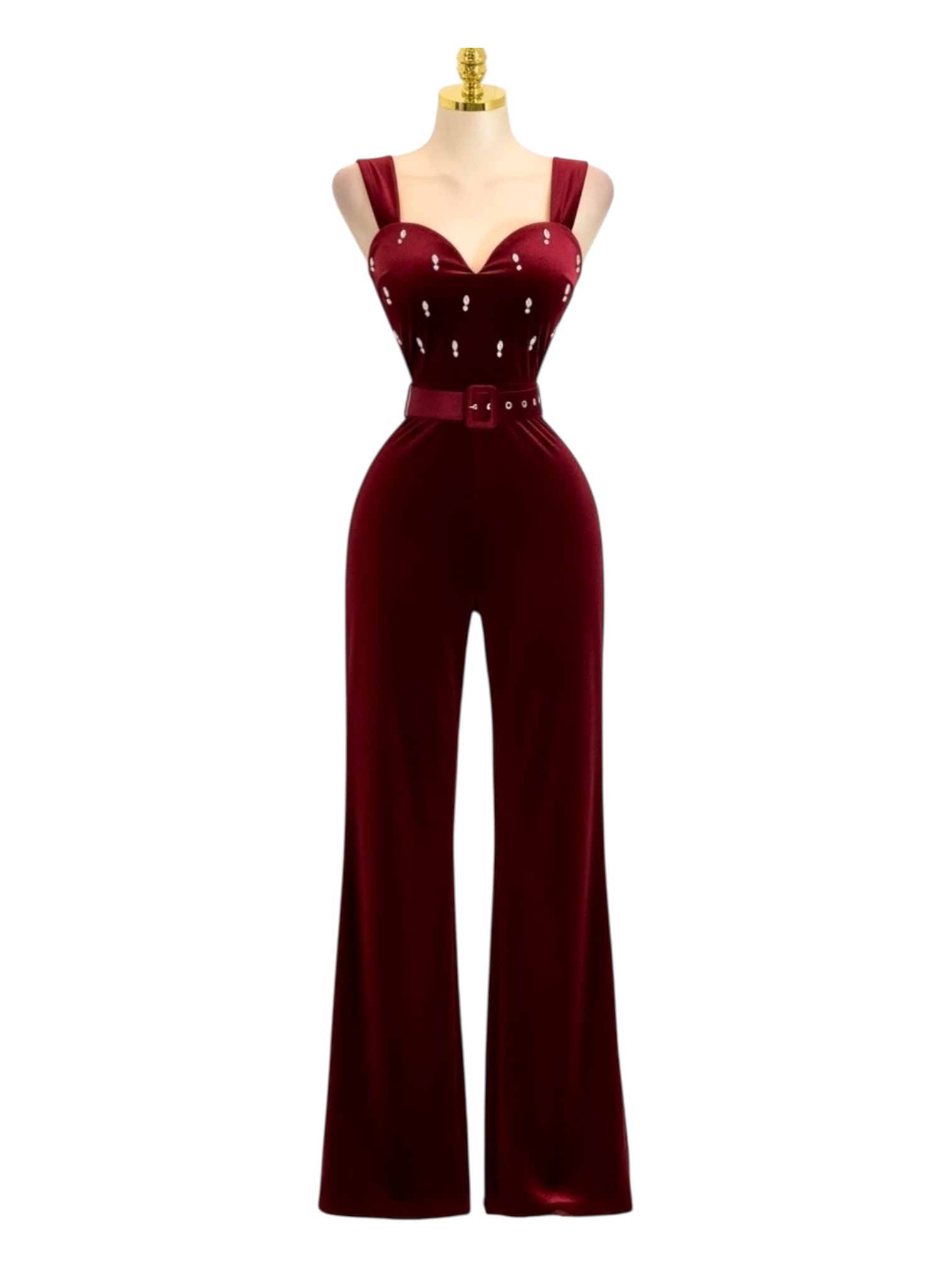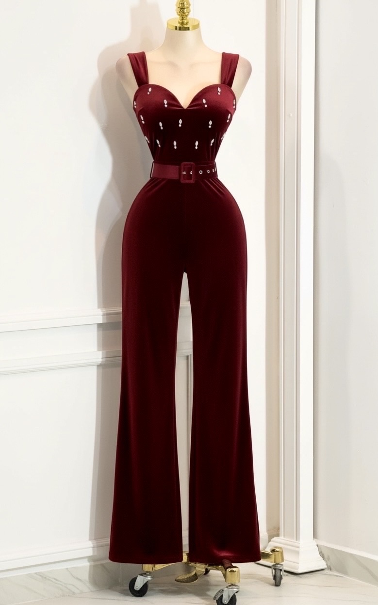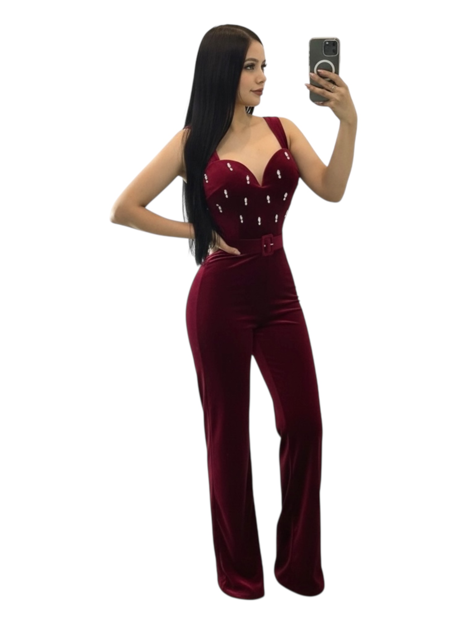 palazzo en tono vino con un diseño elegante, moderno y de alto impacto visual. Presenta un escote tipo corazón con tirantes anchos que realzan la parte superior y aportan soporte y estilo. El corset incluye piedras brillantes distribuidas en la parte frontal, añadiendo un toque lujoso y llamativo. La cintura se acentúa con un cinturón del mismo tono que moldea y define la silueta. El pantalón de pierna ancha cae con fluidez, estilizando la figura y dando un porte refinado.