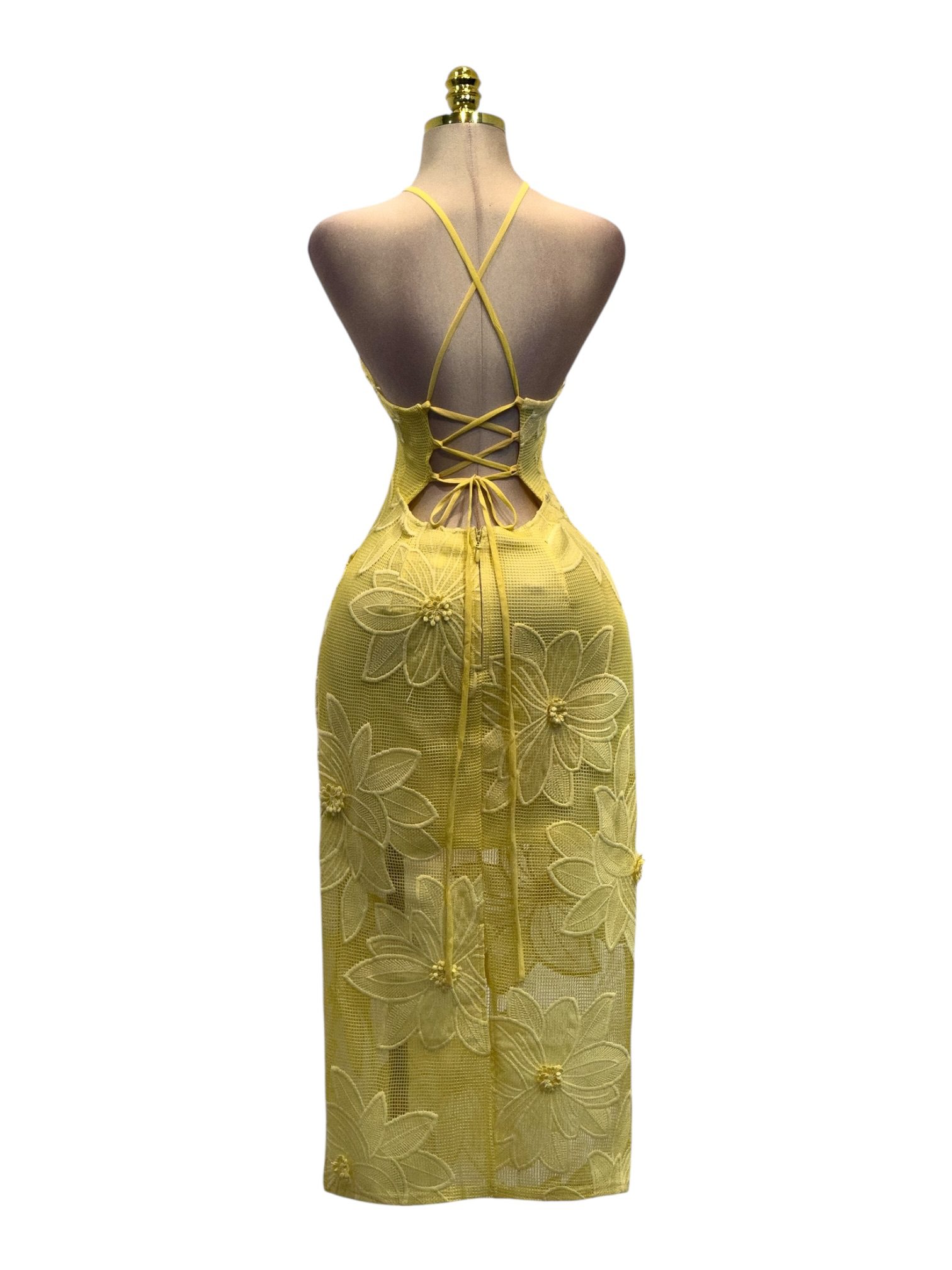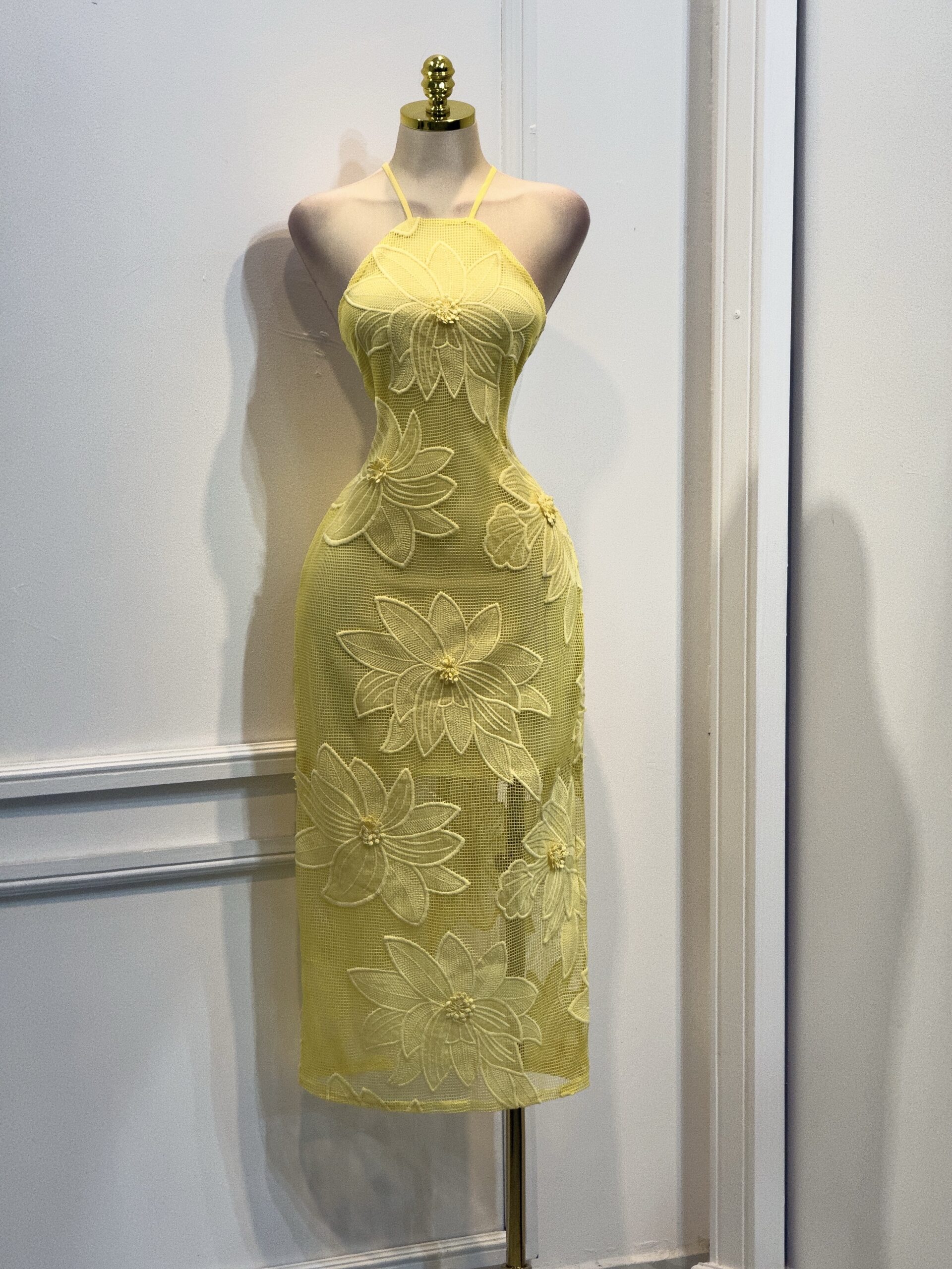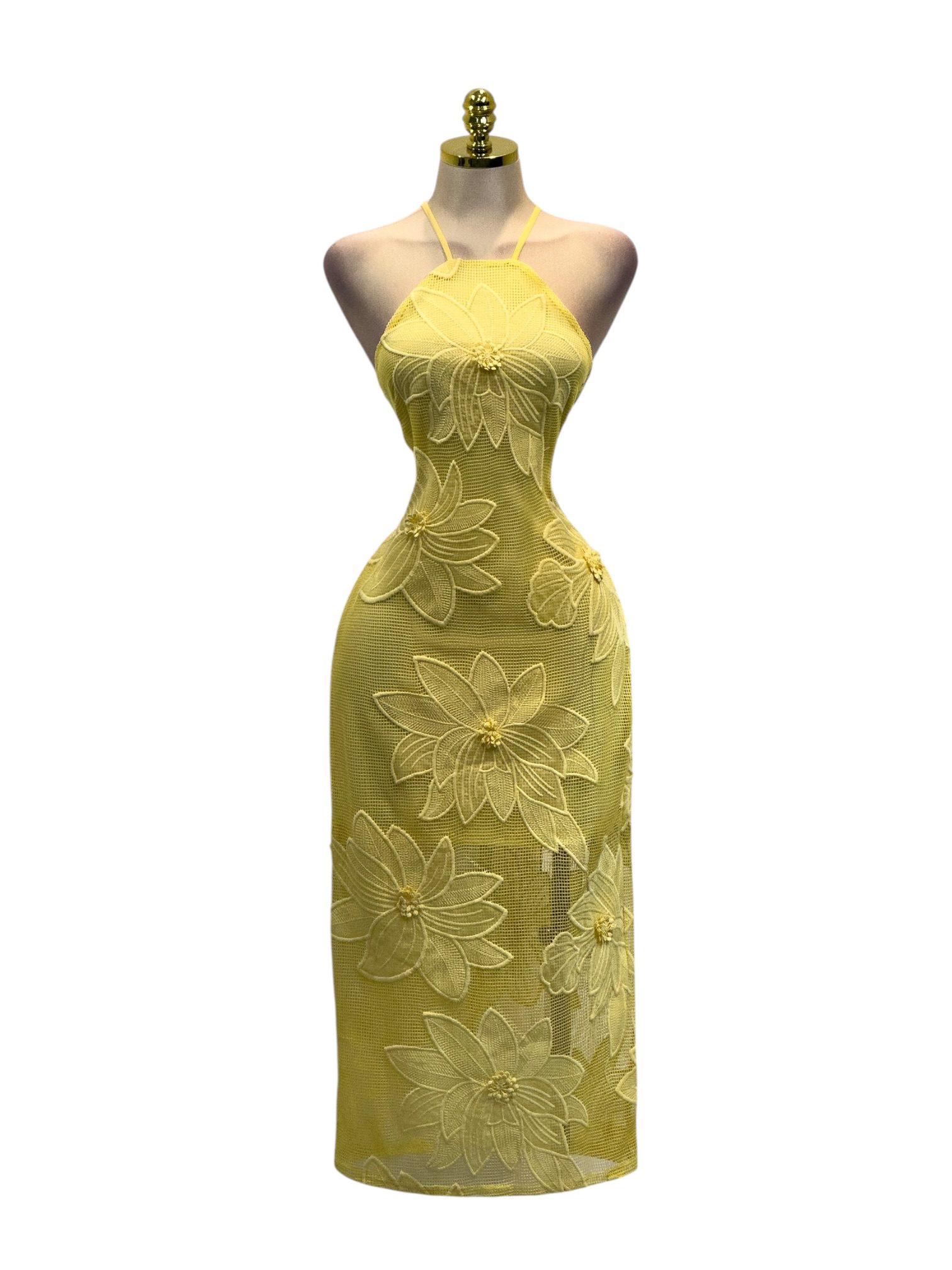 Vestido midi en color amarillo con escote halter y diseño sin mangas que realza los hombros. Elaborado con delicado tejido con aplicaciones florales en relieve que aportan textura y un estilo femenino. Su corte entallado estiliza la silueta, ideal para eventos especiales o celebraciones elegantes.