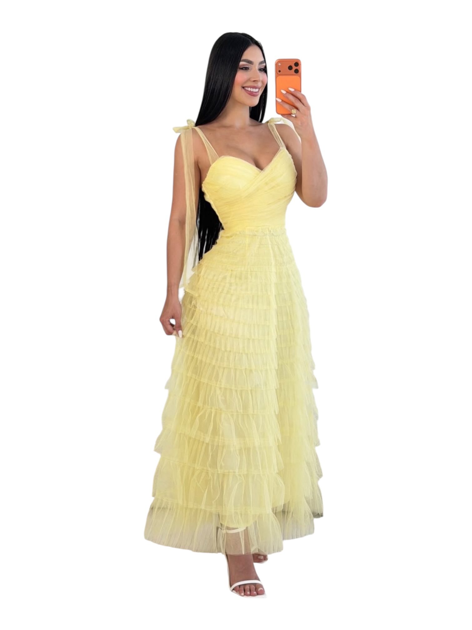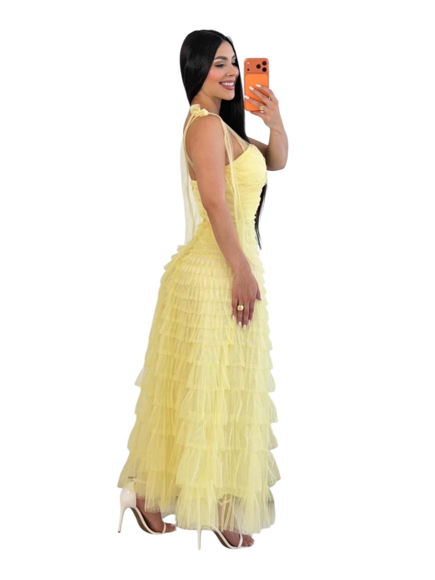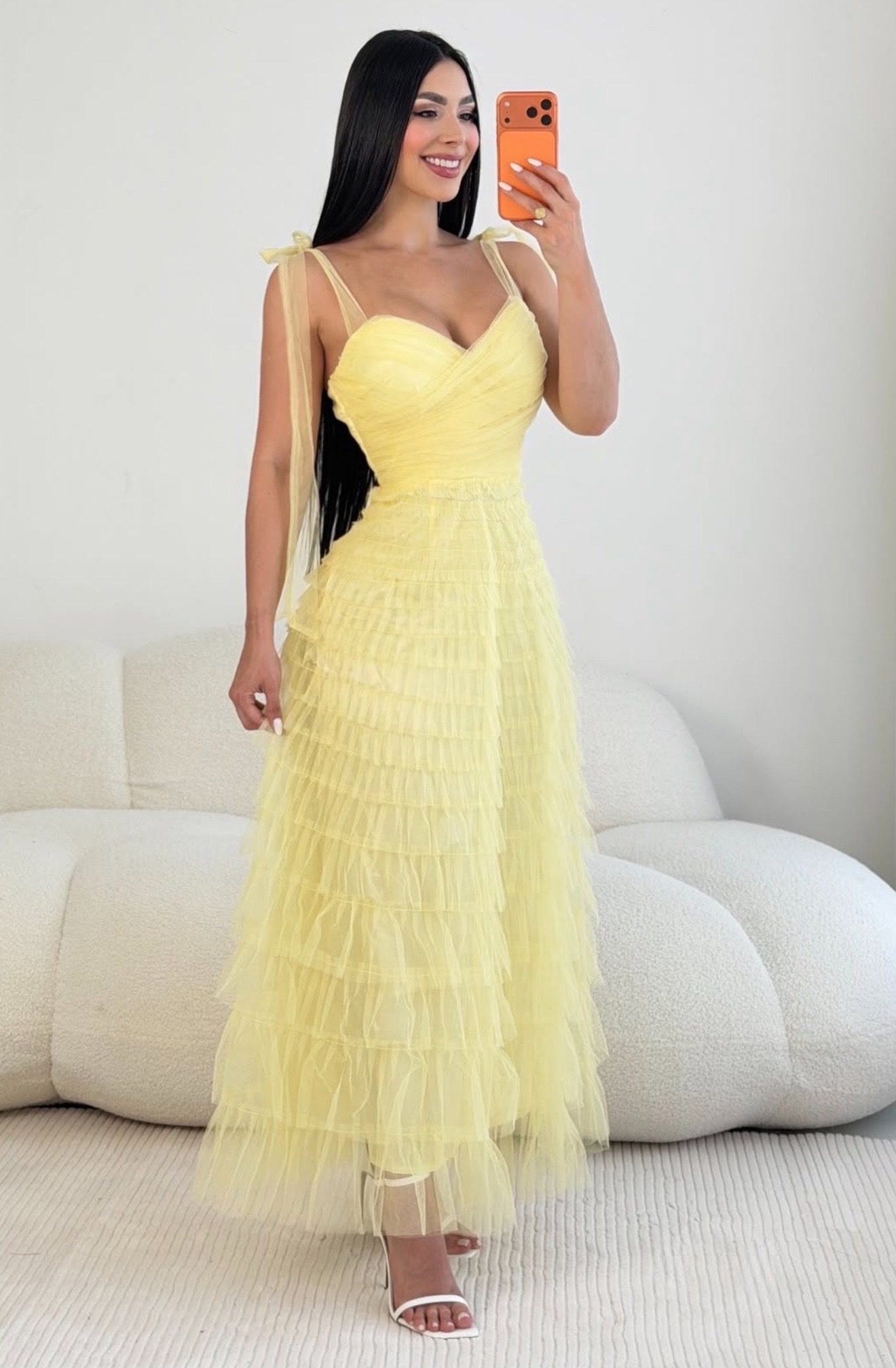 Vestido Amarillo Pastel Con Falda De Olanes En Capas Y Tirantes Lazo