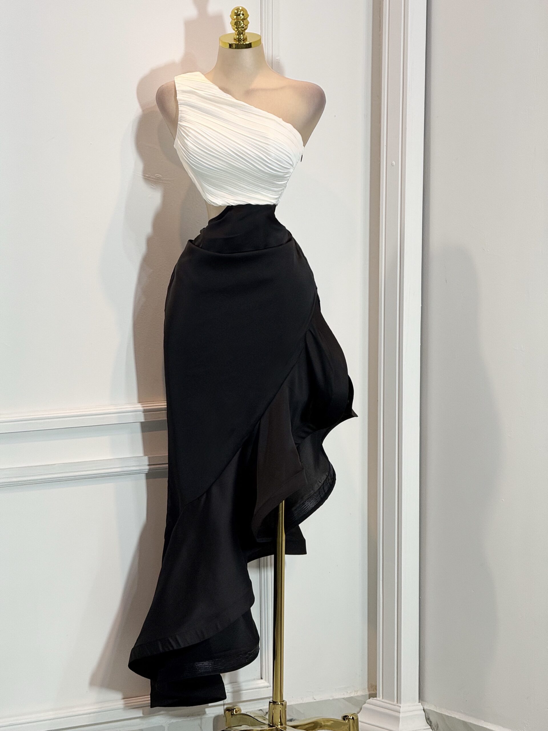 VESTIDO: LARGO BICOLOR BLANCO Y NEGRO ASIMÉTRICO DE UN HOMBRO