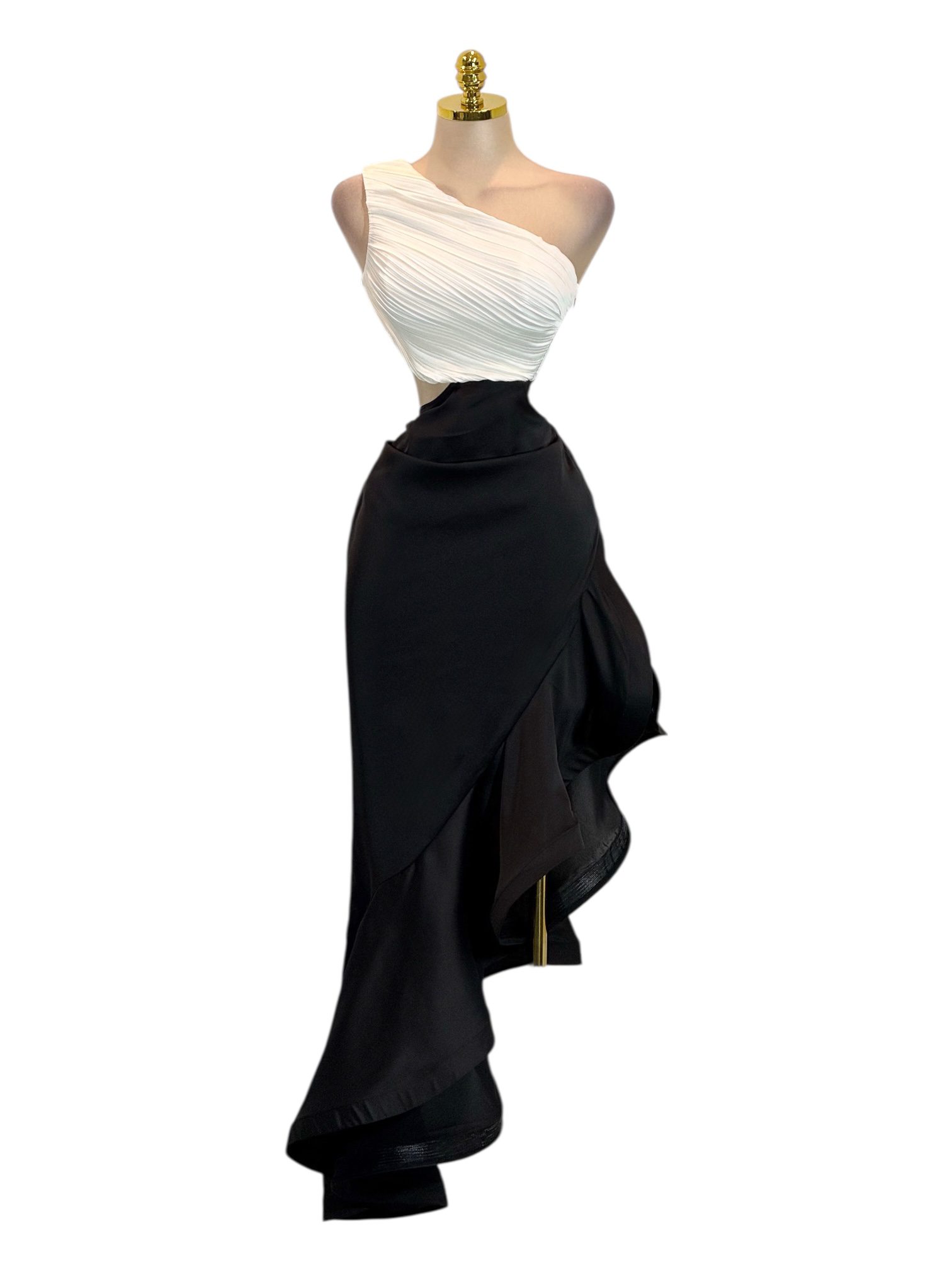 Vestido Asimétrico Blanco Y Negro De Un Hombro Con Falda De Olanes