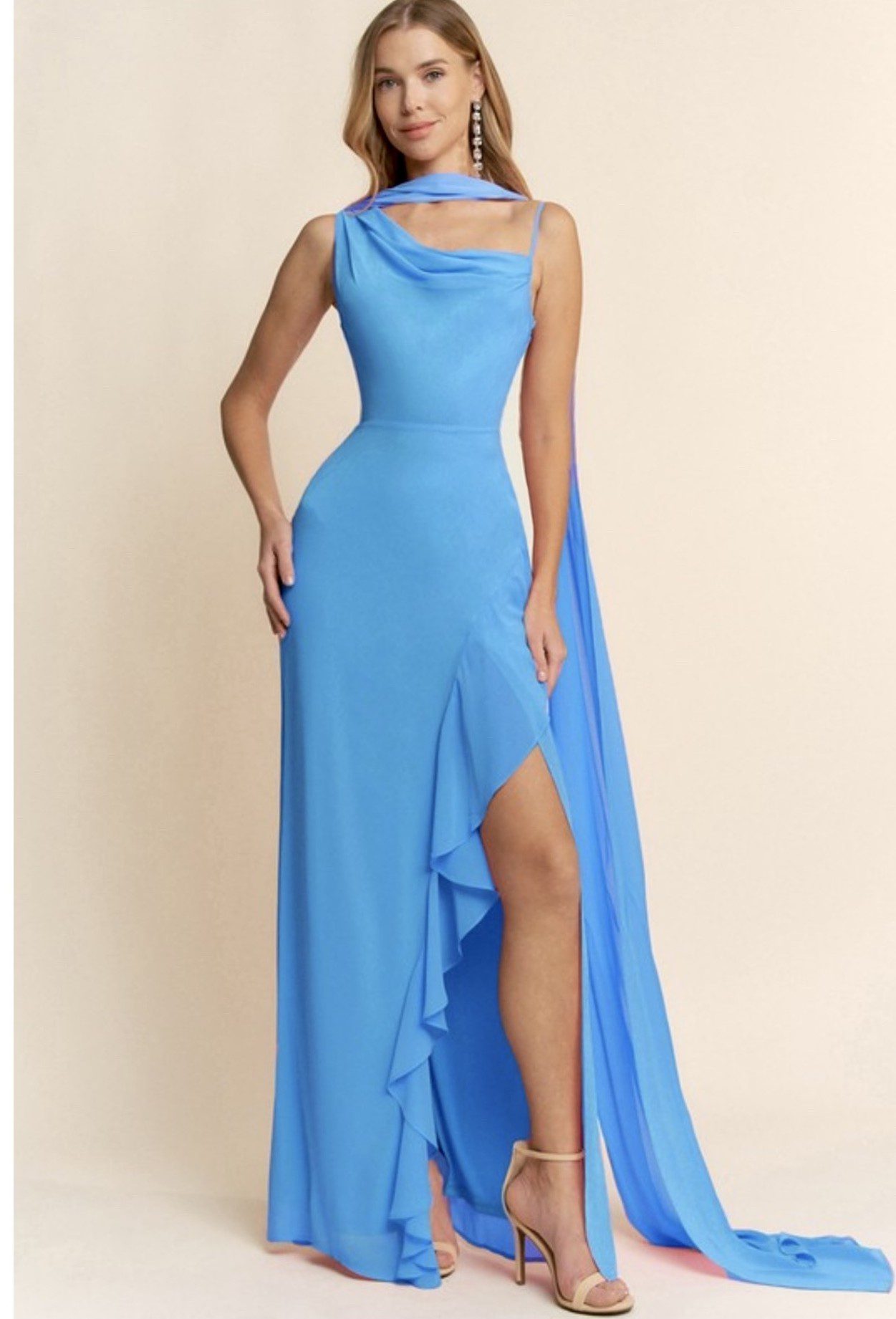 VESTIDO LARGO AZUL CELESTE CON ESCOTE ASIMÉTRICO Y ABERTURA FRONTAL