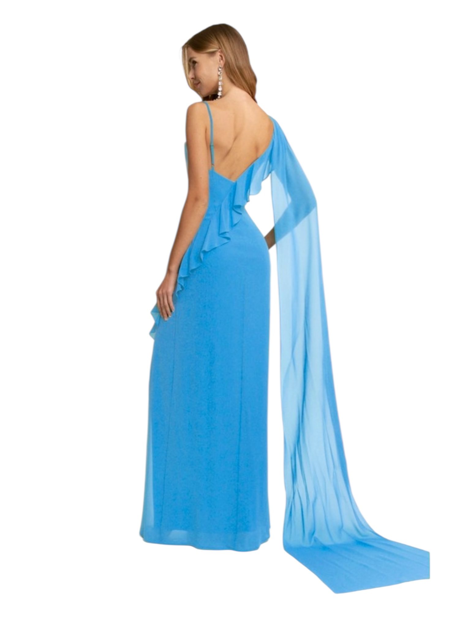 Vestido largo en tono azul celeste con escote asimétrico decorado que añade un toque de brillo. Su silueta entallada estiliza la figura, mientras que la abertura frontal en la falda y la capa fluida aportan movimiento y elegancia. Ideal para galas, alfombras rojas o eventos donde busques un look deslumbrante.