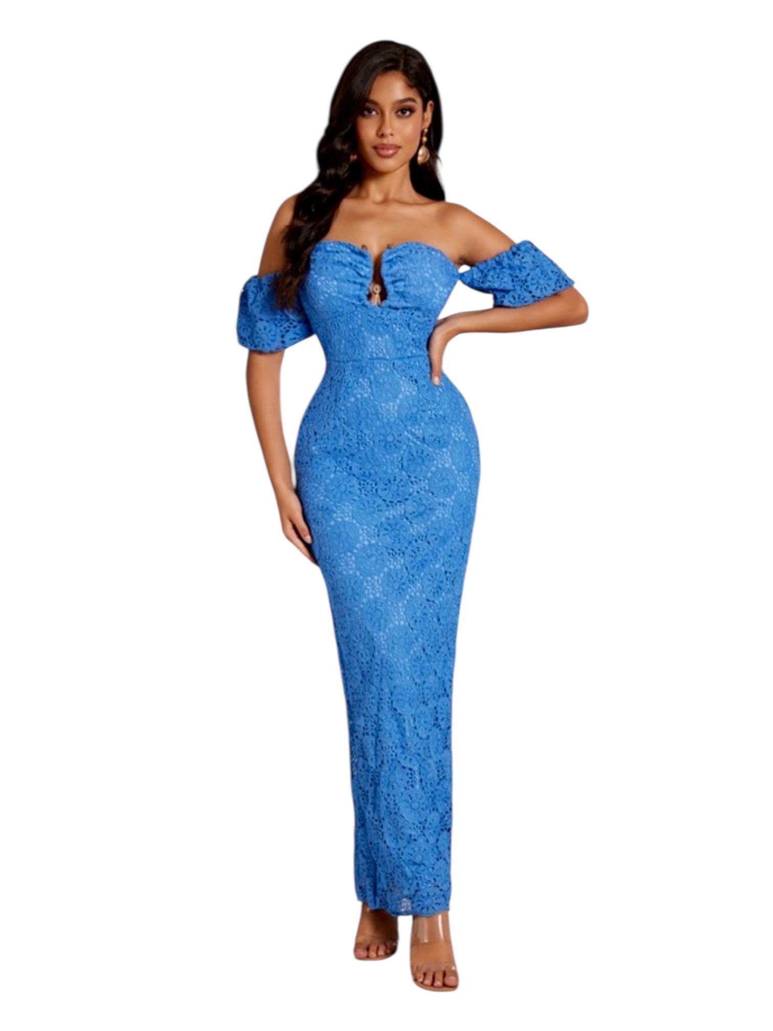 Vestido largo en tono azul con encaje floral que aporta textura y delicadeza. Presenta escote corazón con mangas caídas y lazo central que acentúa el busto. La silueta ajustada realza la figura, ideal para bodas, cenas formales o celebraciones con un estilo romántico y sofisticado.