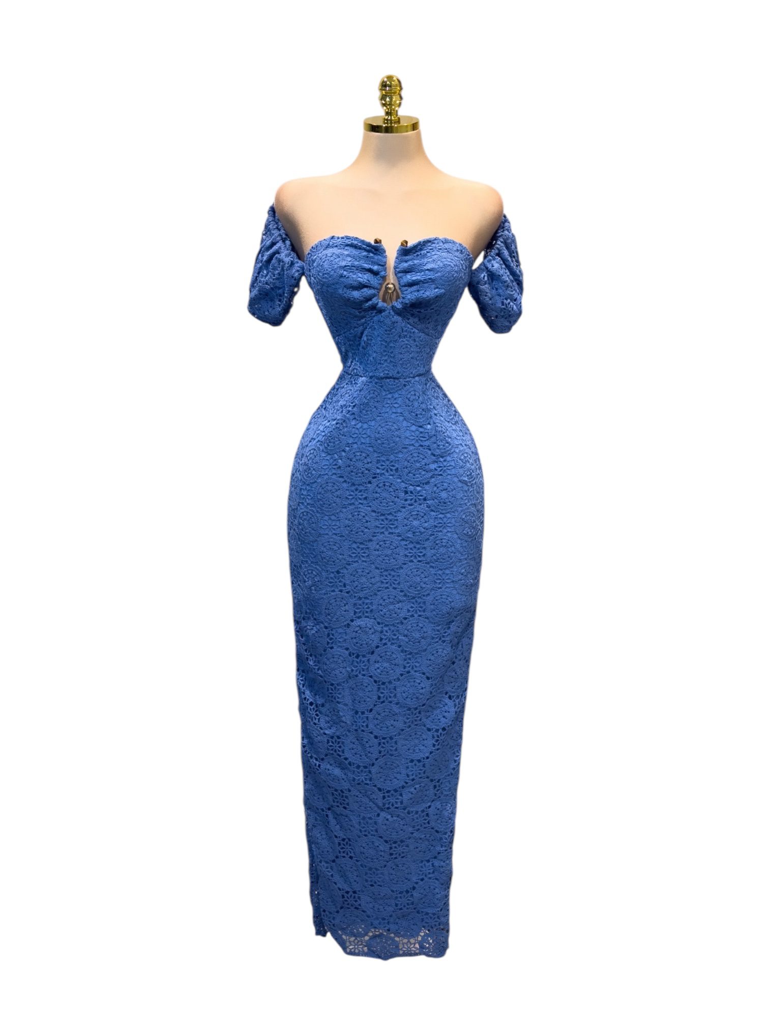 VESTIDO LARGO AZUL CON ENCAJE Y ESCOTE CORAZÓN