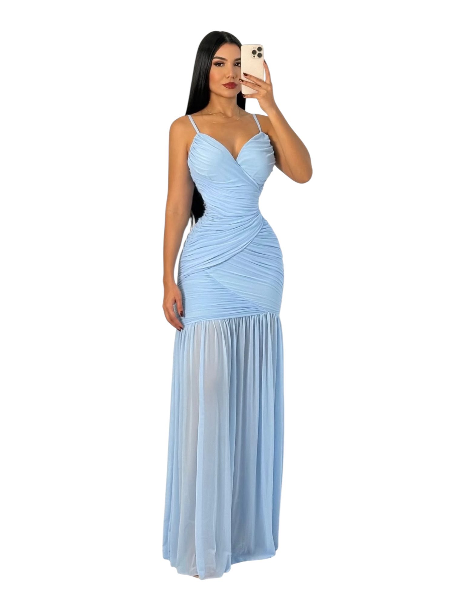 Vestido largo en tono azul cielo con tirantes delgados y escote en V cruzado. Diseño ajustado con drapeado que estiliza la figura y falda fluida tipo sirena con caída ligera. Ideal para eventos formales y ocasiones especiales.