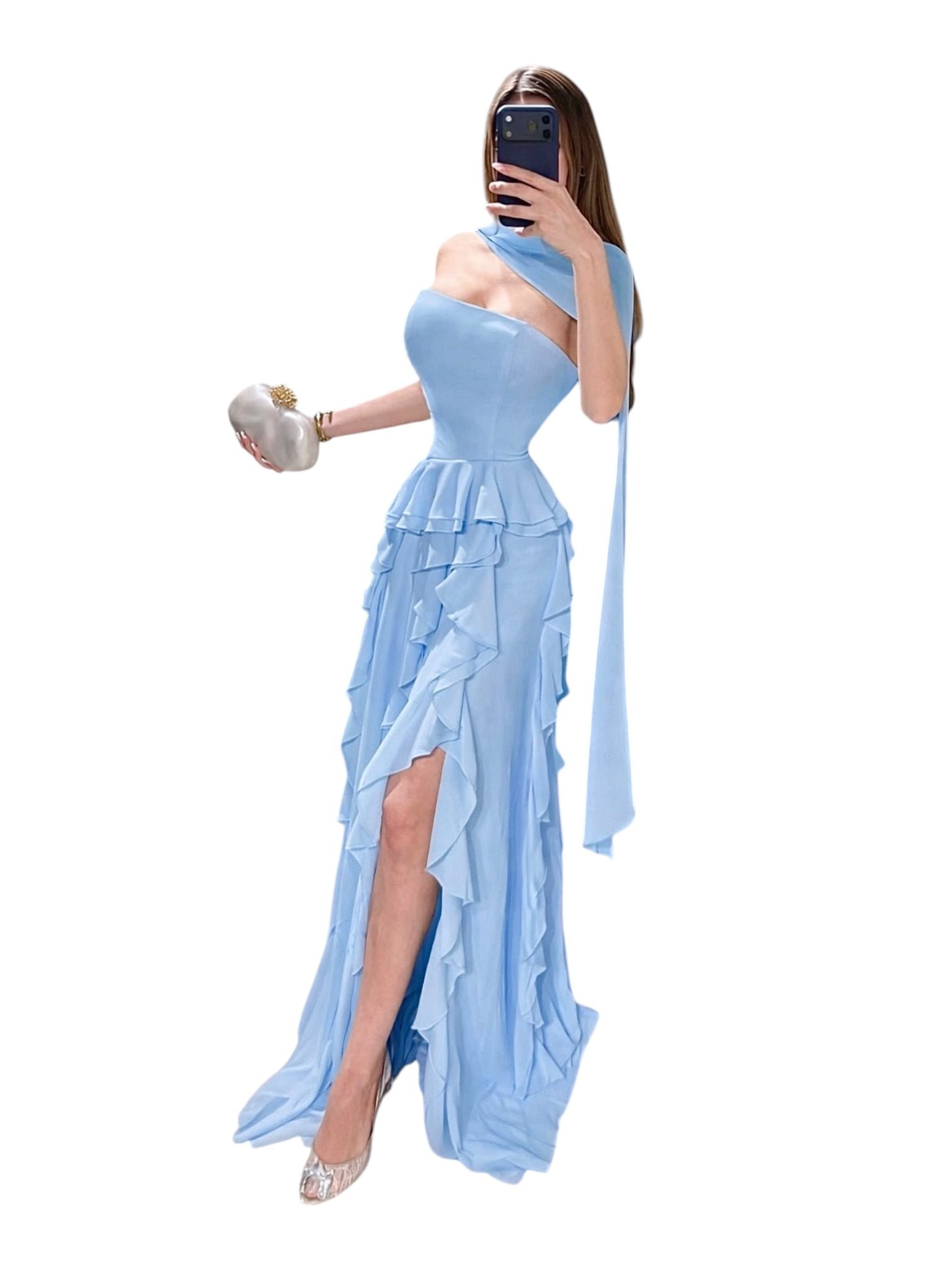 quantity Vestido Azul Cielo Strapless Con Capas De Volantes Y Chal Transparente