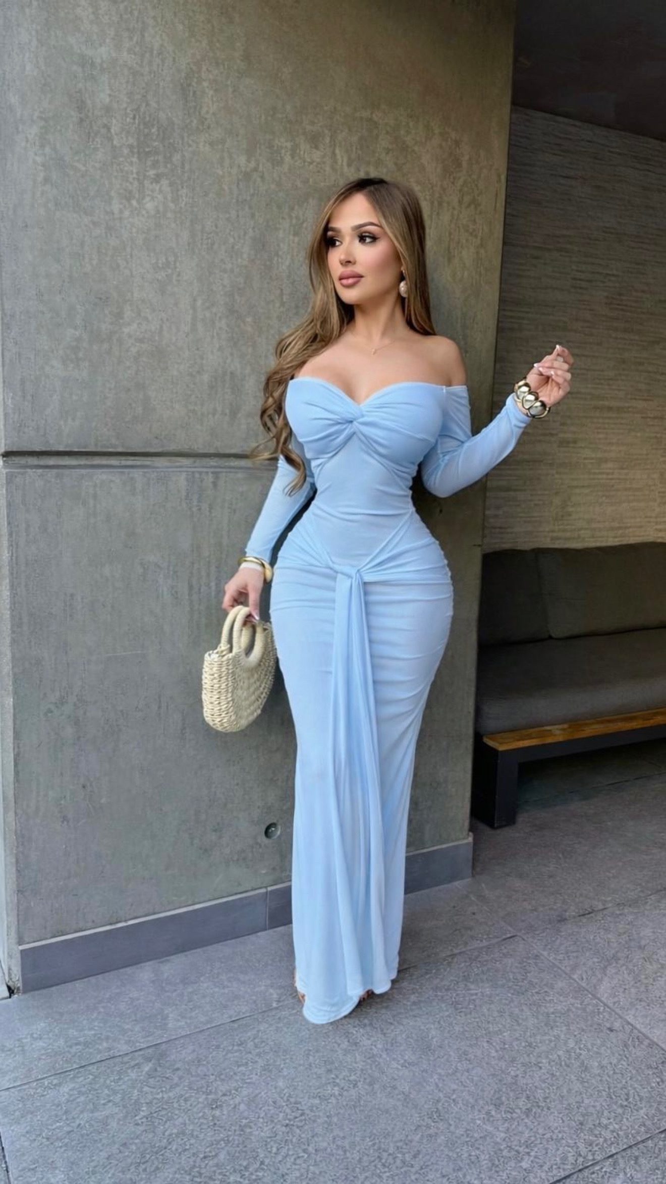 Vestido Azul Claro Con Fruncido Central Y Caída Suave