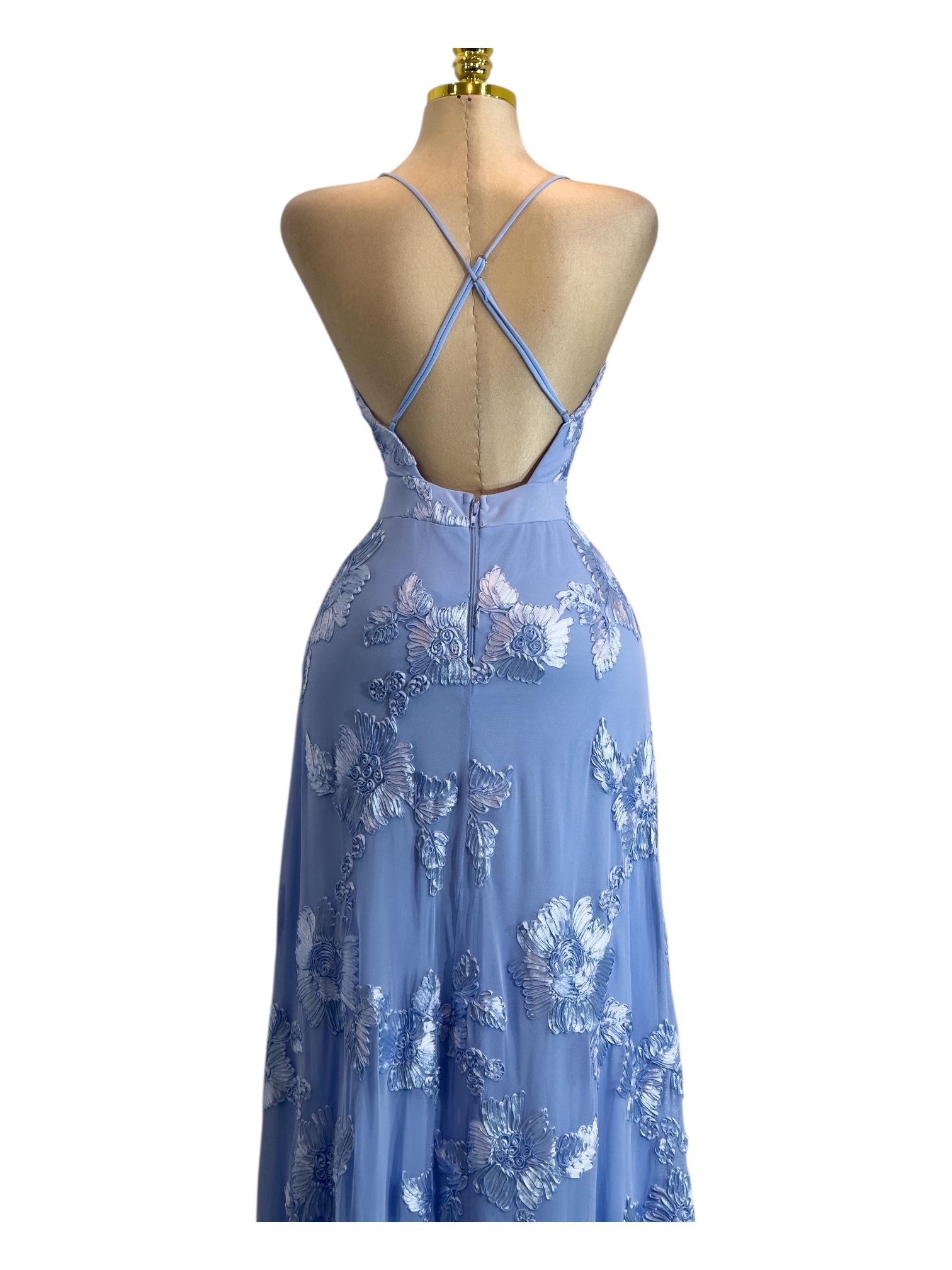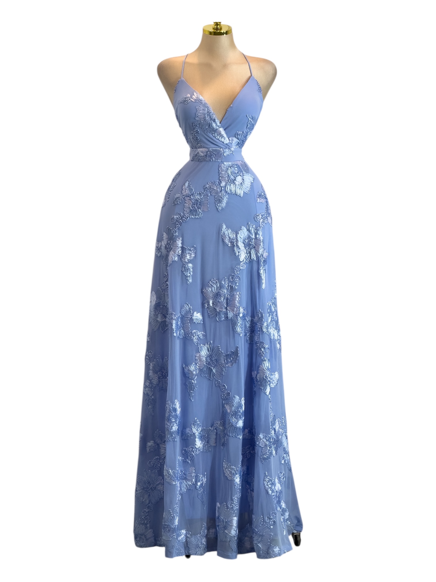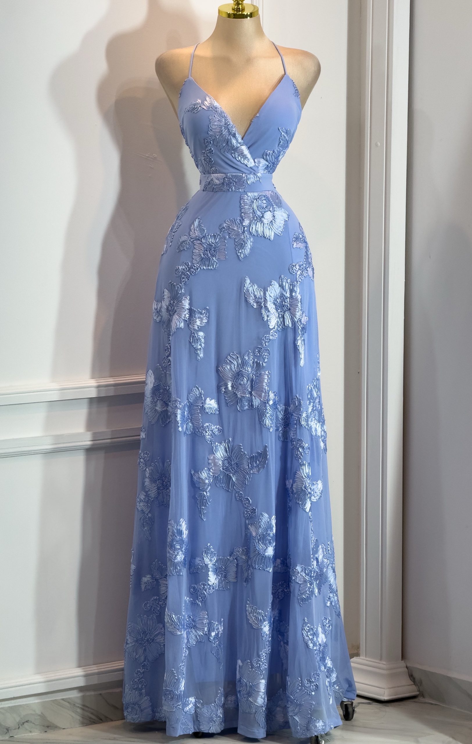 Vestido largo en tono azul con un diseño romántico y elegante. Presenta un escote en “V” cruzado que realza el busto con un acabado delicado y femenino, acompañado de tirantes delgados que estilizan los hombros. El cuerpo entallado define la cintura, mientras que la falda larga de caída suave destaca por sus aplicaciones florales bordadas que aportan textura, brillo sutil y un toque etéreo. Ideal para eventos especiales, bodas, galas o celebraciones donde busques lucir un look sofisticado, armonioso y de alto impacto visual.