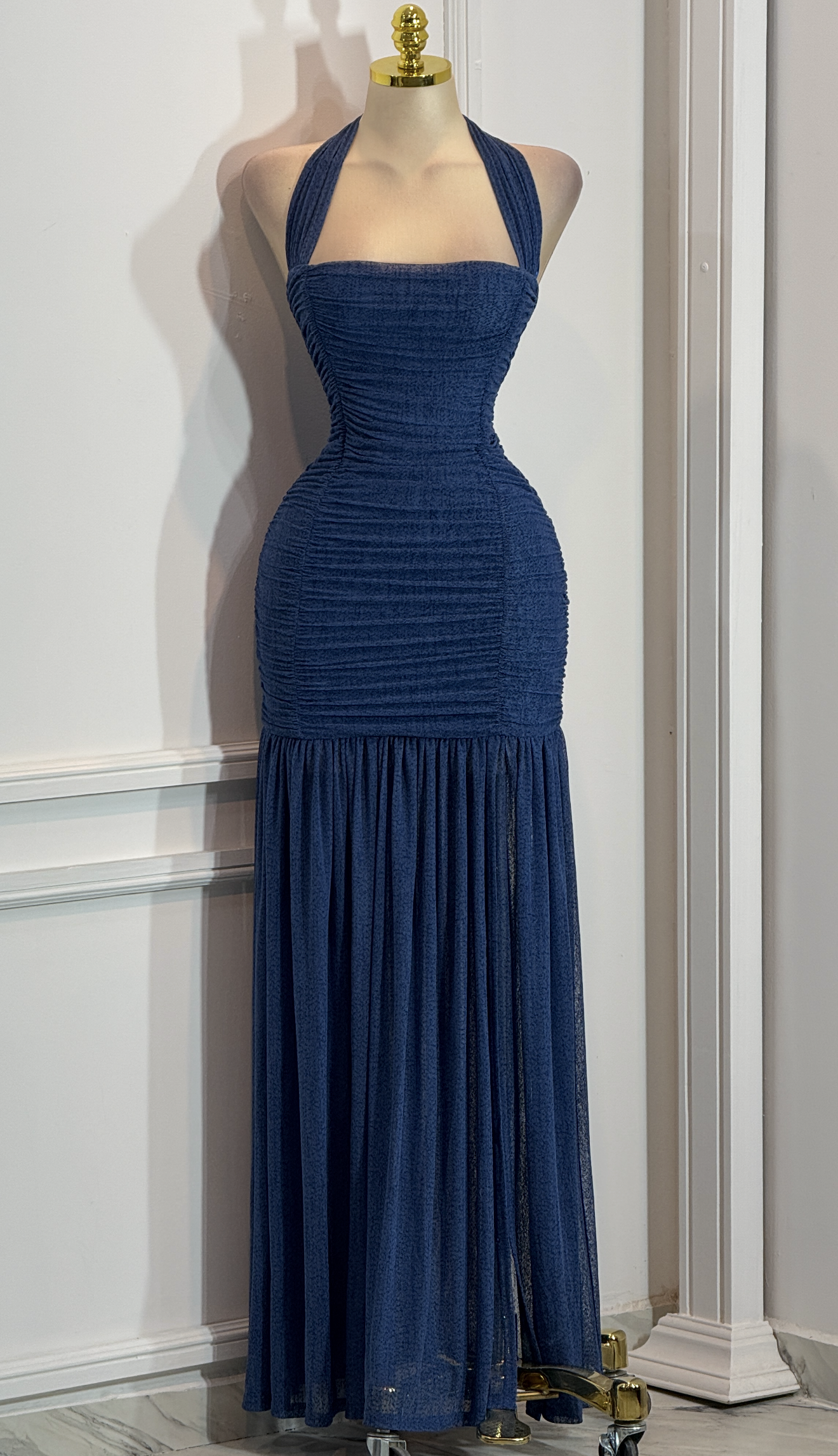 VESTIDO: LARGO AZUL CON ESCOTE HALTER Y FALDA PLISADA