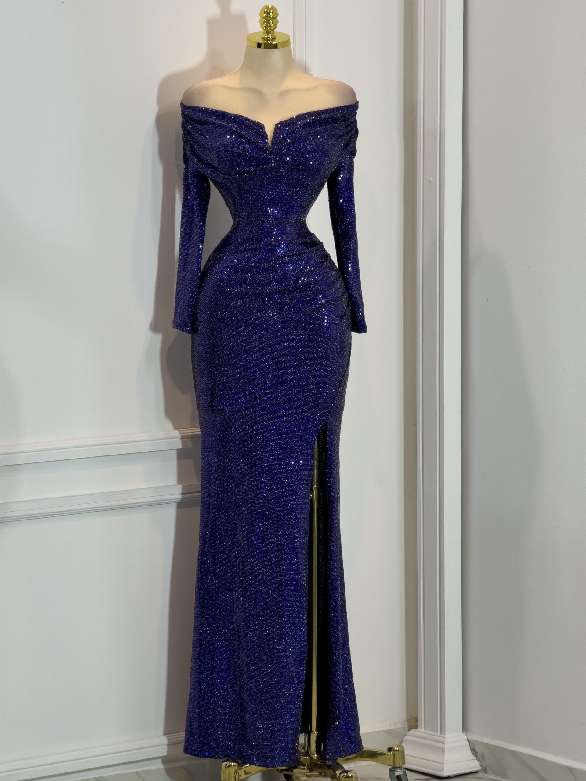 Vestido largo en tono azul cubierto de lentejuelas que aportan un brillo elegante y sofisticado. Presenta escote bardot que deja los hombros al descubierto, realzando el busto con delicadeza y feminidad. La silueta ajustada resalta las curvas, mientras que la abertura frontal en la falda añade un toque sensual y favorecedor. Ideal para galas, eventos formales o celebraciones nocturnas donde busques un look glamuroso, refinado y lleno de presencia.