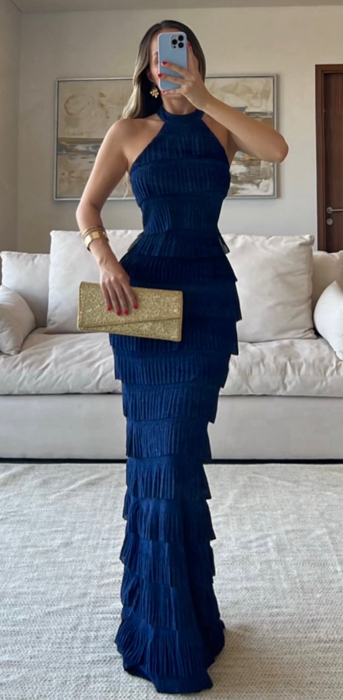 Vestido largo en tono azul con diseño halter que realza los hombros y aporta un estilo elegante y moderno. El cuerpo entallado moldea la silueta de forma favorecedora, mientras que la falda con volantes en capas crea un efecto dramático, fluido y muy sofisticado. Ideal para eventos especiales, galas o noches donde busques un look impactante, femenino y de alto impacto visual.