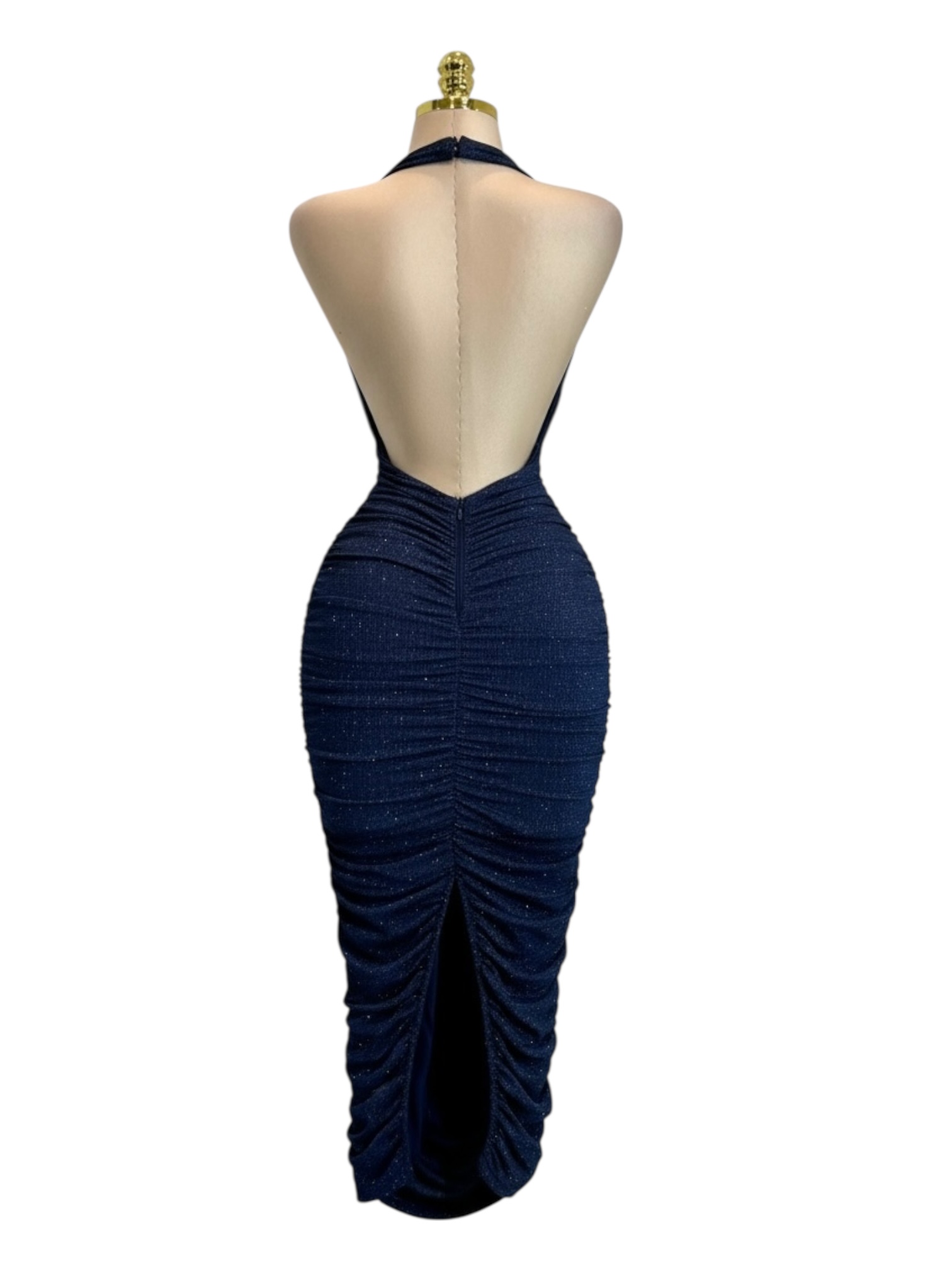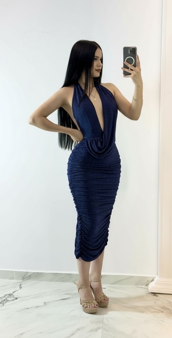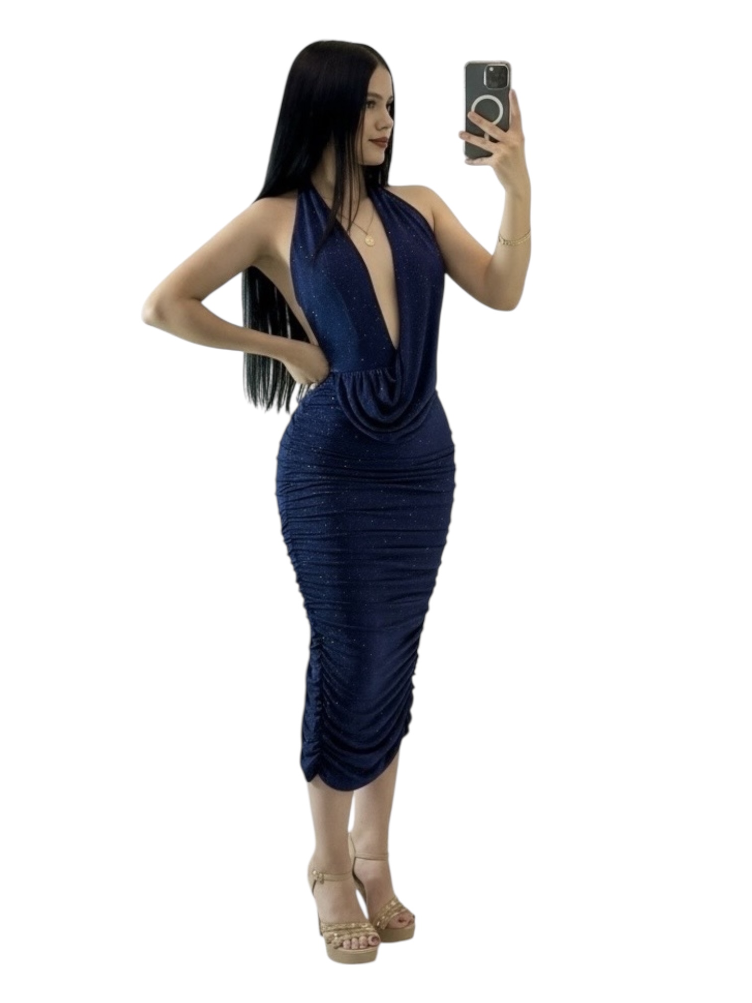 Vestido midi en tono azul con un escote pronunciado tipo halter que aporta un toque sensual y moderno. El diseño presenta un drapeado fluido en el escote y frunces estratégicos a lo largo de la silueta, que estilizan y realzan la figura. La falda midi ajustada incluye frunces laterales que añaden textura y un acabado sofisticado. Una pieza llamativa y elegante, ideal para noches especiales, fiestas o eventos donde busques un look refinado, atractivo y de alto impacto visual.