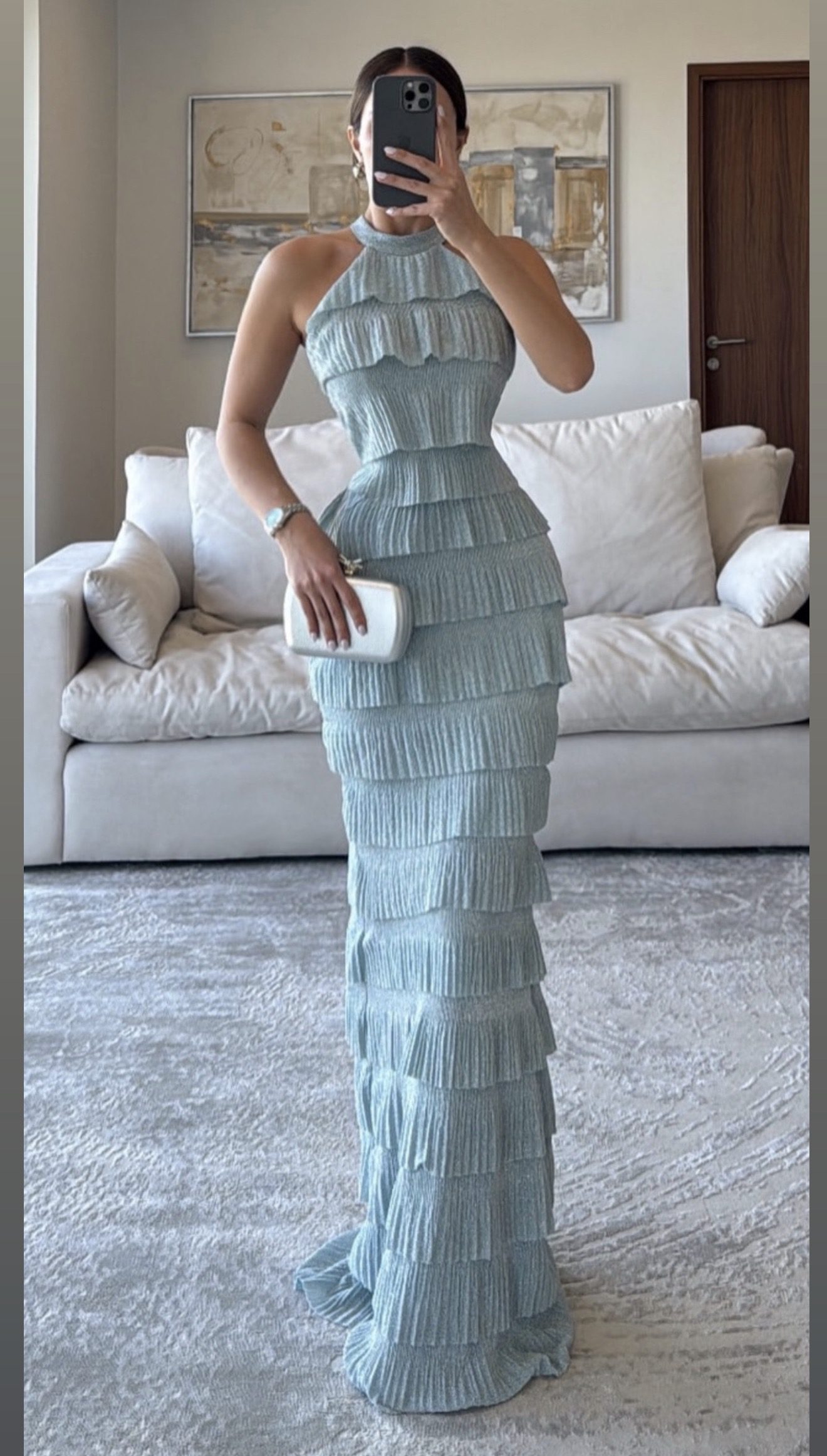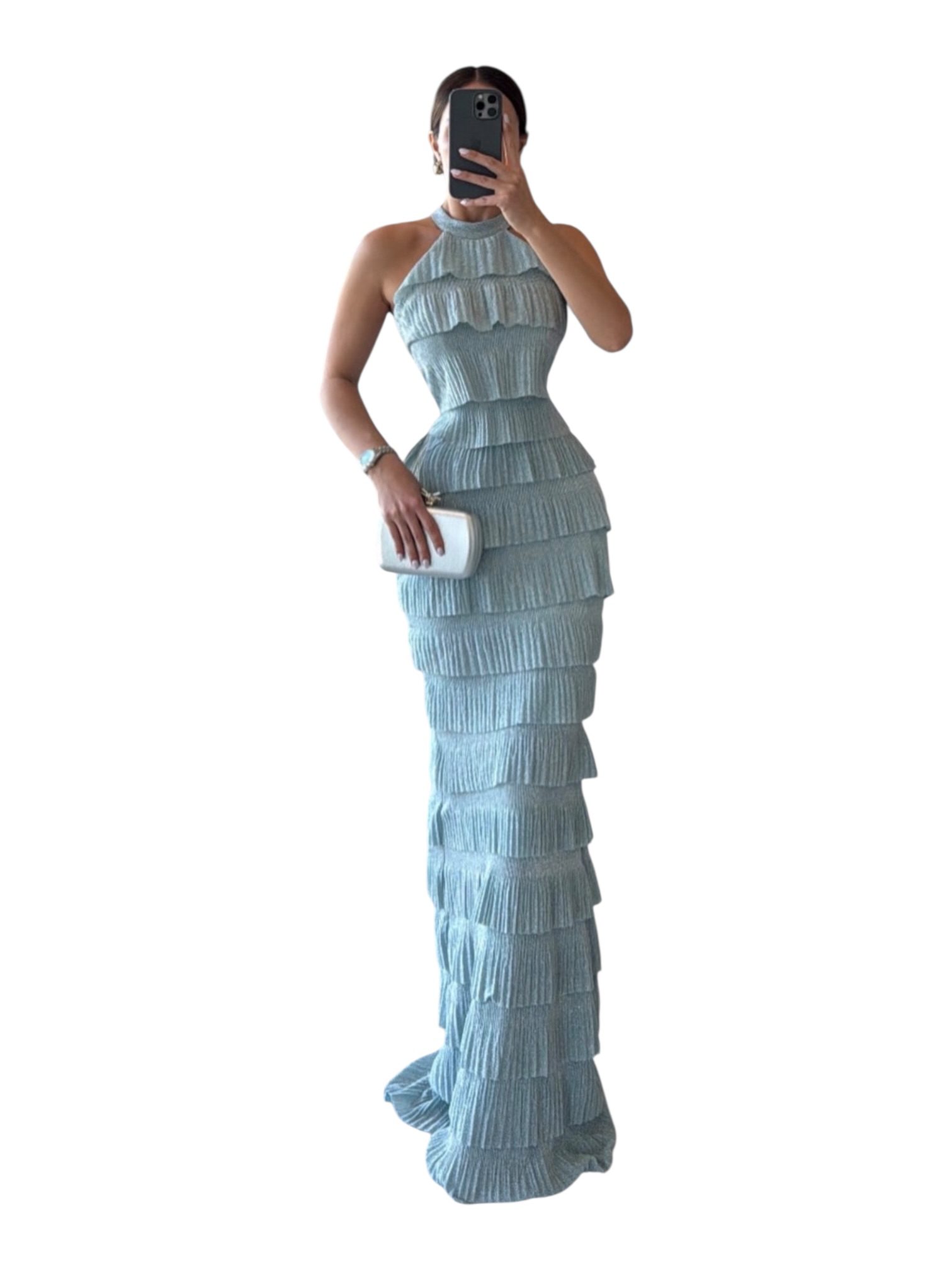 Vestido largo en tono azul claro con elegante diseño halter que estiliza los hombros y el cuello. Presenta delicados volantes en capas a lo largo del vestido que aportan textura, movimiento y un aire sofisticado. Su silueta ajustada realza la figura, ideal para eventos formales, celebraciones o ocasiones especiales.