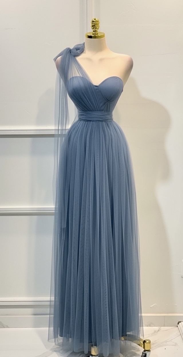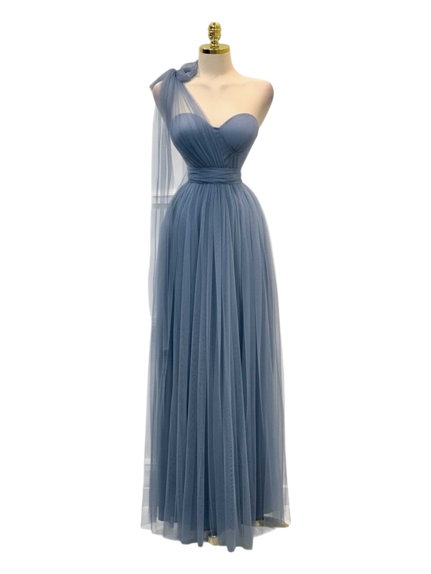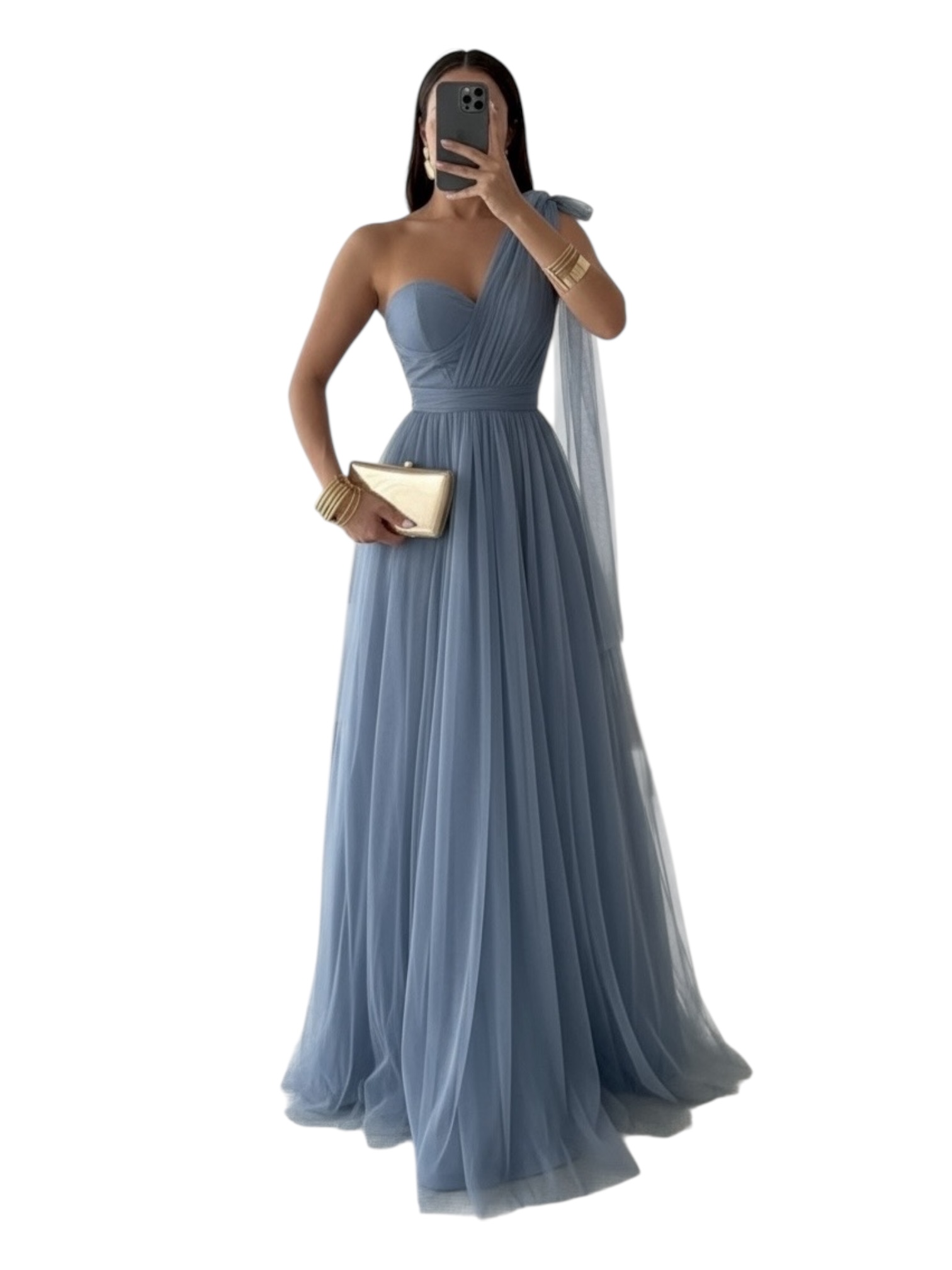 Vestido largo en tono azul confeccionado en tul suave de caída ligera que aporta un acabado etéreo y elegante. Presenta un diseño asimétrico de un solo hombro con un drapeado delicado que envuelve el busto y realza la figura con sofisticación. La cintura definida estiliza visualmente, mientras que la falda amplia y vaporosa otorga movimiento y un toque romántico. Ideal para bodas, galas o eventos formales donde busques un look refinado, delicado y lleno de encanto.