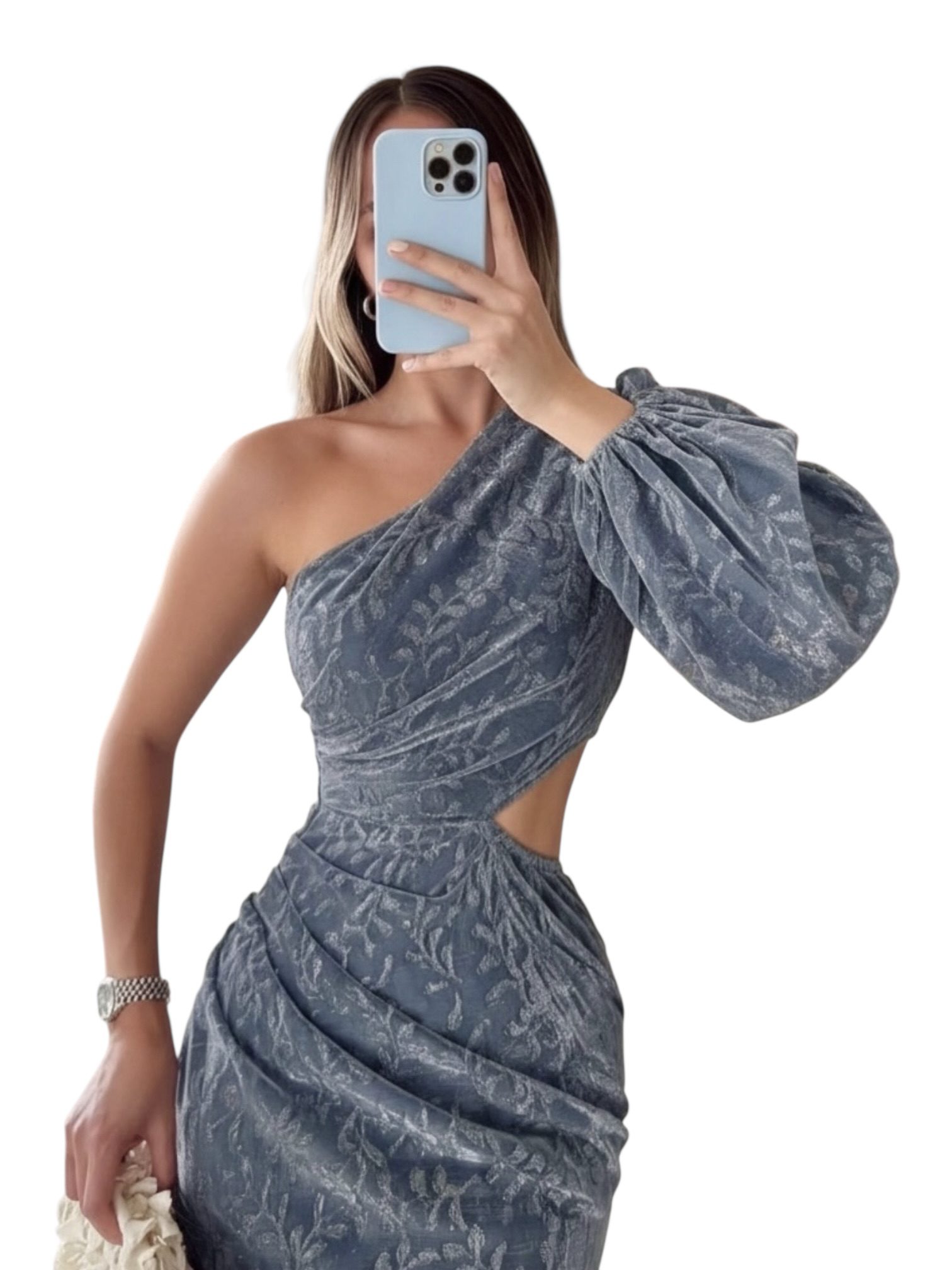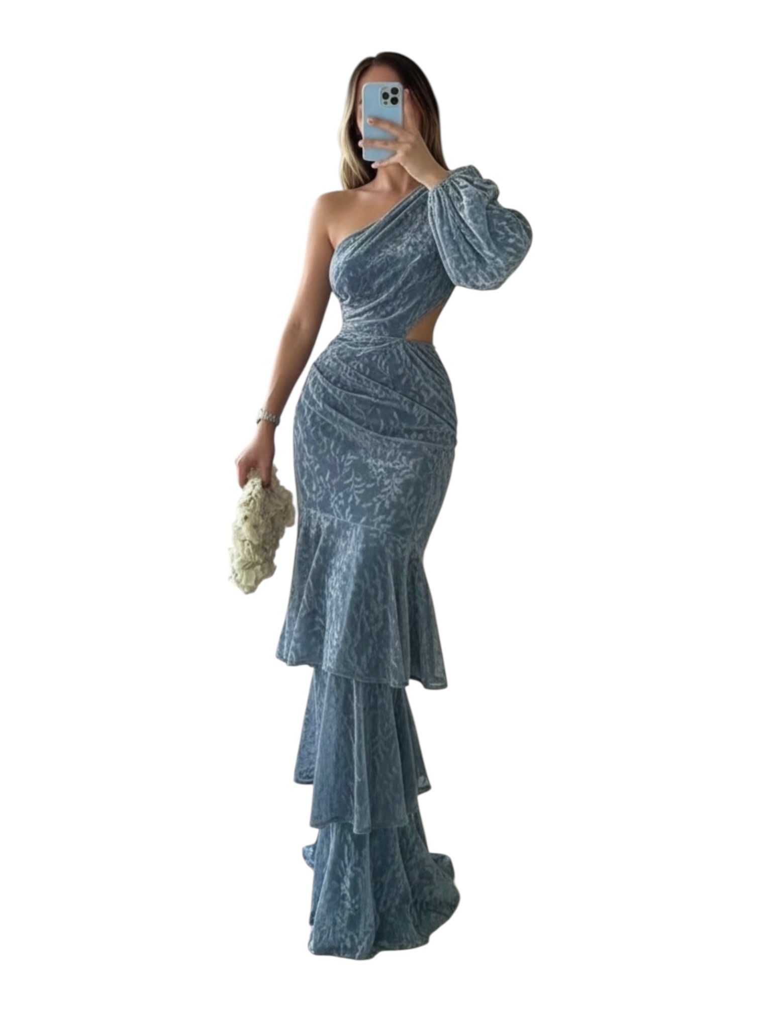 Vestido largo en tono azul grisáceo con elegante diseño asimétrico de un solo hombro y manga larga. Presenta delicado drapeado que realza la silueta, abertura lateral en la cintura y falda con volantes en capas que aportan movimiento y sofisticación. Ideal para eventos formales, galas o celebraciones especiales.