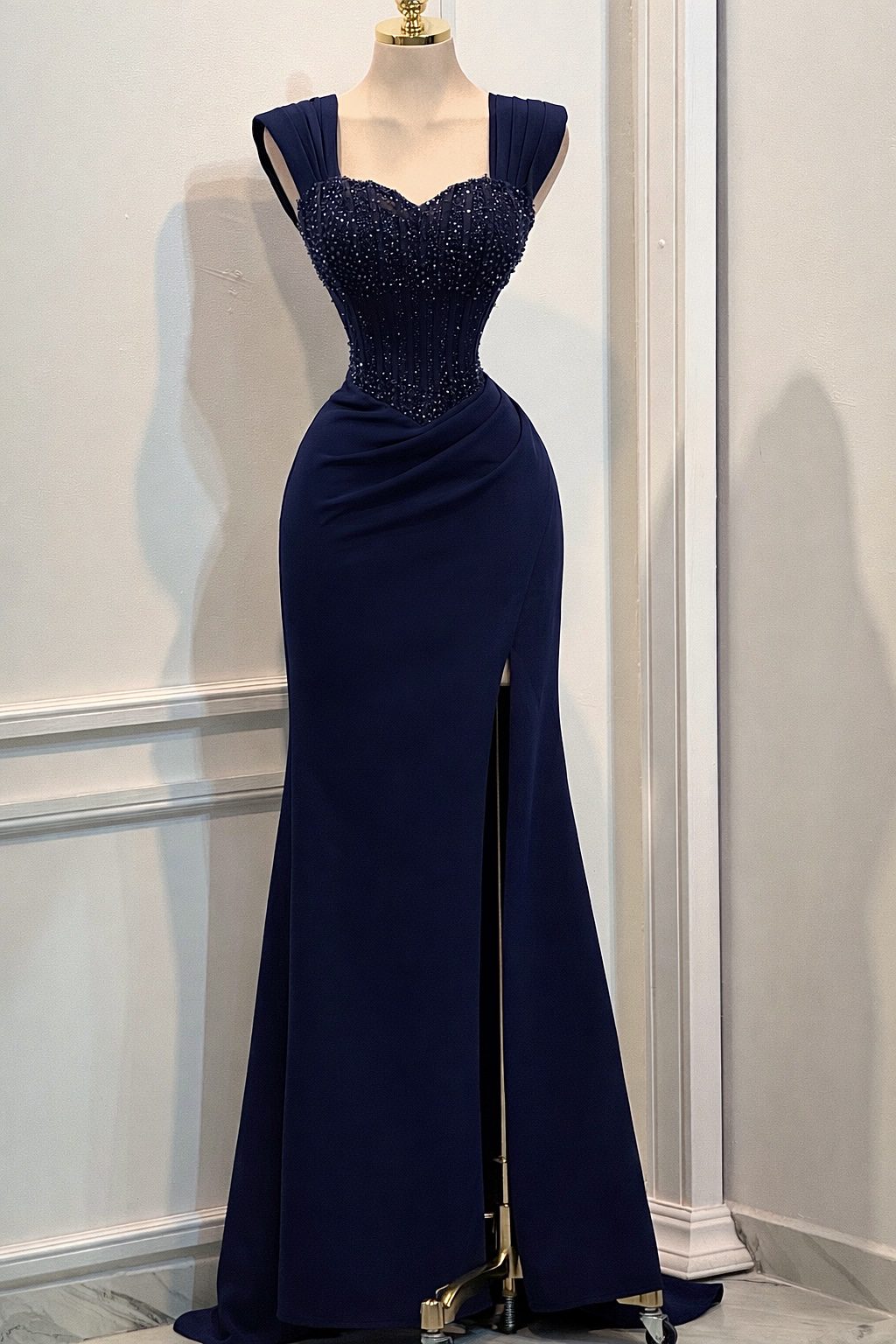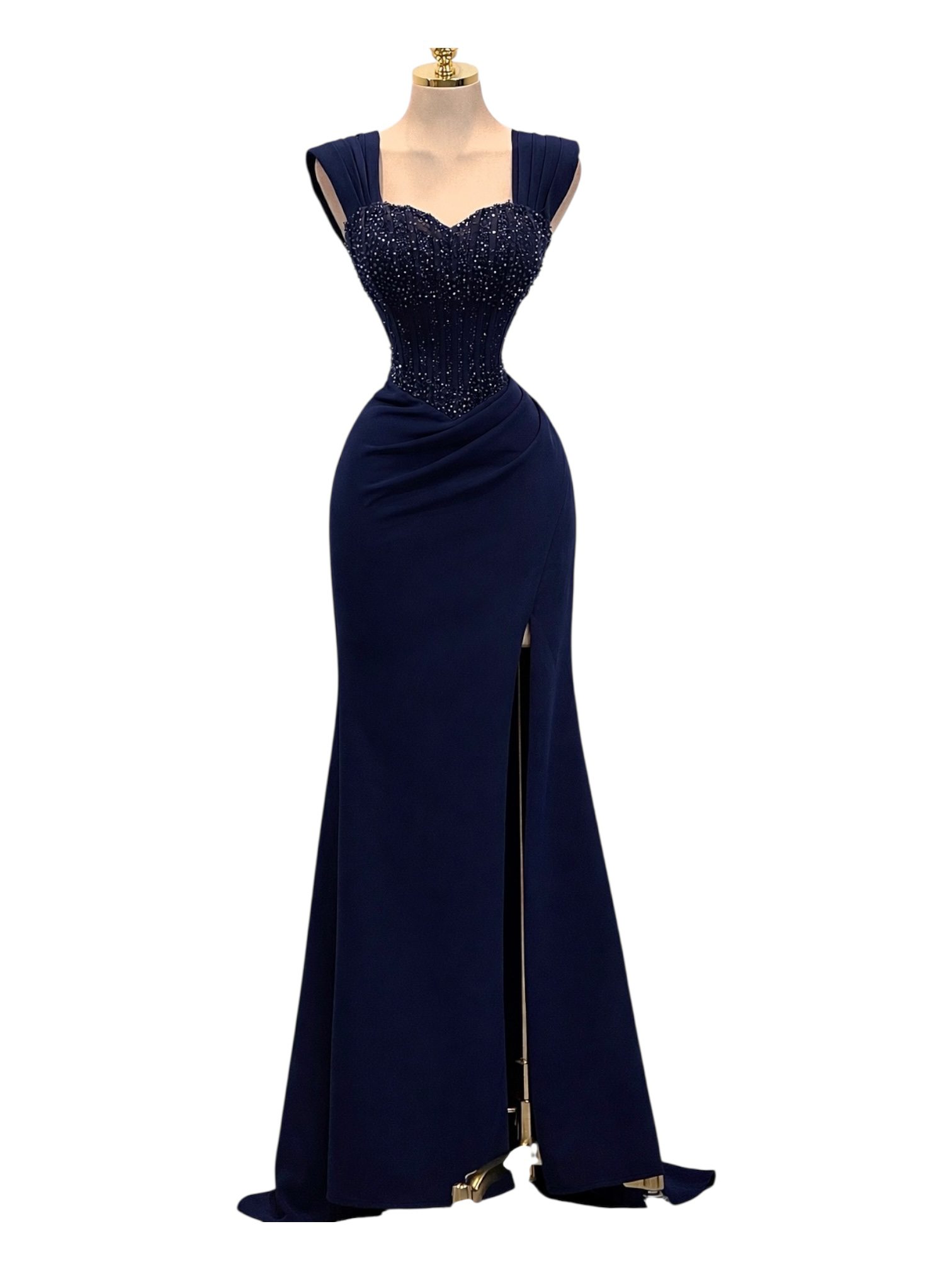Vestido largo en tono azul marino con diseño elegante. Presenta escote corazón, tirantes anchos, corte tipo corset con aplicaciones brillantes y abertura frontal que estiliza la silueta. La falda de caída fluida aporta un acabado sofisticado. Ideal para eventos formales, galas y ocasiones especiales.