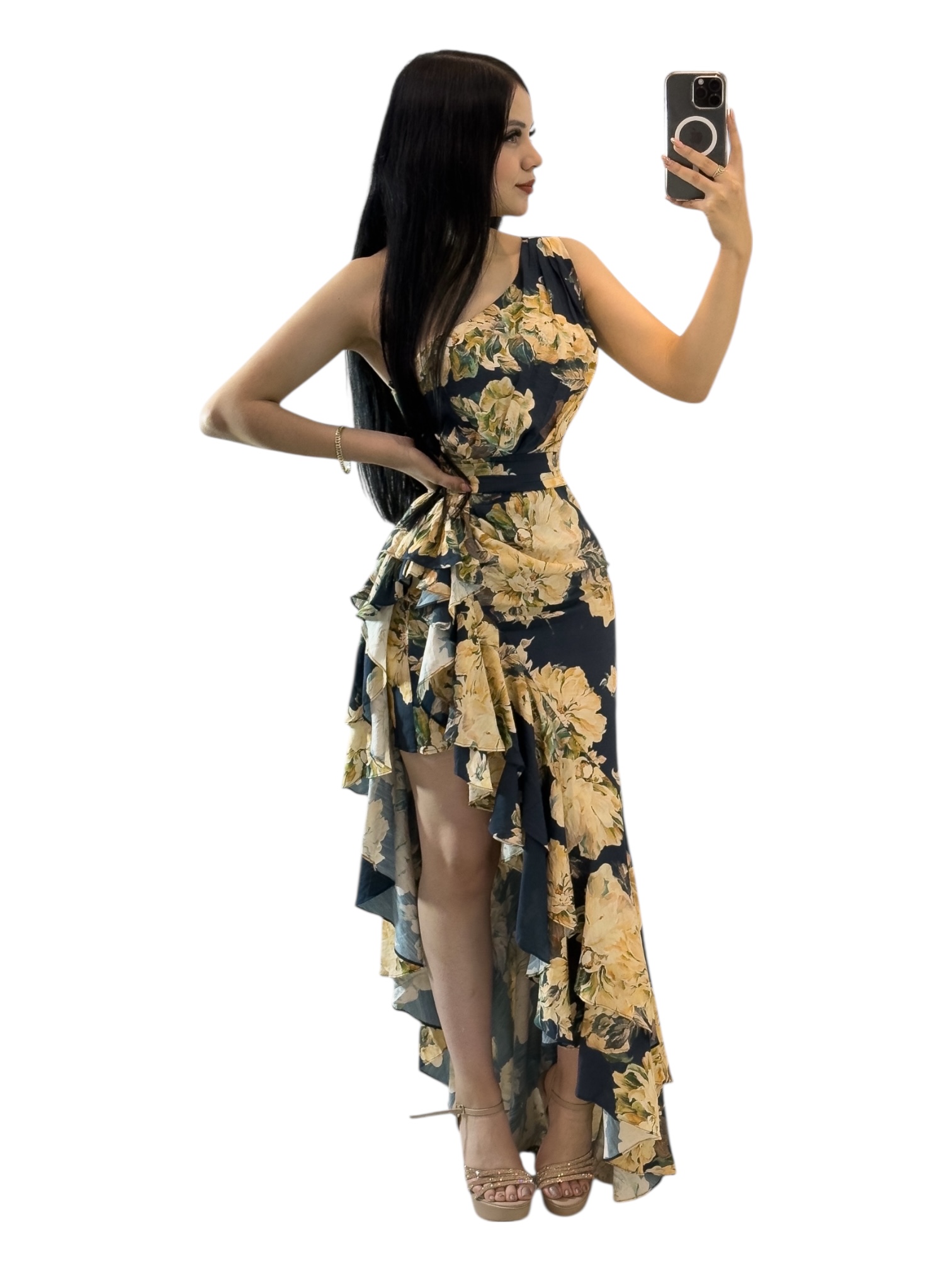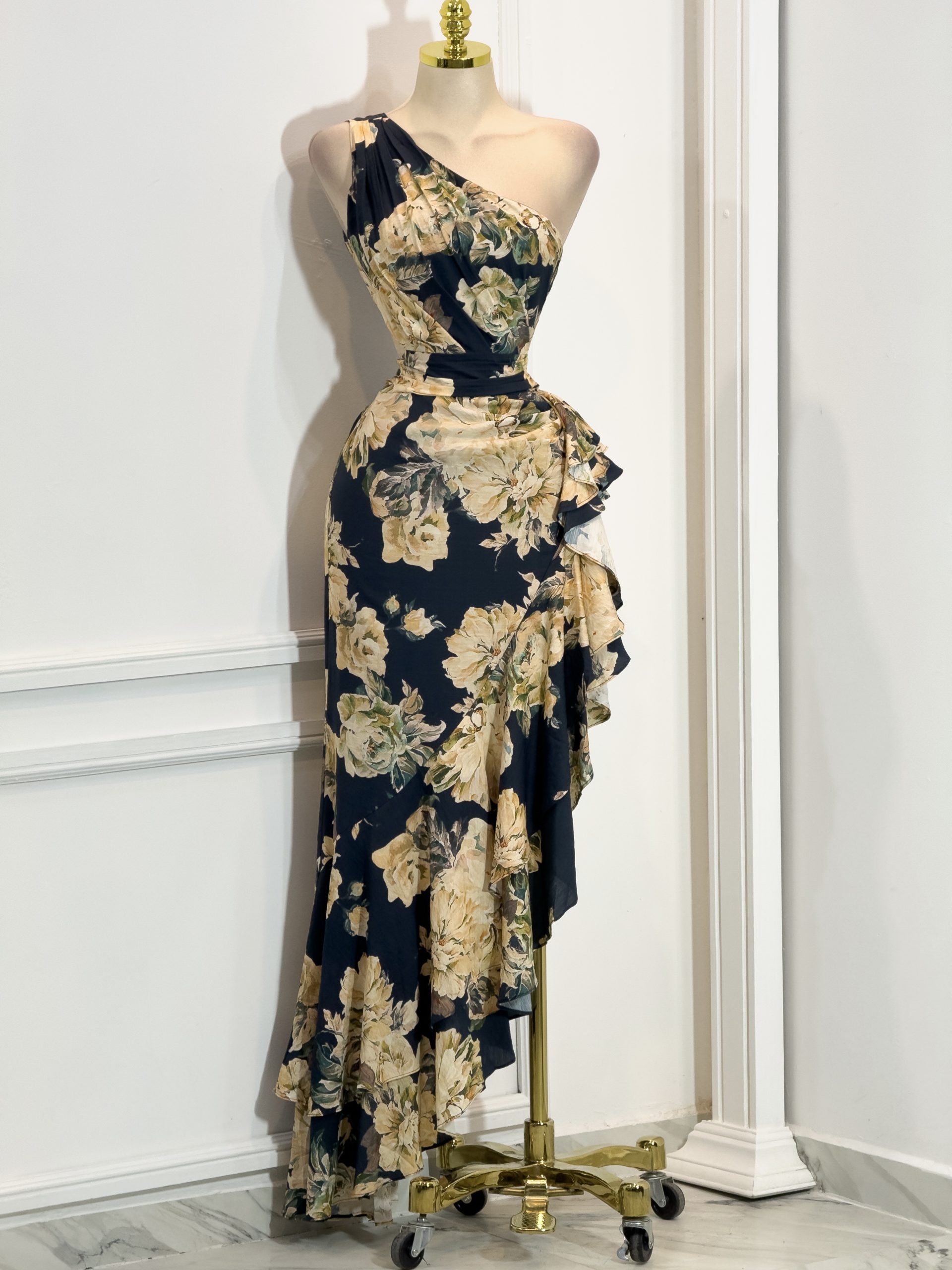 Vestido midi con estampado floral, con un diseño femenino y elegante conforme a la imagen. Presenta un escote asimétrico de un solo hombro que aporta un toque moderno y estilizado, dejando el otro hombro descubierto de manera sutil. El cuerpo se ajusta delicadamente a la silueta y se define en la cintura con un drapeado lateral que realza la figura de forma favorecedora.