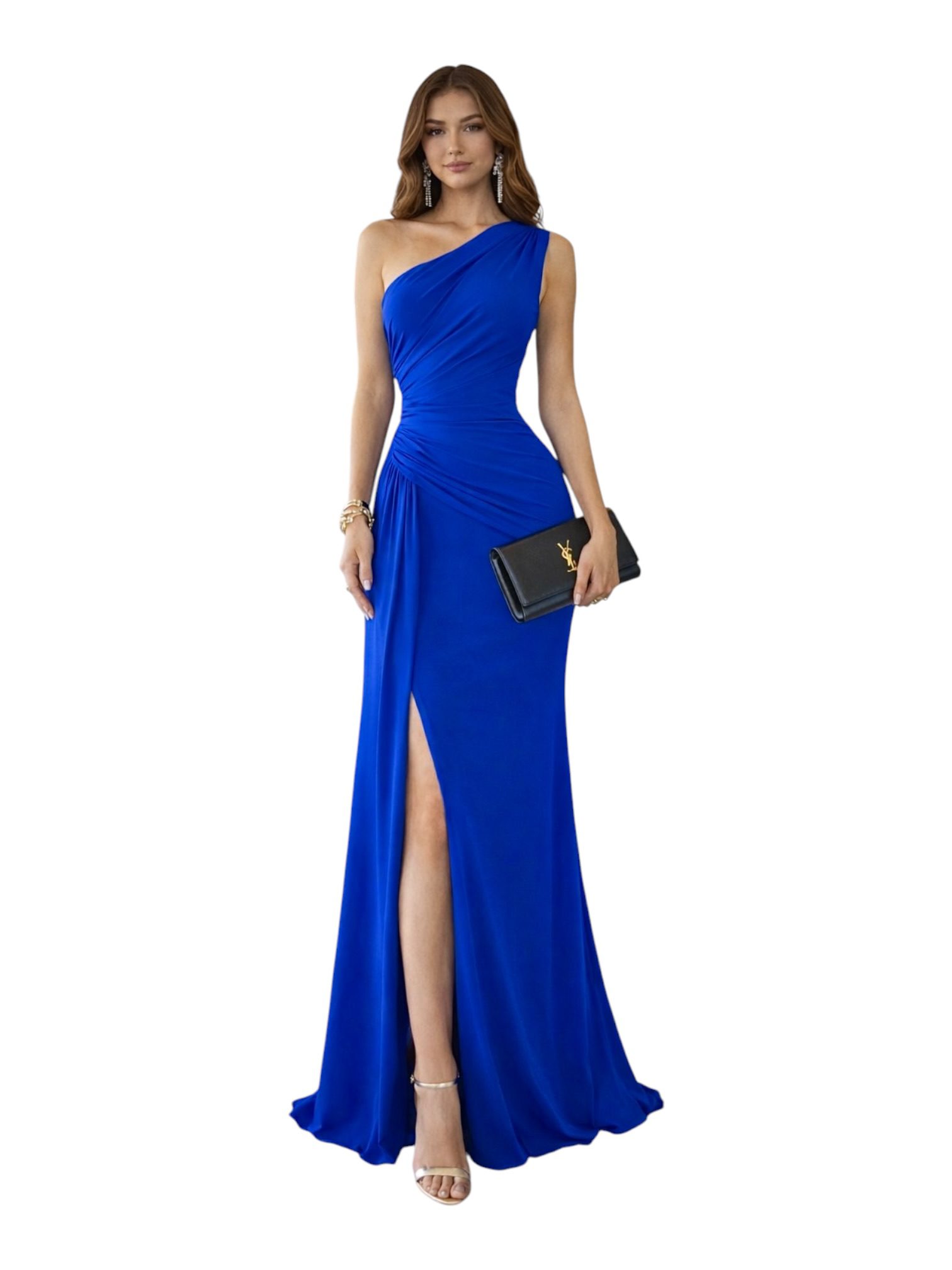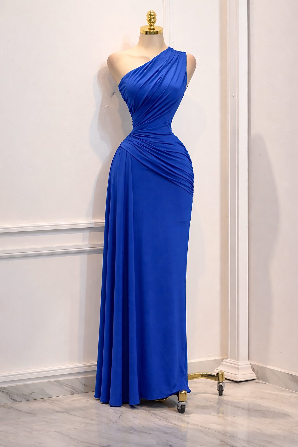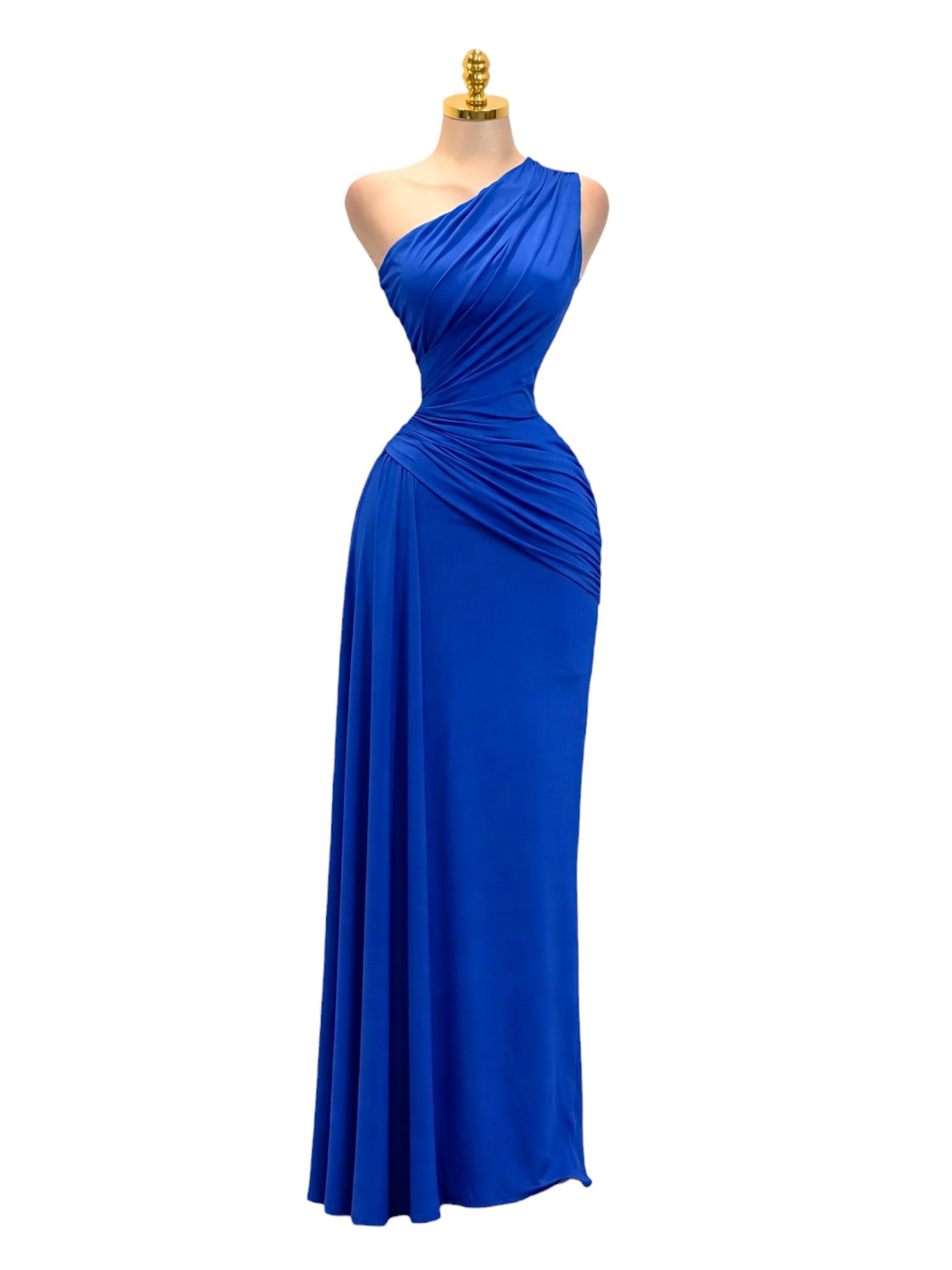 Vestido azul rey largo de un solo hombro con diseño drapeado que estiliza la silueta. Corte entallado en la parte superior y caída fluida en la falda, ideal para un look elegante y sofisticado. Perfecto para eventos formales y ocasiones especiales.