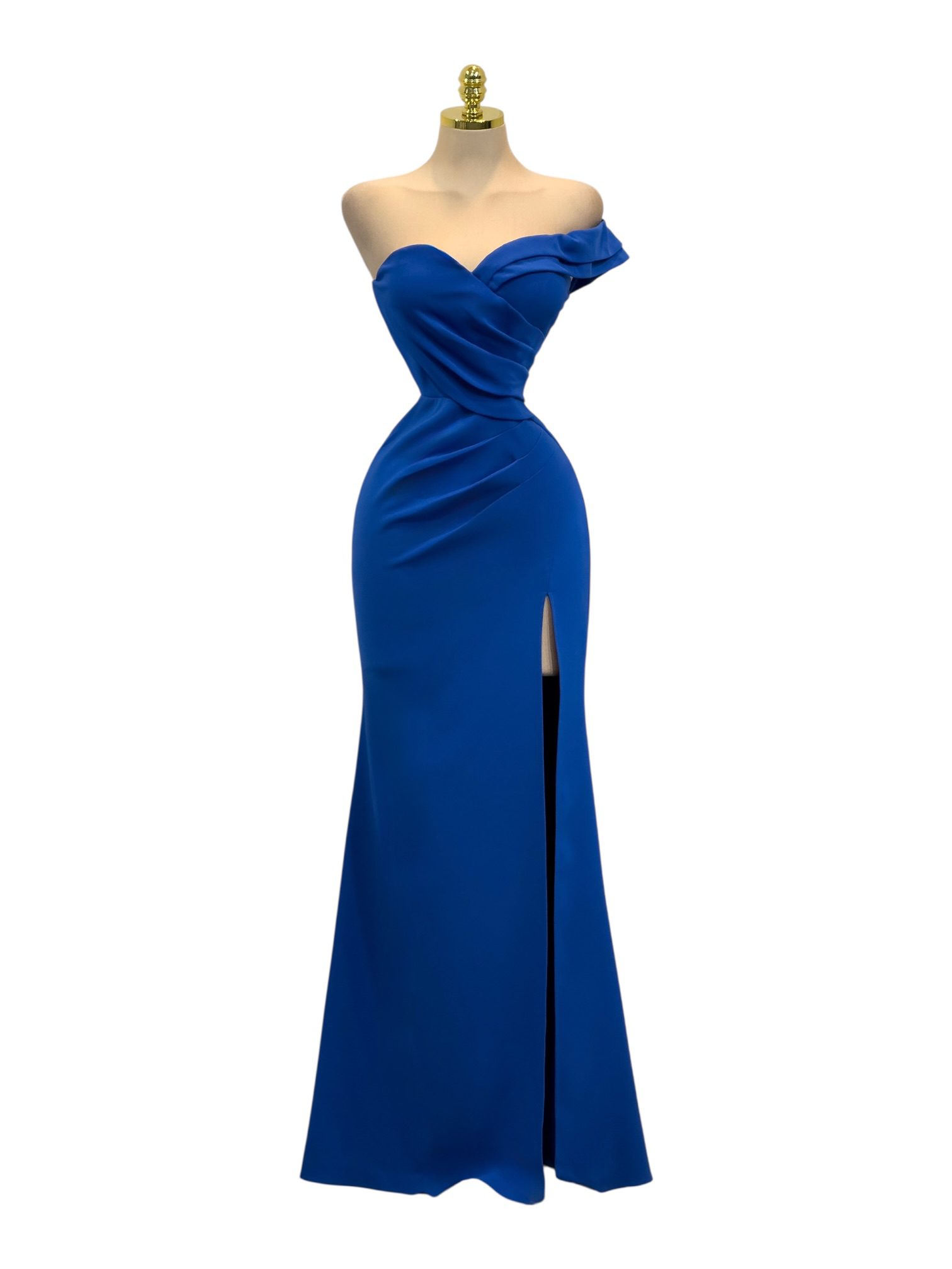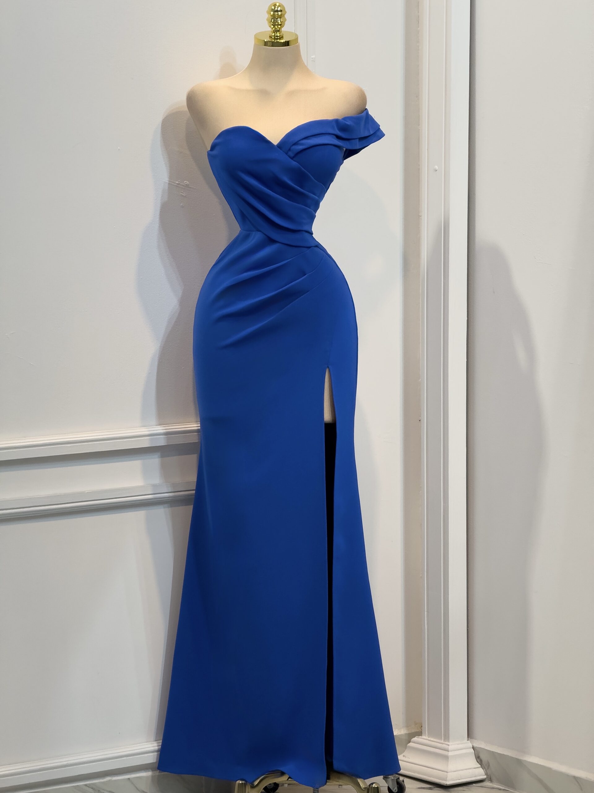 Vestido largo en color azul con escote corazón y diseño asimétrico de un solo hombro con detalle de volante. Presenta drapeado en el torso que estiliza la silueta y falda de corte recto con abertura lateral que aporta movimiento y elegancia. Ideal para eventos formales o celebraciones especiales.
