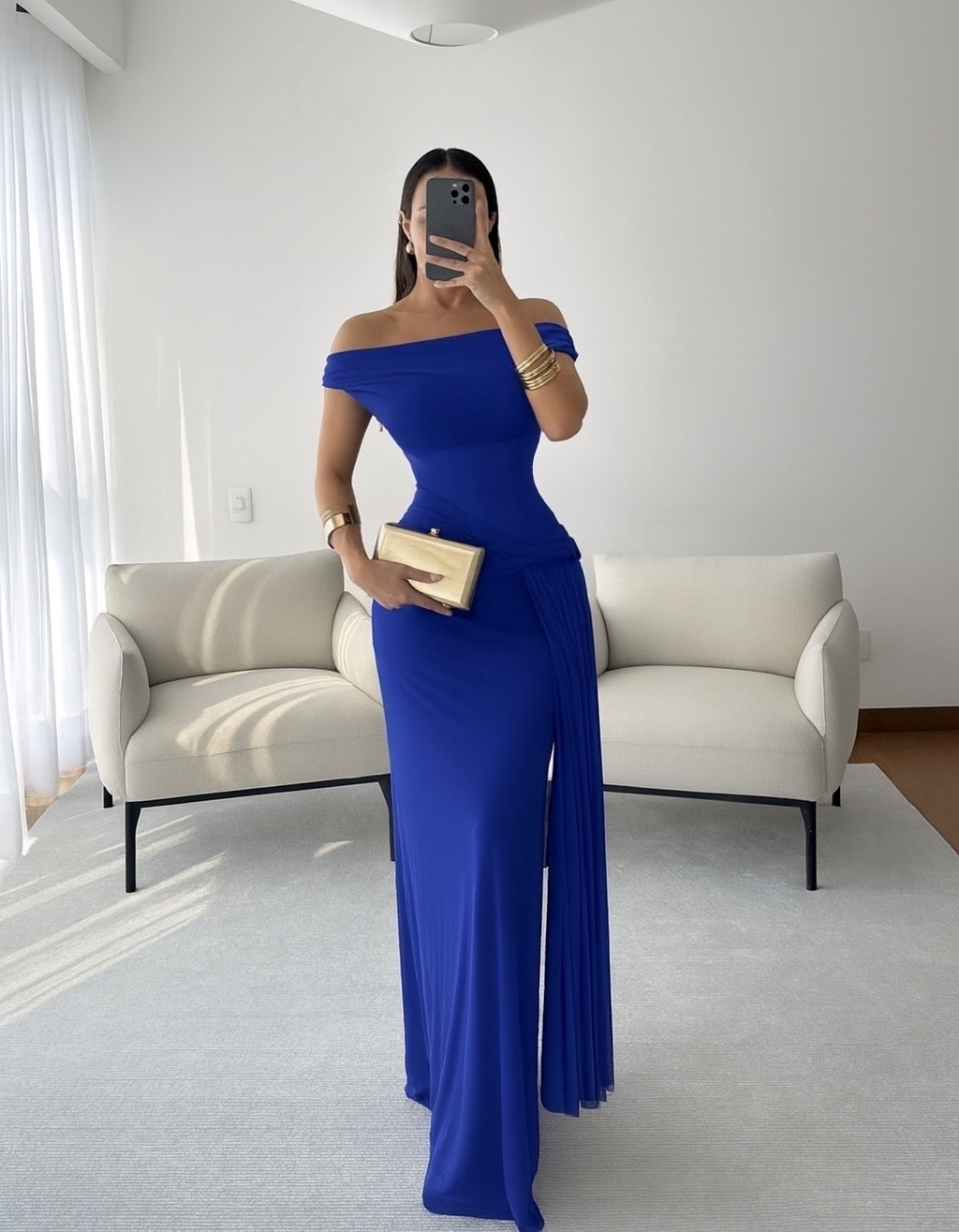 Vestido largo en tono azul rey con escote off shoulder que realza los hombros y aporta un aire elegante y sofisticado. Presenta silueta entallada que define la figura y abertura lateral en la falda que añade un toque sensual y moderno. Un diseño refinado y femenino, ideal para galas, recepciones o eventos de noche donde busques destacar con un look imponente y distinguido.