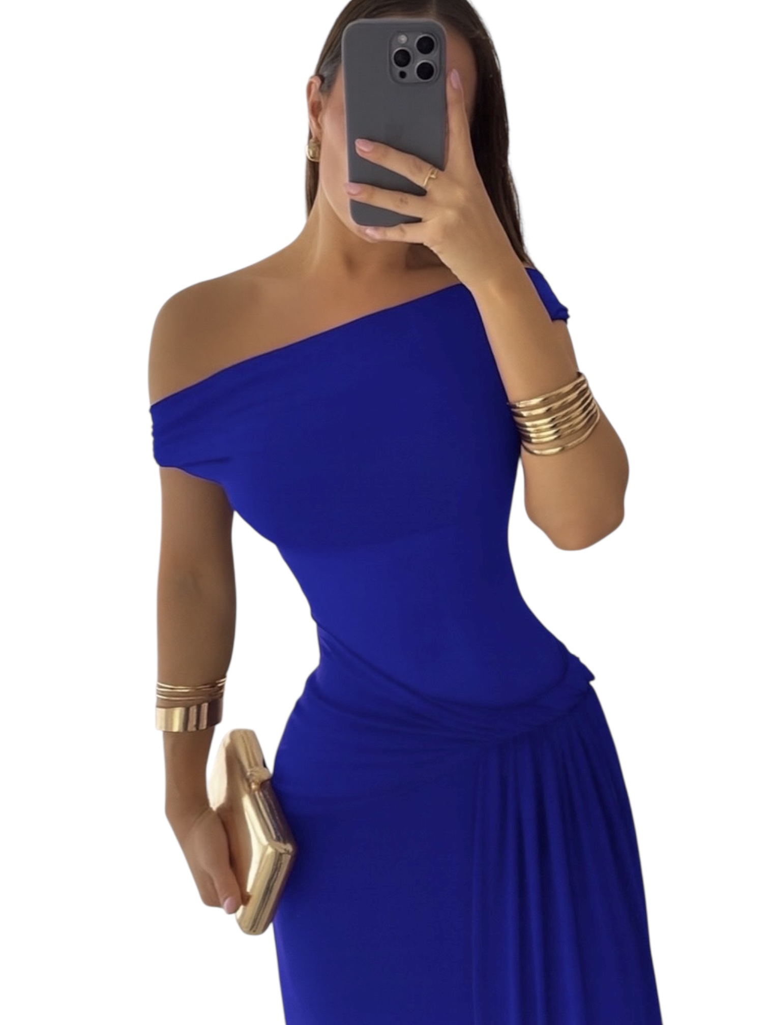VESTIDO: LARGO AZUL REY OFF SHOULDER CON ABERTURA