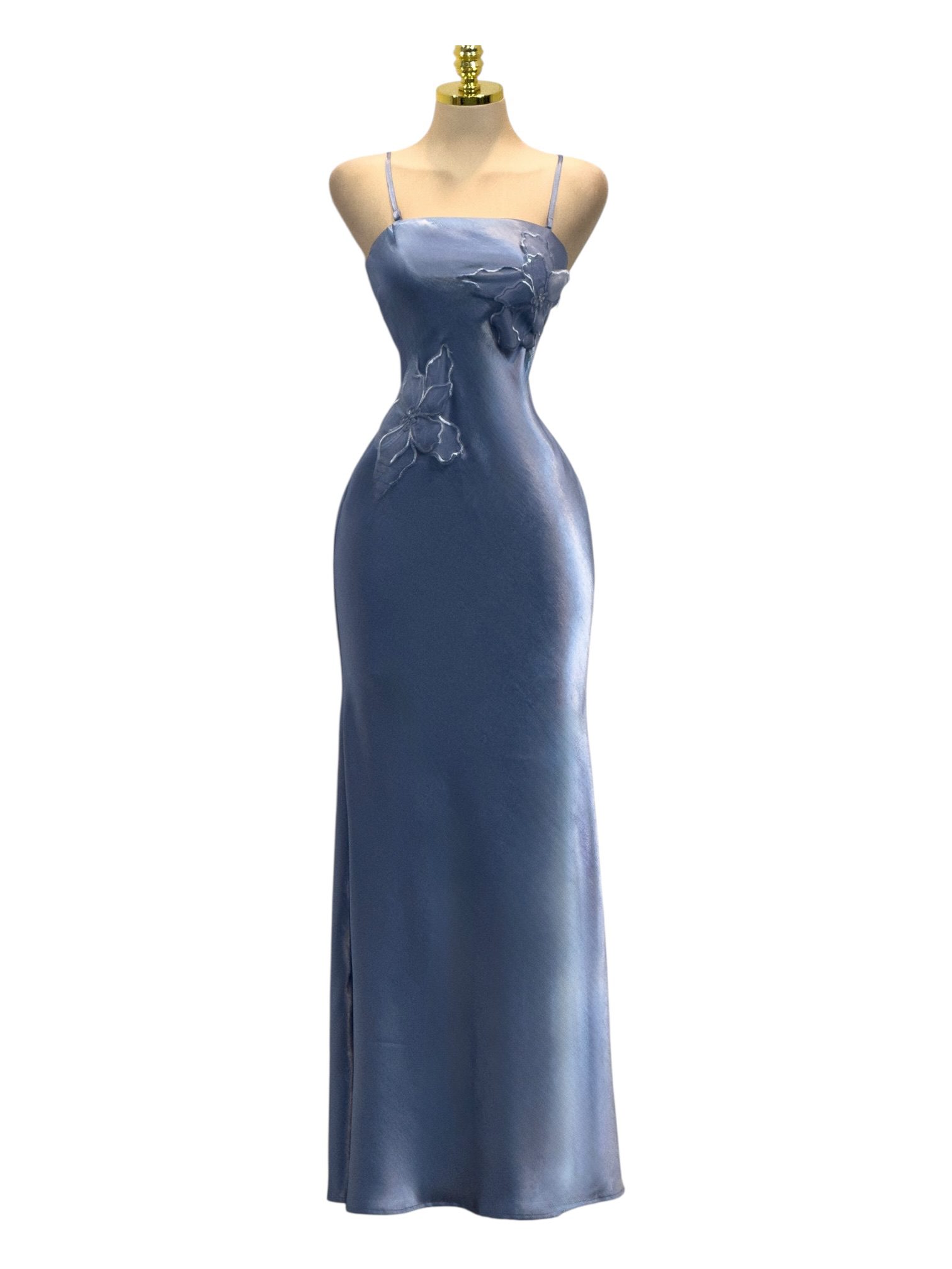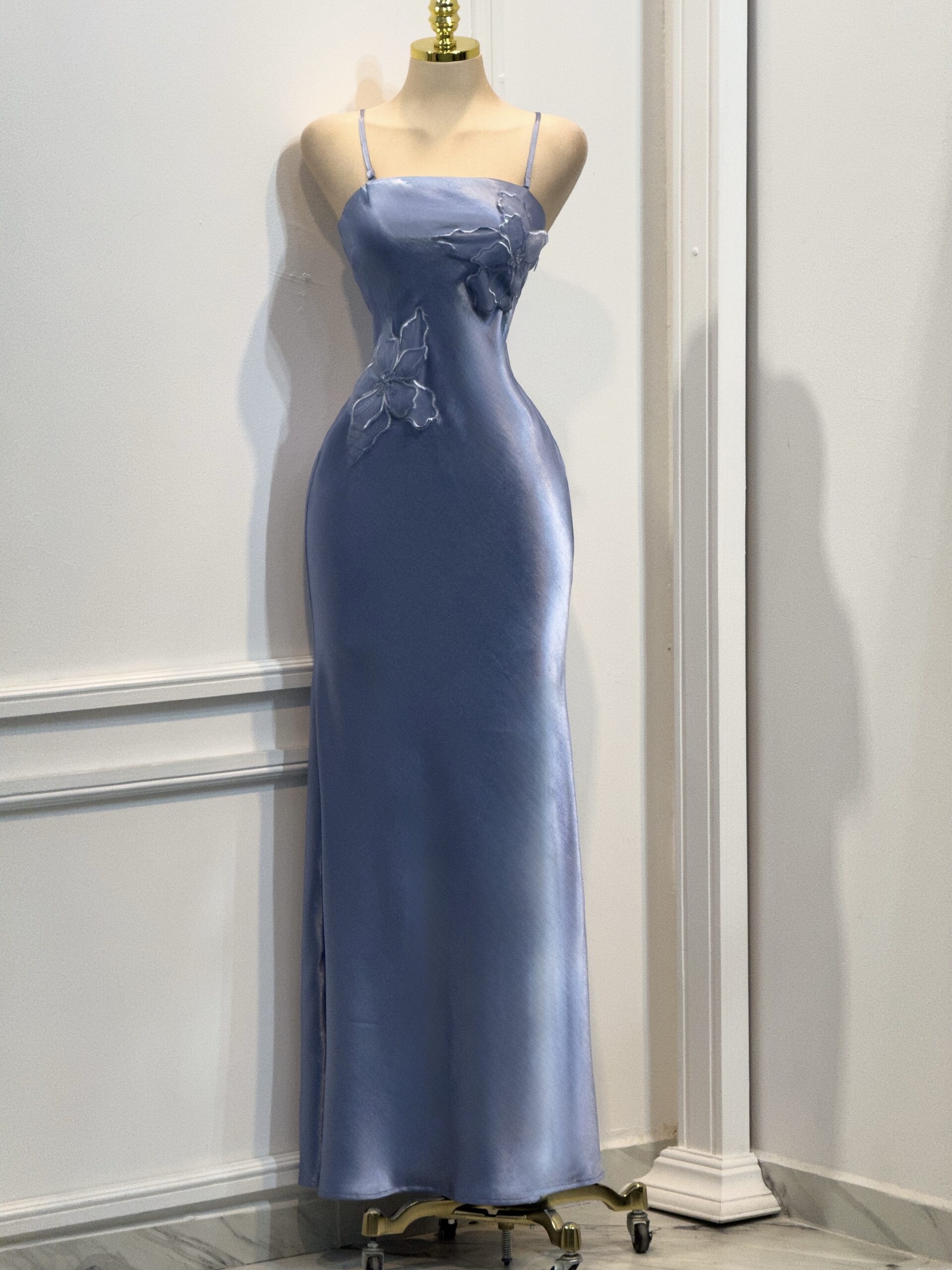 Vestido largo en tono azul satinado con tirantes delgados y silueta ajustada. Presenta delicadas aplicaciones florales que aportan un toque elegante y femenino. Ideal para eventos formales o de noche.