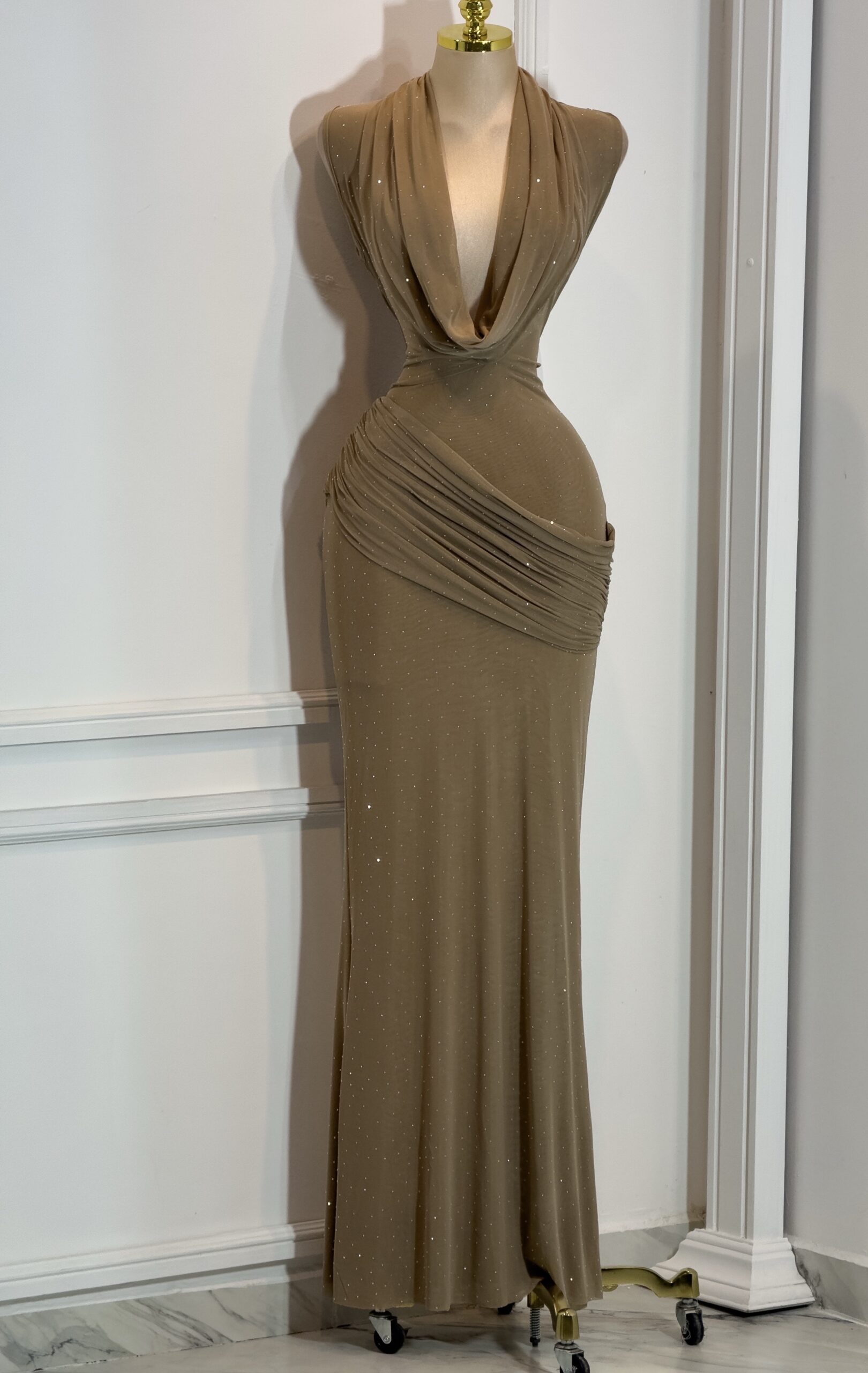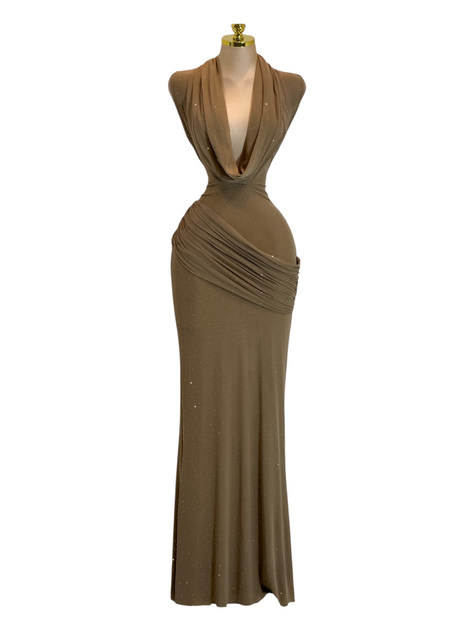 Vestido largo en tono beige con acabado ligeramente brillante. Presenta escote profundo tipo drapeado y fruncido lateral que estiliza la figura. Corte ajustado que realza la silueta con caída fluida. Ideal para eventos formales y noches especiales.