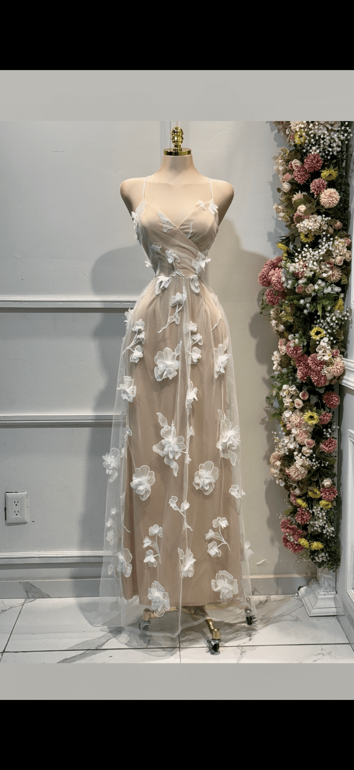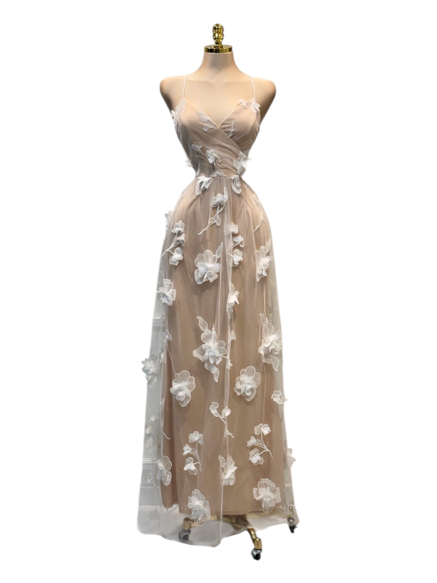 Vestido largo sin tirantes con falda amplia y capa de tul transparente. Bordados florales en relieve que aportan un estilo romántico y elegante, ideal para eventos formales o sesiones especiales.