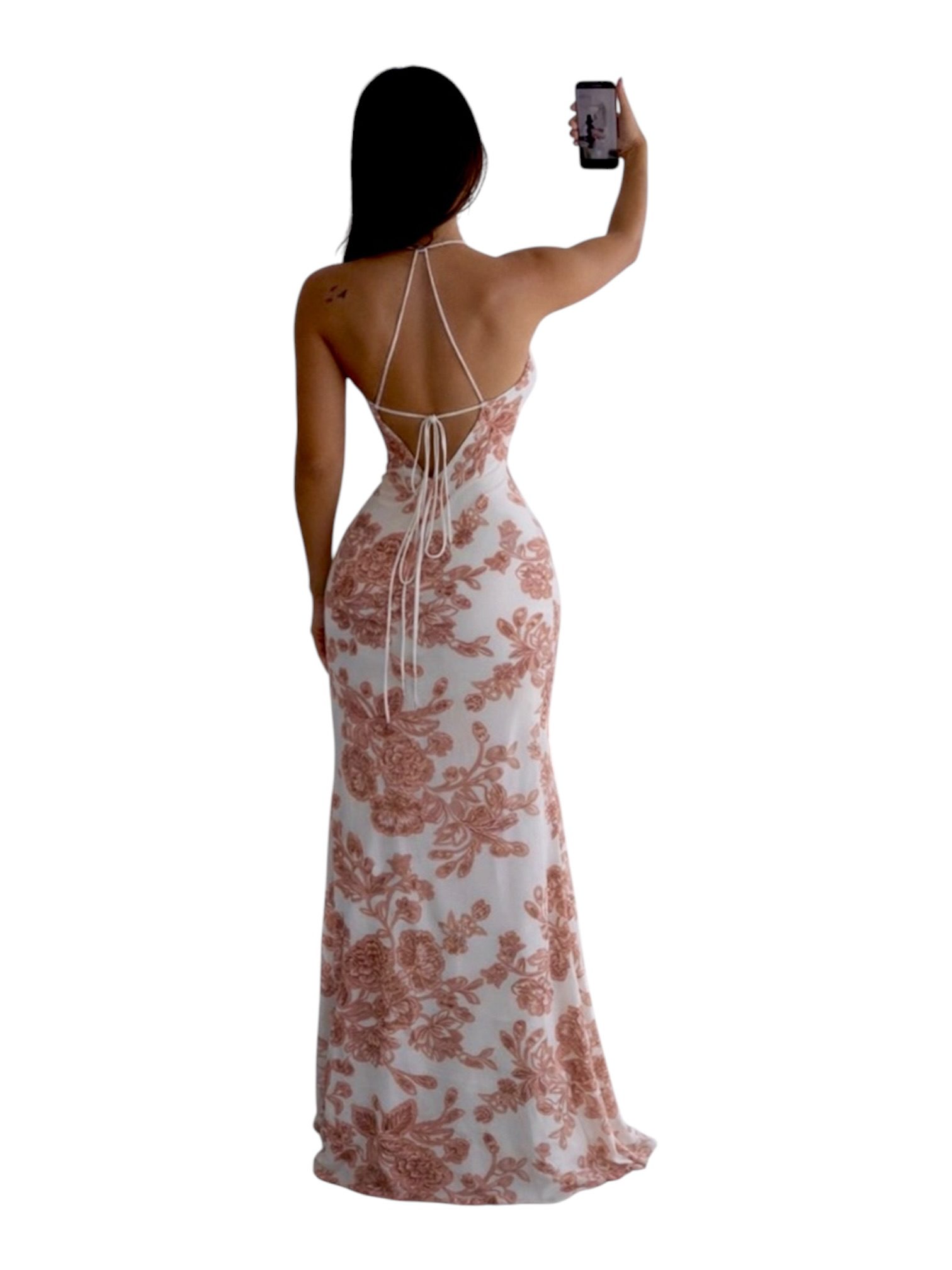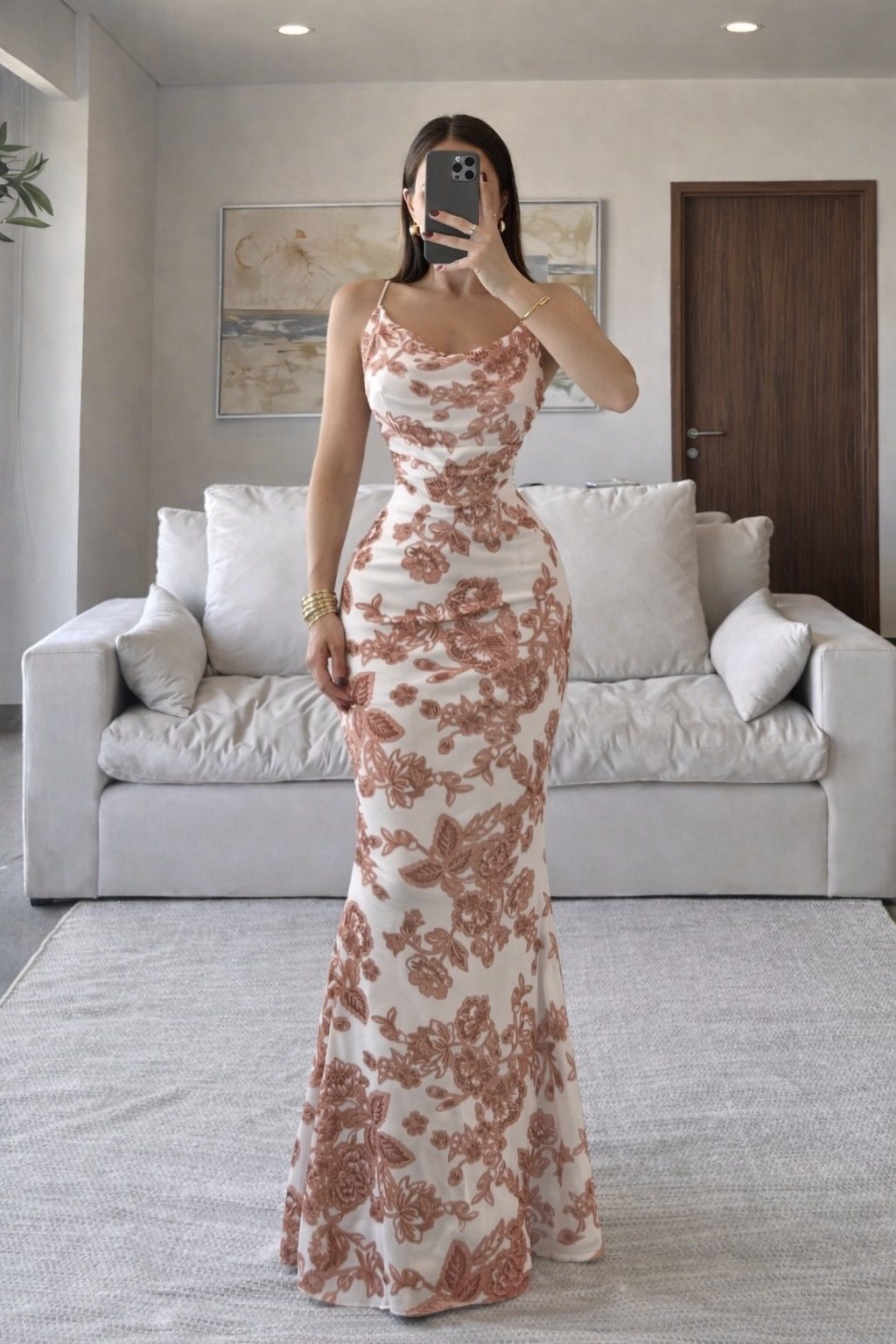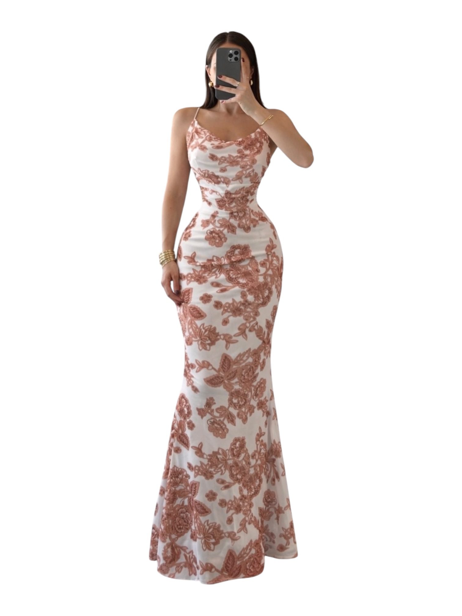 Vestido largo con estampado floral en tono blanco, tirantes delgados y escote ligeramente drapeado. Diseño entallado que realza la silueta con caída tipo sirena. Ideal para eventos formales o de noche.