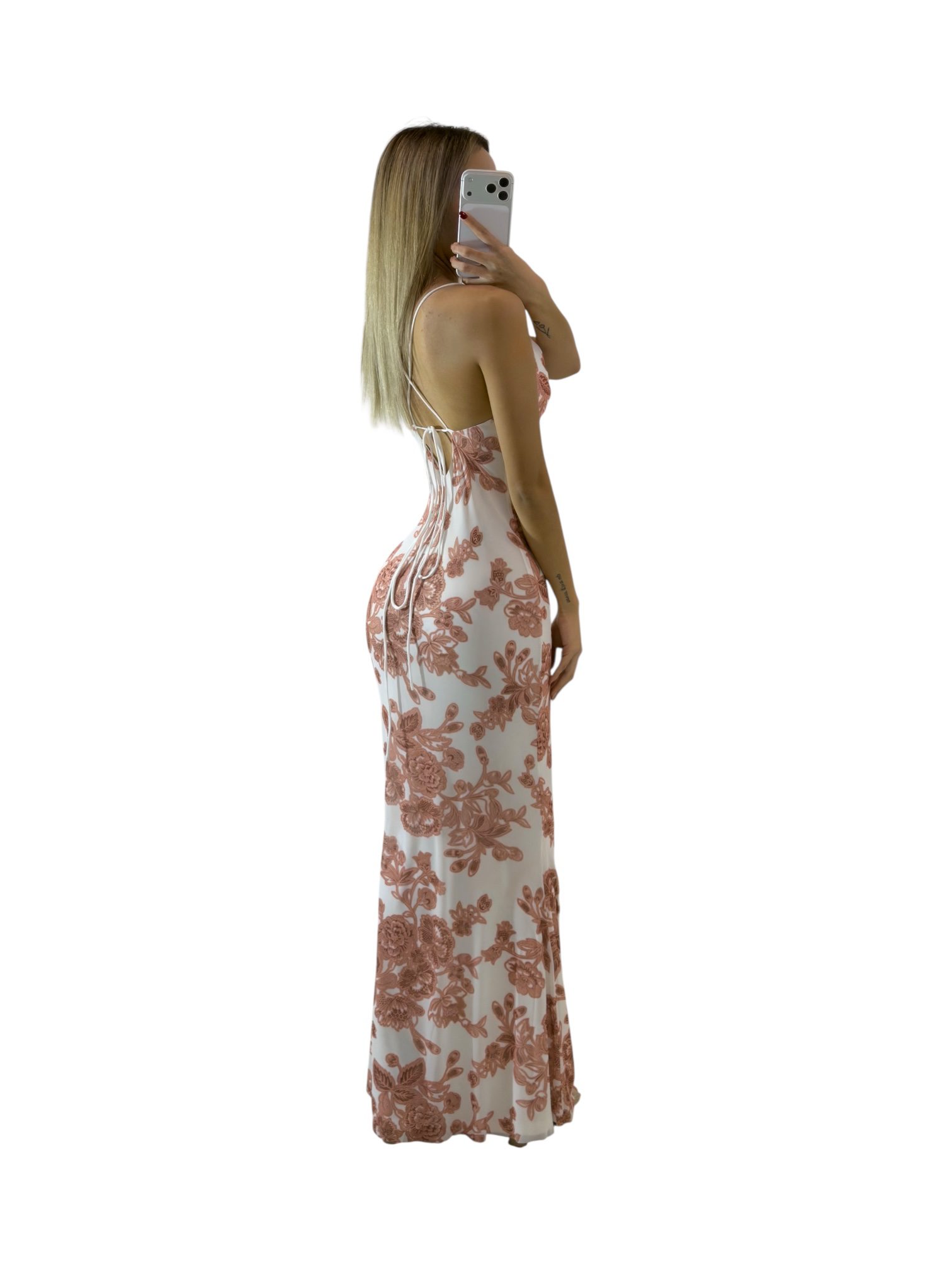 Vestido largo en tono blanco con estampado floral en contraste. Tirantes delgados y escote suave con corte ajustado que realza la silueta. Ideal para bodas de día y eventos especiales.