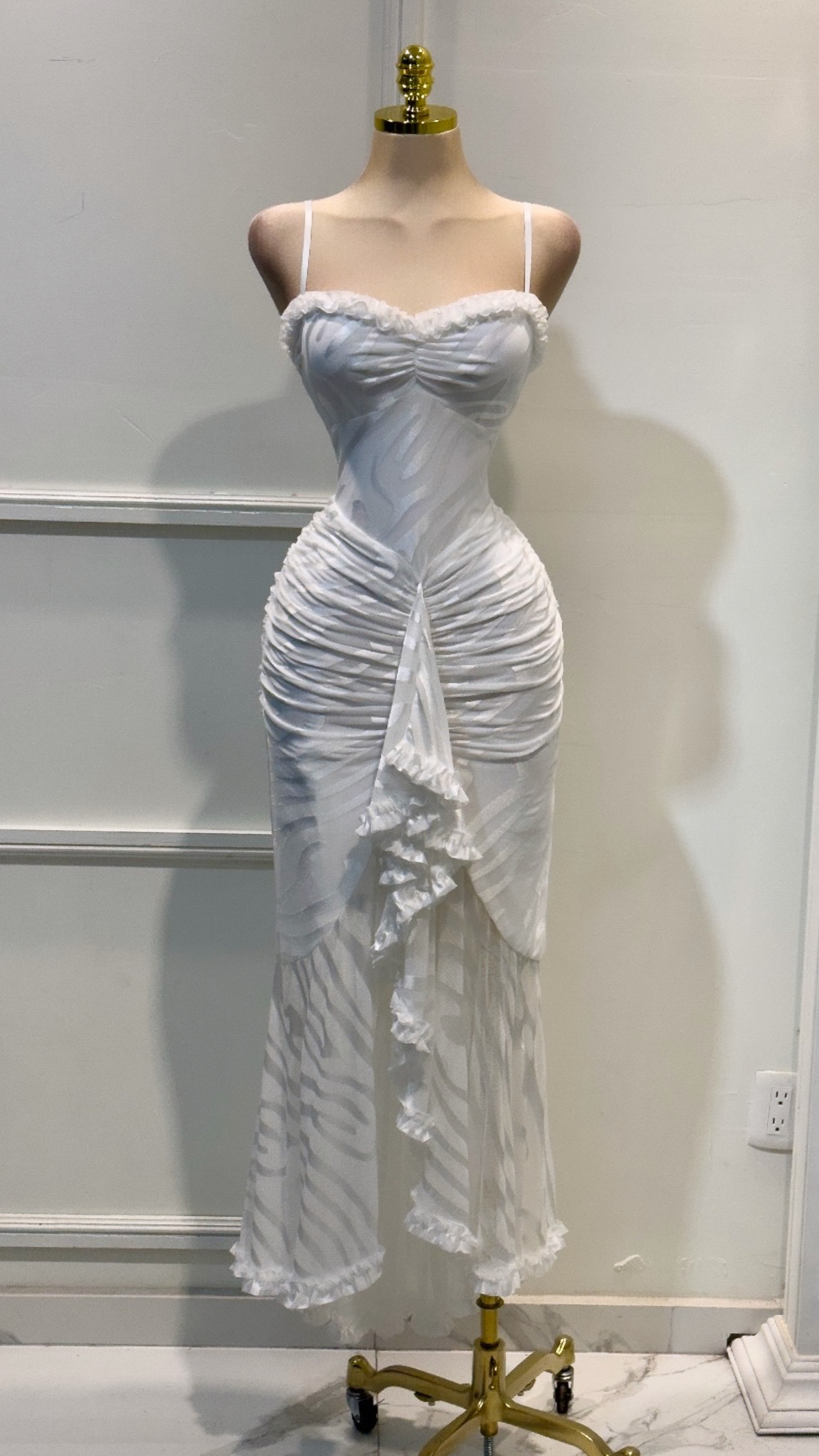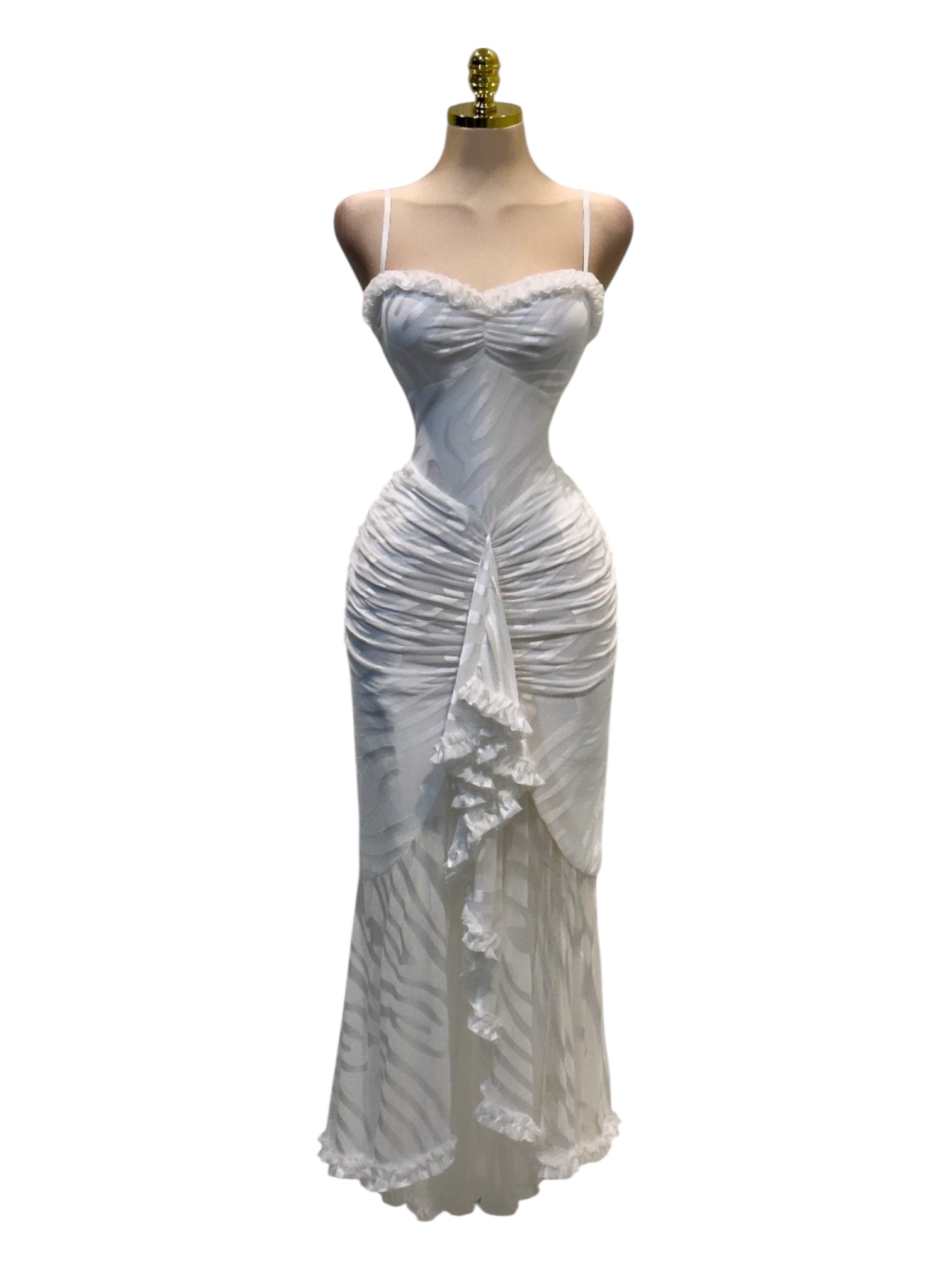 Vestido largo en color blanco con escote en forma de corazón que realza el busto con delicadeza. Su confección fruncida en el torso y la cadera estiliza la figura y define las curvas, mientras el detalle central en la falda aporta un toque sofisticado y elegante. La caída fluida completa el diseño, convirtiéndolo en una prenda ideal para bodas, recepciones o eventos formales donde quieras destacar con un look romántico y refinado.