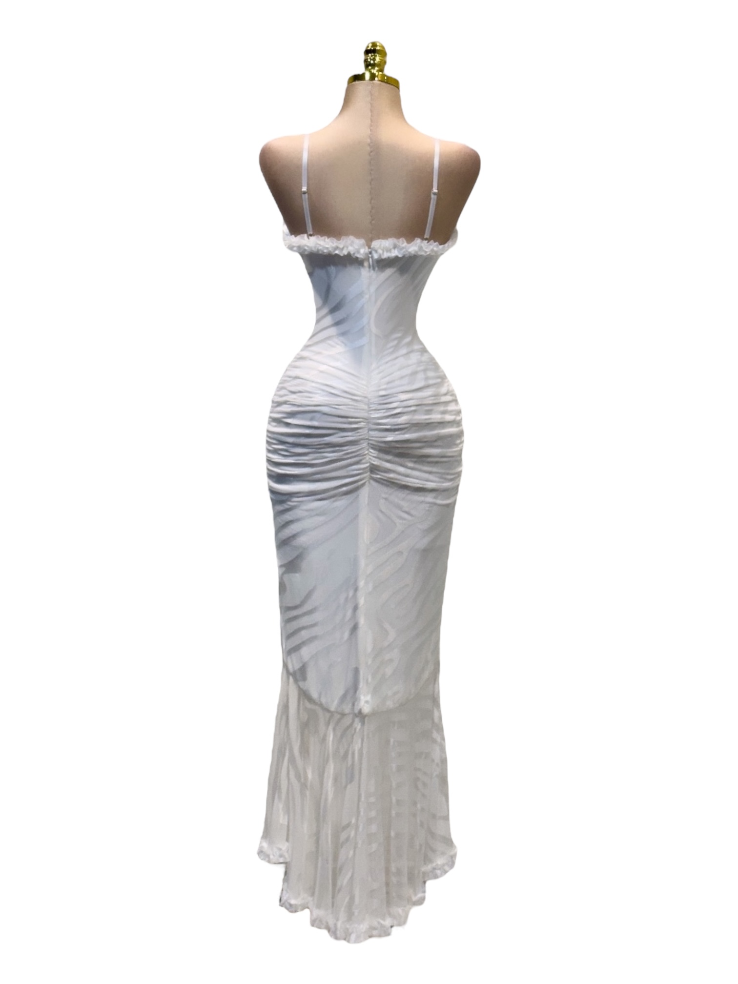 VESTIDO: LARGO BLANCO CON ESCOTE CORAZÓN Y DISEÑO FRUNCIDO
